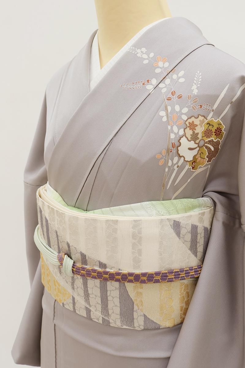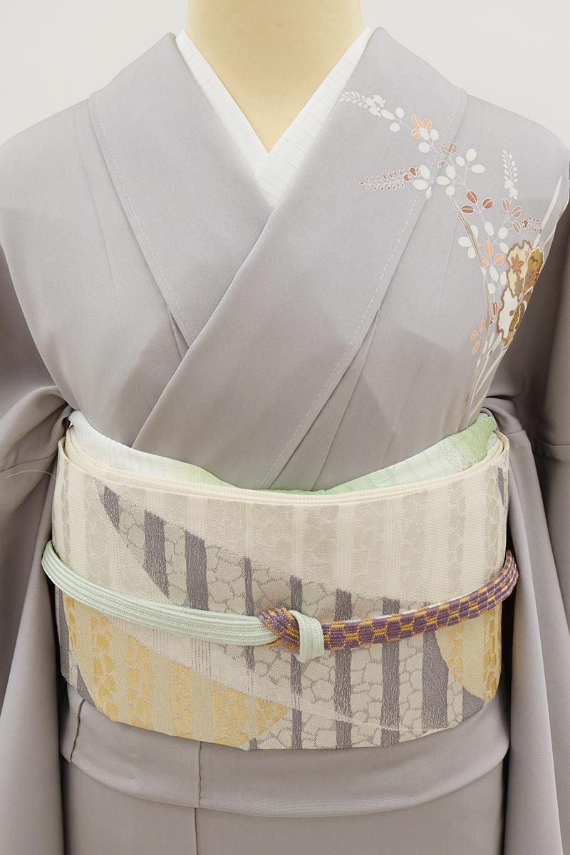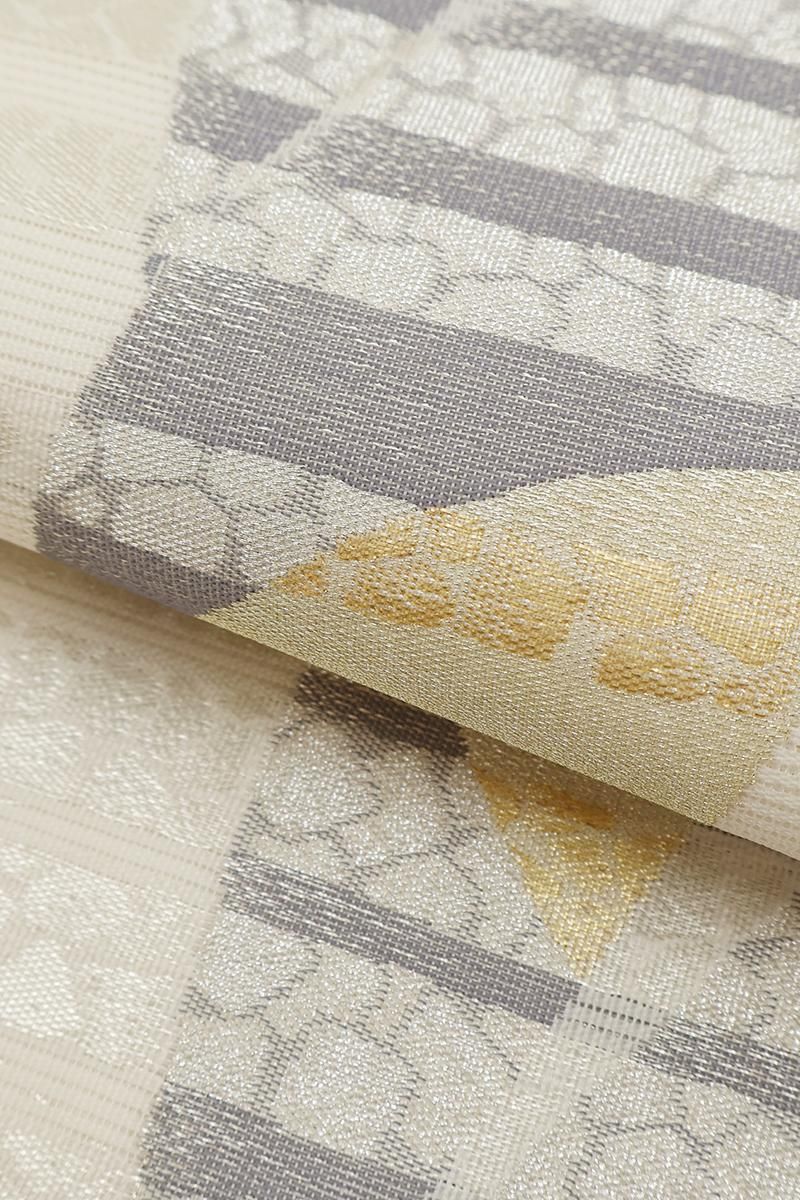 透け感ゆたかな地風に、程よい金銀のアクセントを加えたシンプルな柄行きがすっきりと着姿を引き締めるお品、モダンにも古典的にも、合わせるお着物を選ばず重宝にお使い頂けそうですね。色無地や付下げ、訪問着など様々なお着物に合わせて夏のお呼ばれにいかがでしょうか。
