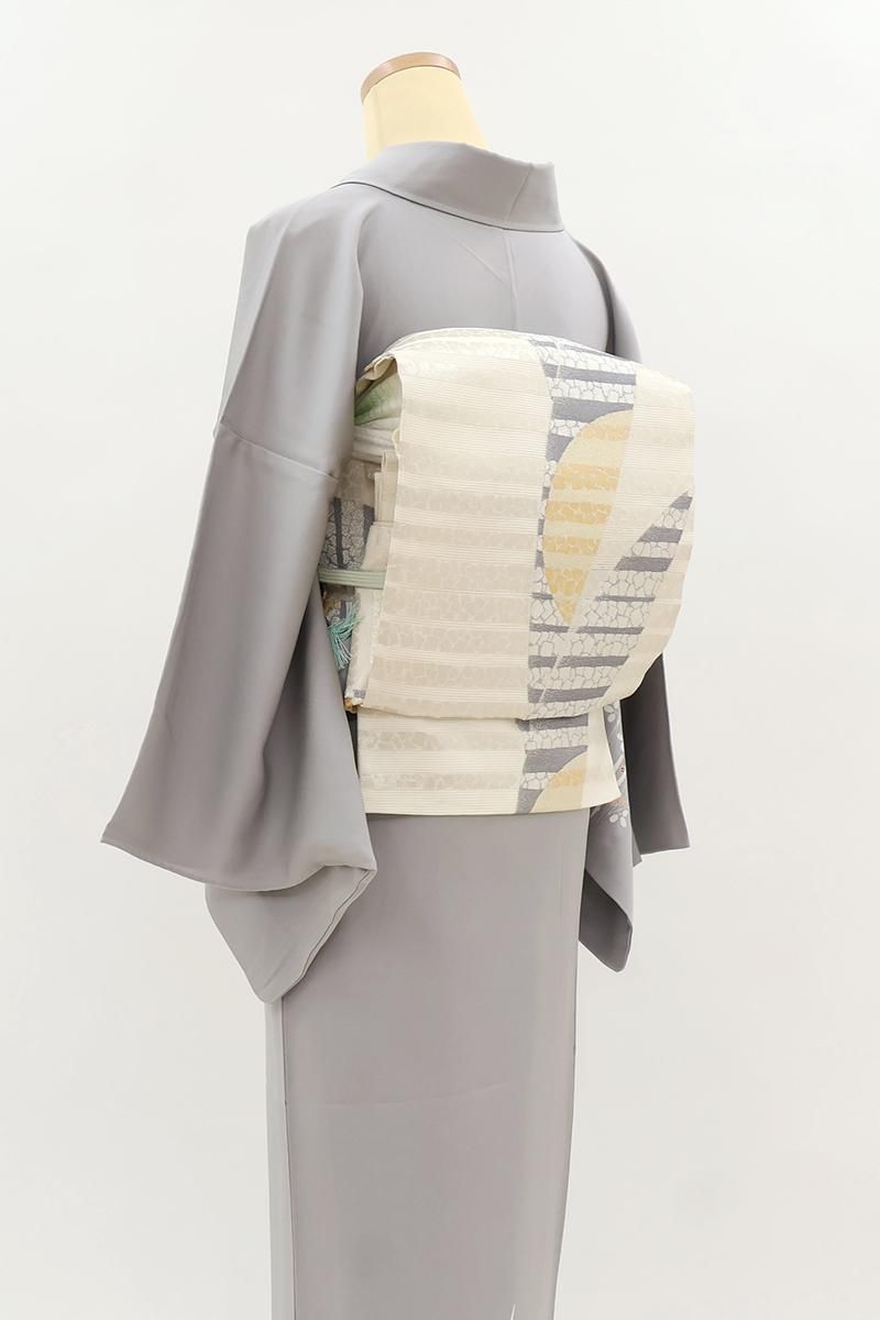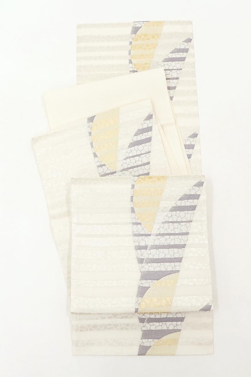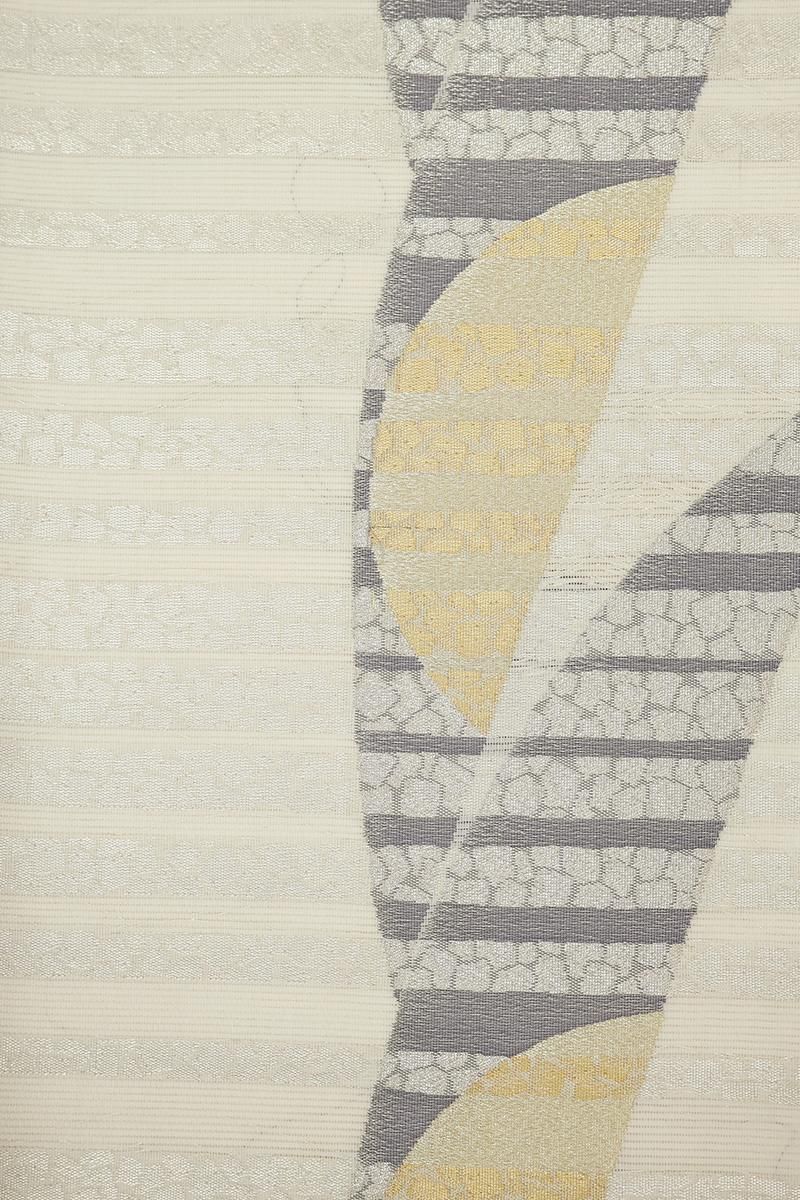清々しい白色の地に横段を配し、重ねて半円のような抽象文を織り出した絽の袋帯です。