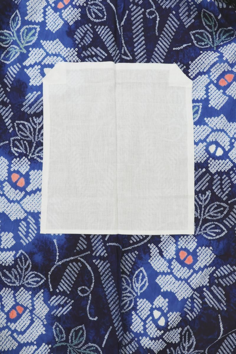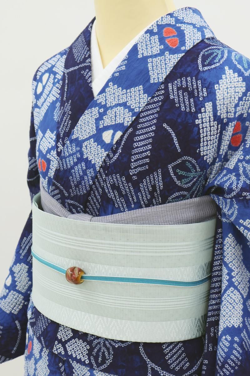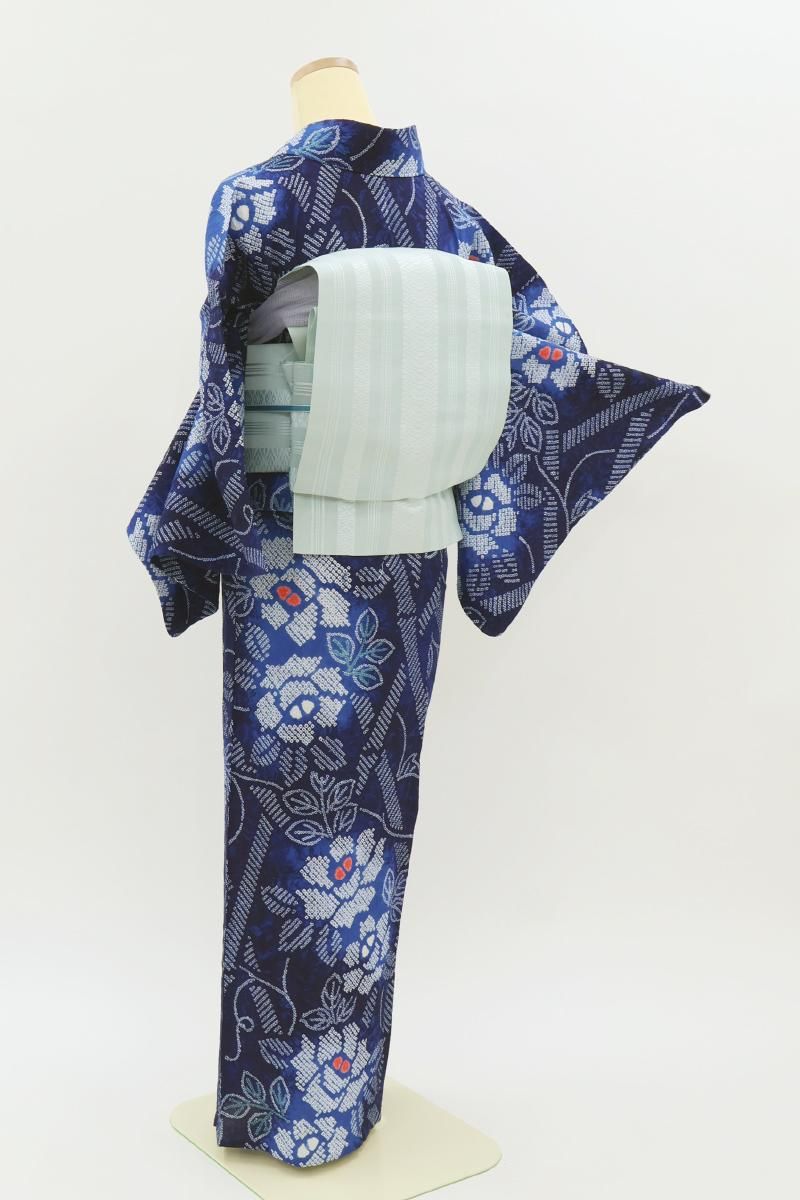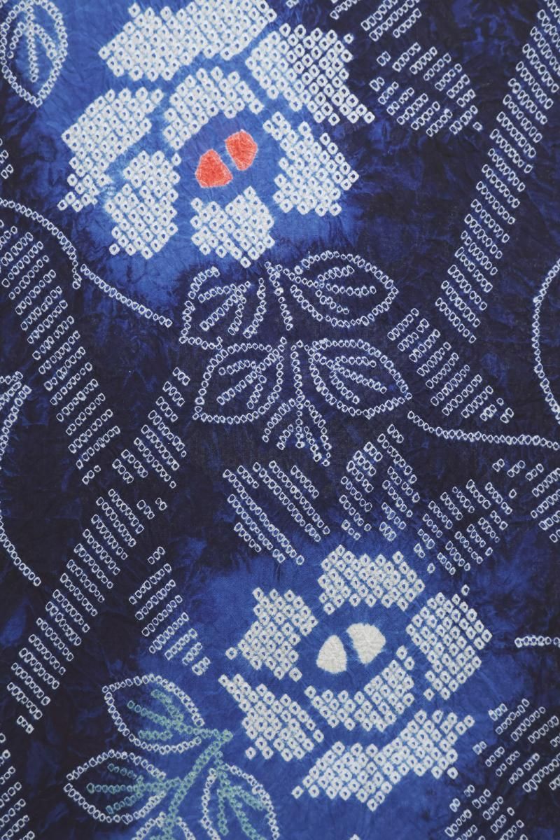 全体の印象としては群青色が近いでしょうか、深い紺色の地のところどころに鮮やかな青を効かせて竹垣に花の図を絞り染めで配した浴衣です。