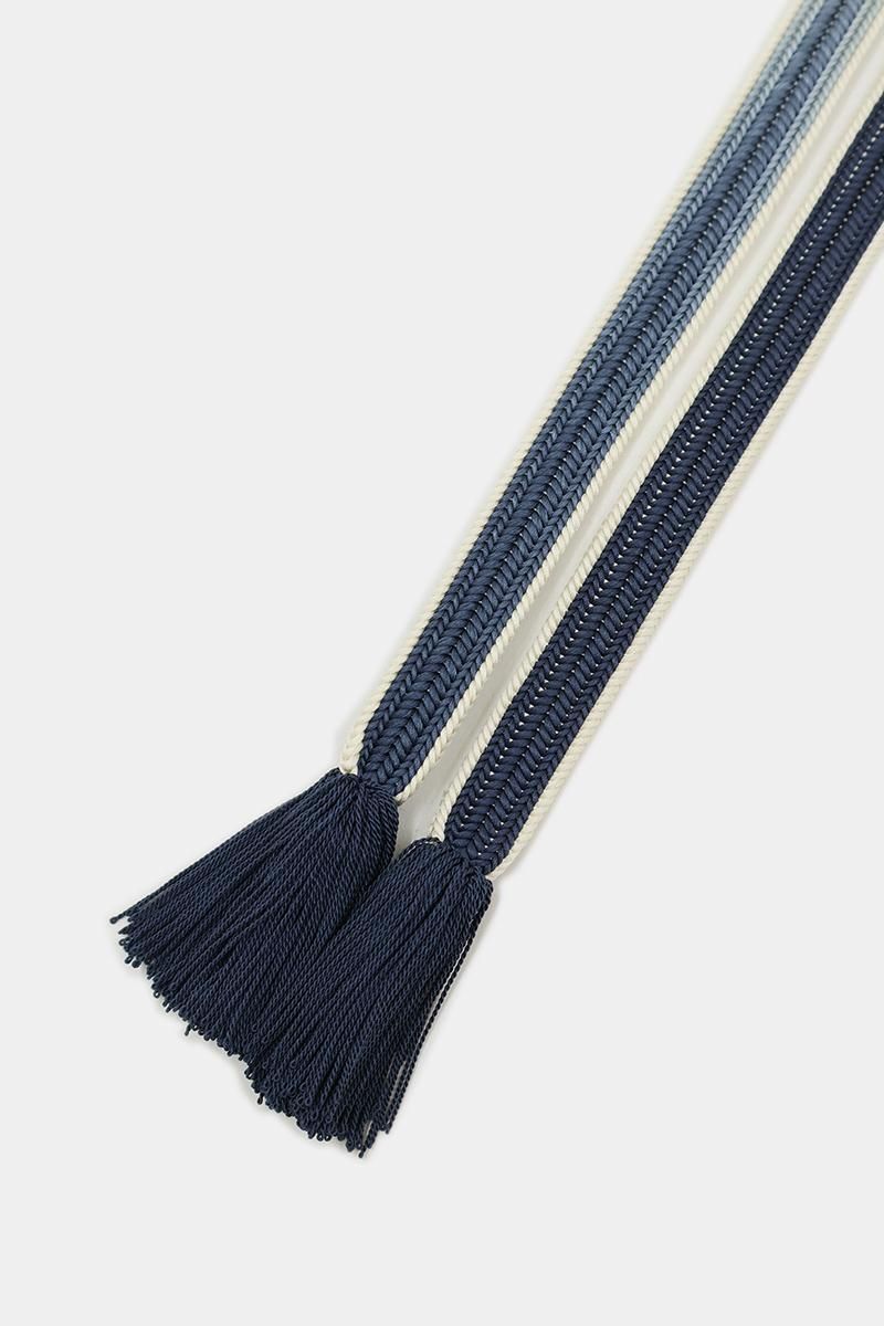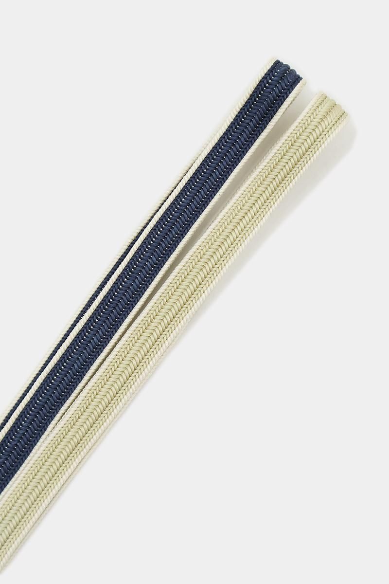 半衿や帯締めなど、きものまわりの小物の老舗として定評ある京都・衿秀製の帯締めです。こちらは落ち着いた紺色と緑みのベージュのグラデーションをアイボリーの糸で縁取った綾竹組のお品、程よい渋みを含んだシックなお色目が、装いを穏やかに引き締めてくれそうですね。金糸等は入っておりませんが程良いボリュームがありますので、袋帯に合わせて頂いても美しく映えることと思います。しなやかで安定感のある締め心地の良さに加え、衿秀さんの房はからまったり縮れてしまったりの心配のない撚り房ですので、保管の際も安心ですね。この機会にぜひ、お手元にてご覧下さいませ。