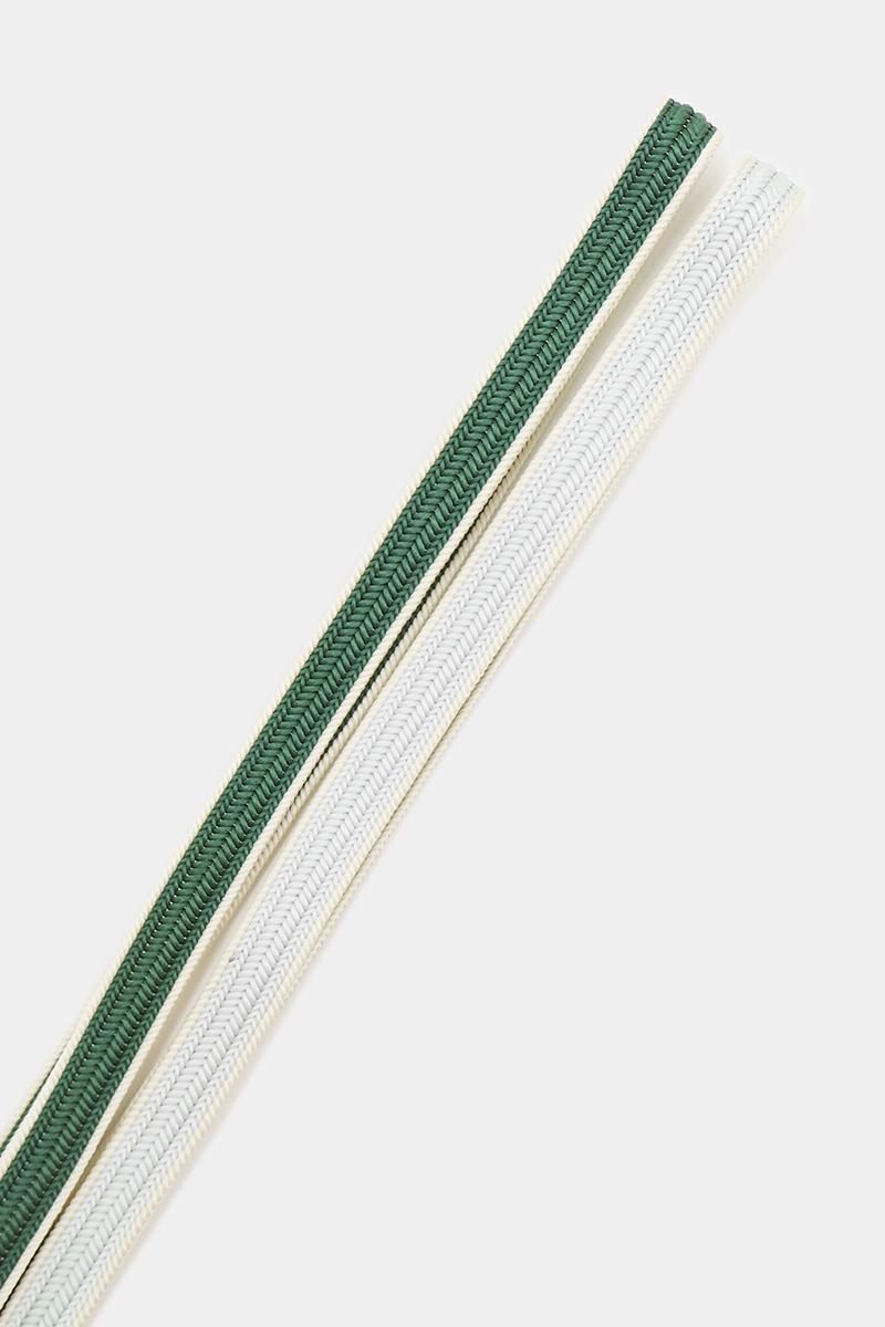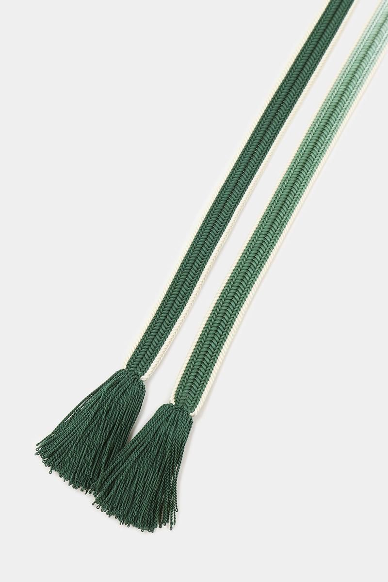 半衿や帯締めなど、きものまわりの小物の老舗として定評ある京都・衿秀製の帯締めです。こちらは落ち着いた緑色とごく淡い水色のグラデーションをアイボリーの糸で縁取った綾竹組のお品、程よい渋みを含んだシックなお色目が、装いを穏やかに引き締めてくれそうですね。金糸等は入っておりませんが程良いボリュームがありますので、袋帯に合わせて頂いても美しく映えることと思います。しなやかで安定感のある締め心地の良さに加え、衿秀さんの房はからまったり縮れてしまったりの心配のない撚り房ですので、保管の際も安心ですね。この機会にぜひ、お手元にてご覧下さいませ。
