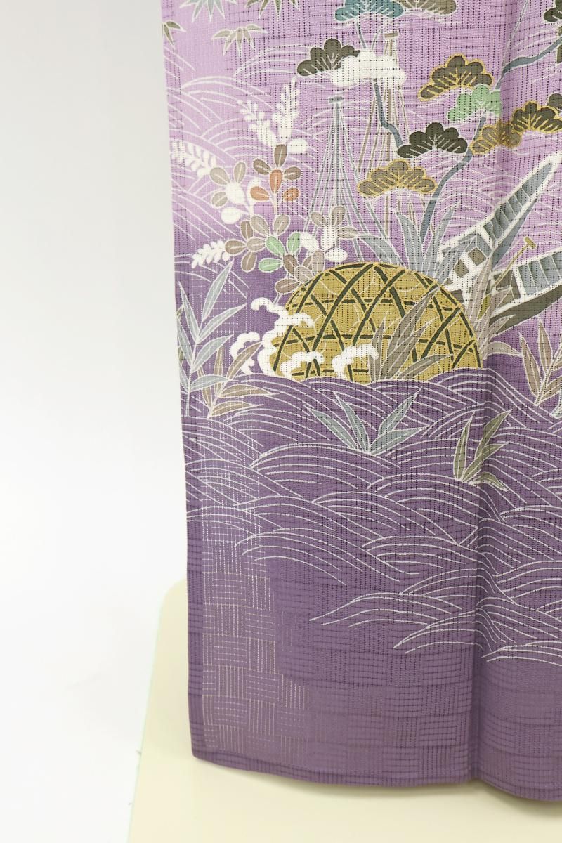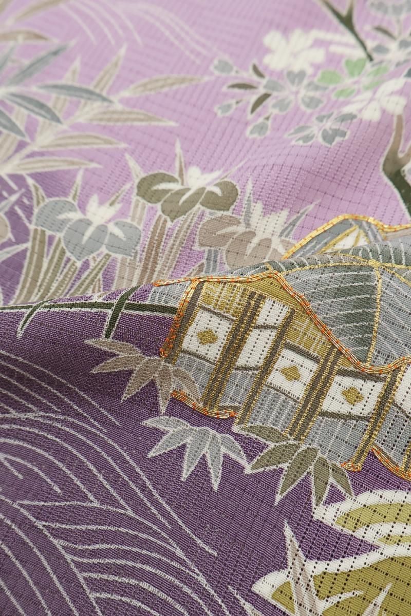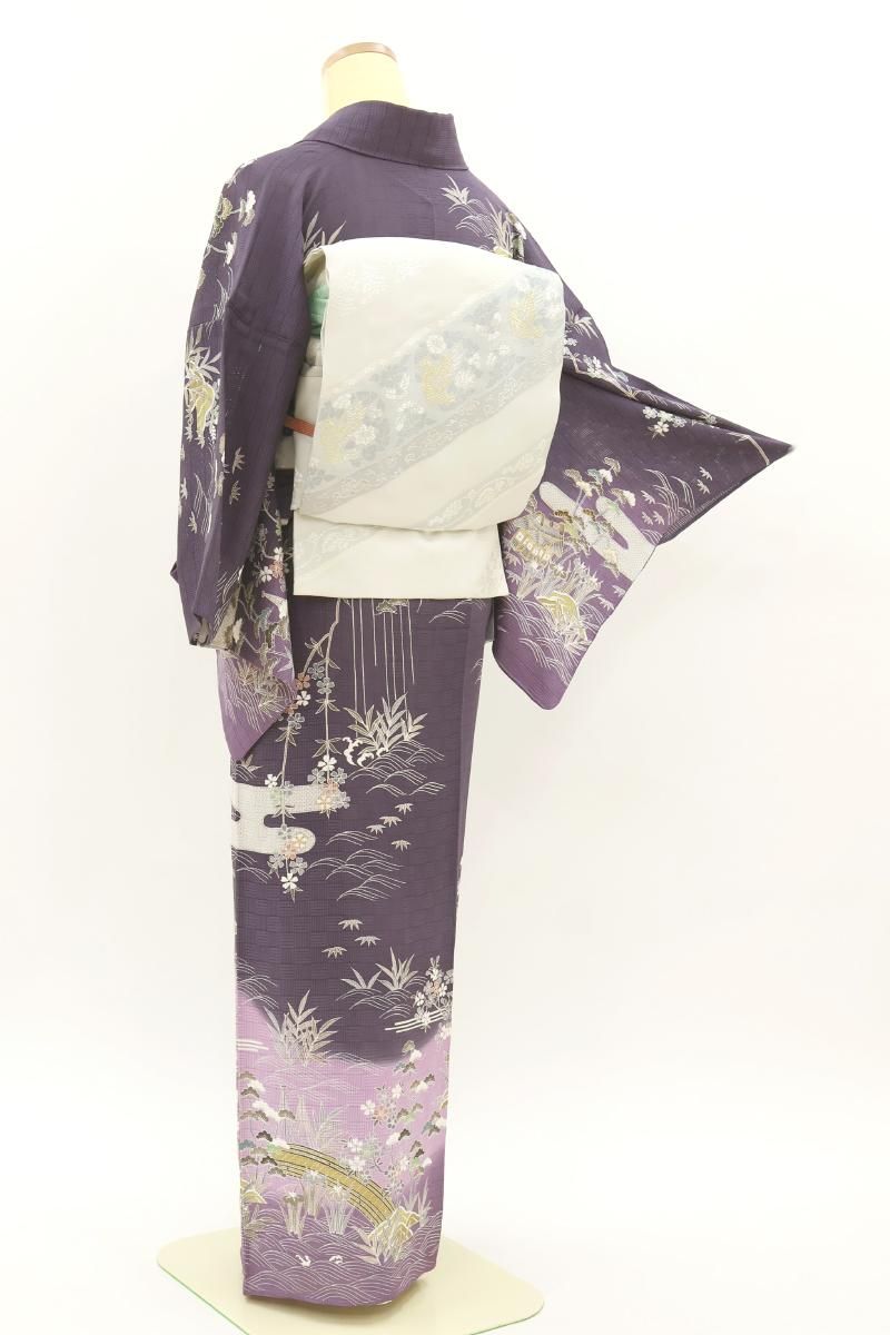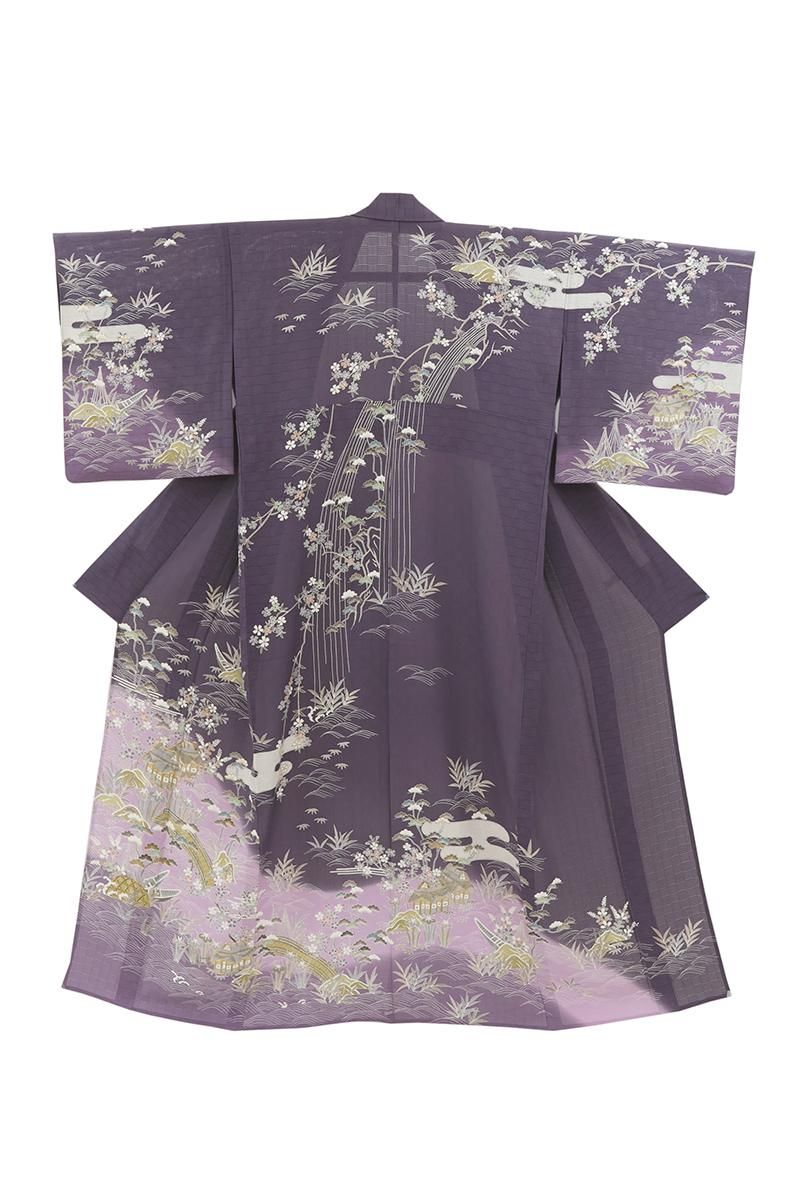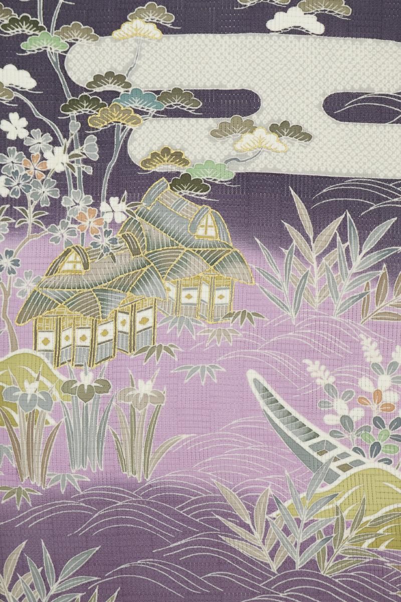 しっとりと落ち着いたお色目に、金駒刺繍などを添えて細やかな筆致で表現された典雅な景色に大人の女性らしい風格と華やぎが香るお品、上品な存在感のある優美な一枚は、夏の改まった場面の装いに重宝いただけそうですね。パーティやお祝いのお席などの装いにいかがでしょうか。