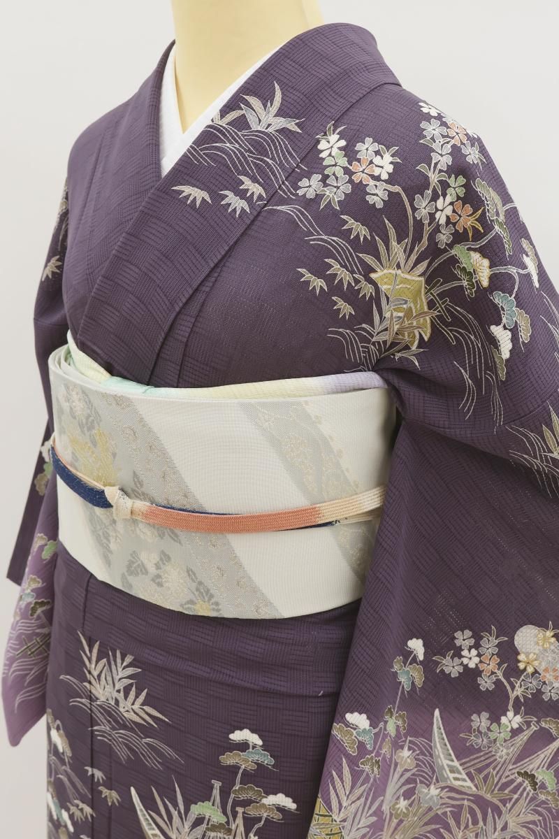 葡萄色が近いでしょうか、竪横交互に絽目を配した深い灰紫色の地に、裾と袖に共薄の暈しをゆったりと配し、茶屋辻文を描いた訪問着です。