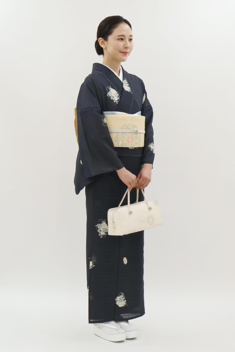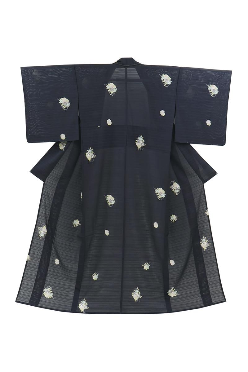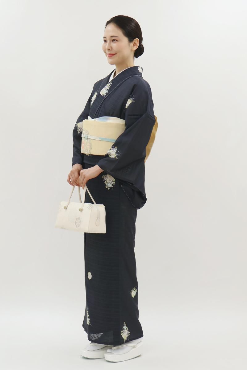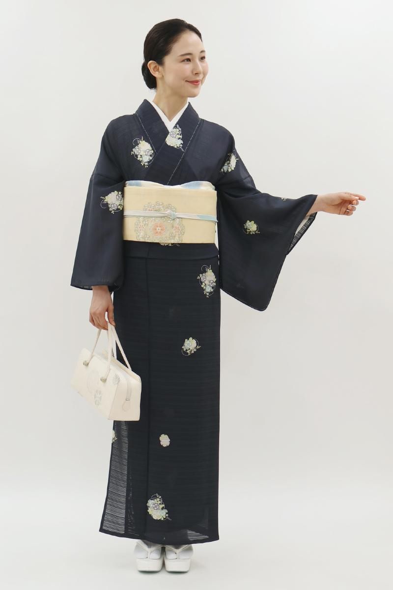 きりりとシックな地色に品良く置かれたモダンな彩りに銀彩のきらめきが涼やかに映えるお品、上品な飛び柄小紋は着る方や年齢を選ぶことなく、気軽な染め帯から軽めの袋帯など幅広い帯合わせでお楽しみいただけることと思います。白い襦袢を透かすことで一層の涼感を運ぶ濃地の一枚、観劇やお食事会、ちょっとした集まりなどにいかがでしょうか。