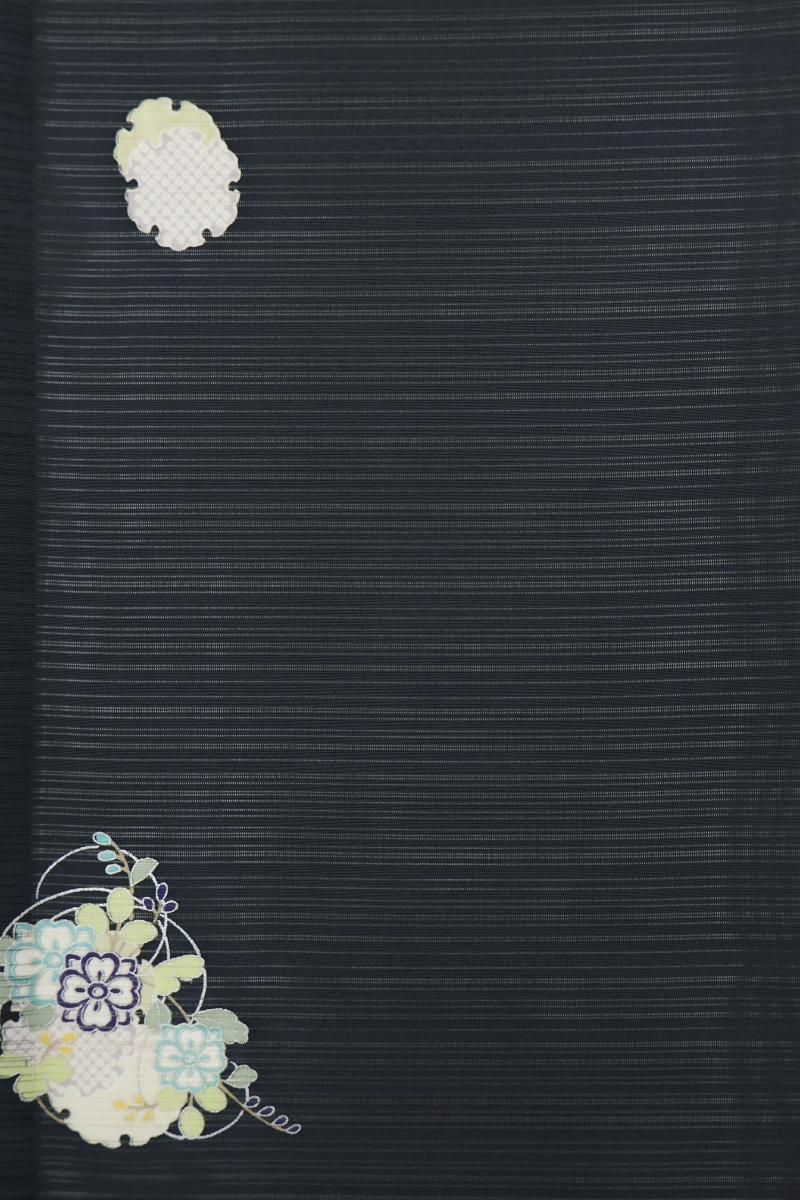 深い灰みの紺色の乱絽地に、花の意匠をあしらった雪輪重ね文を散らした小紋です。
