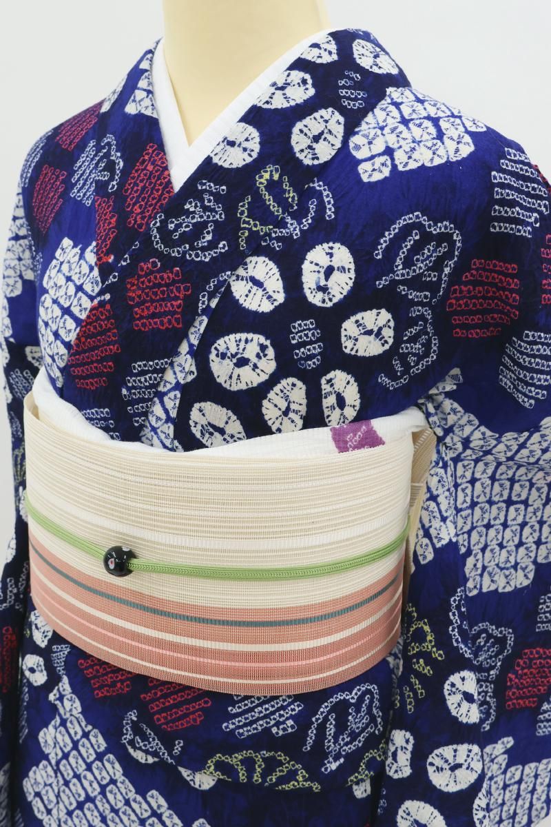 おおらかな絞りの柄ゆきが女性らしく華やかな雰囲気のお品、ふんわりとした薄手の地の風合いは風を通しやすく、軽やかな着心地をお楽しみいただけそうですね。夏の気軽なお出かけやお祭りなどに風情豊かな装いをいかがでしょうか。