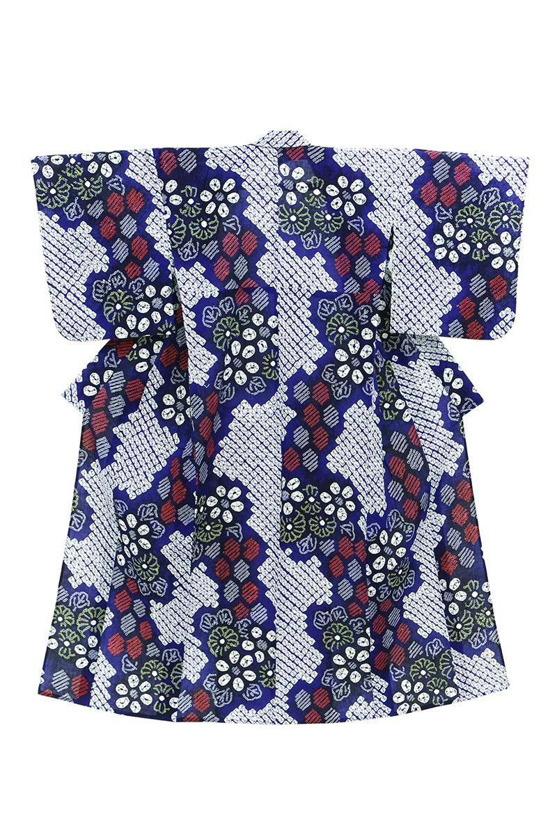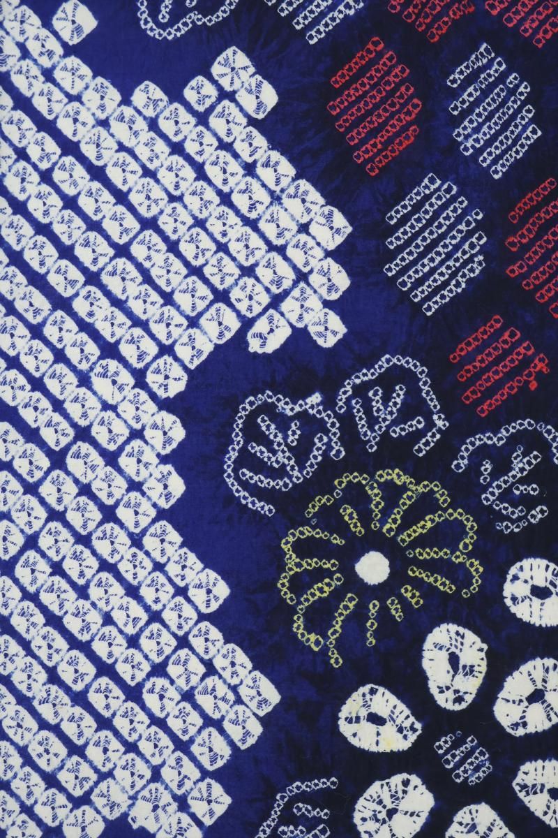 白地に鮮やかな青の濃淡に赤や黄の彩りを添えて、菊花や亀甲をゆったりとした曲線に配した木綿地の浴衣です。