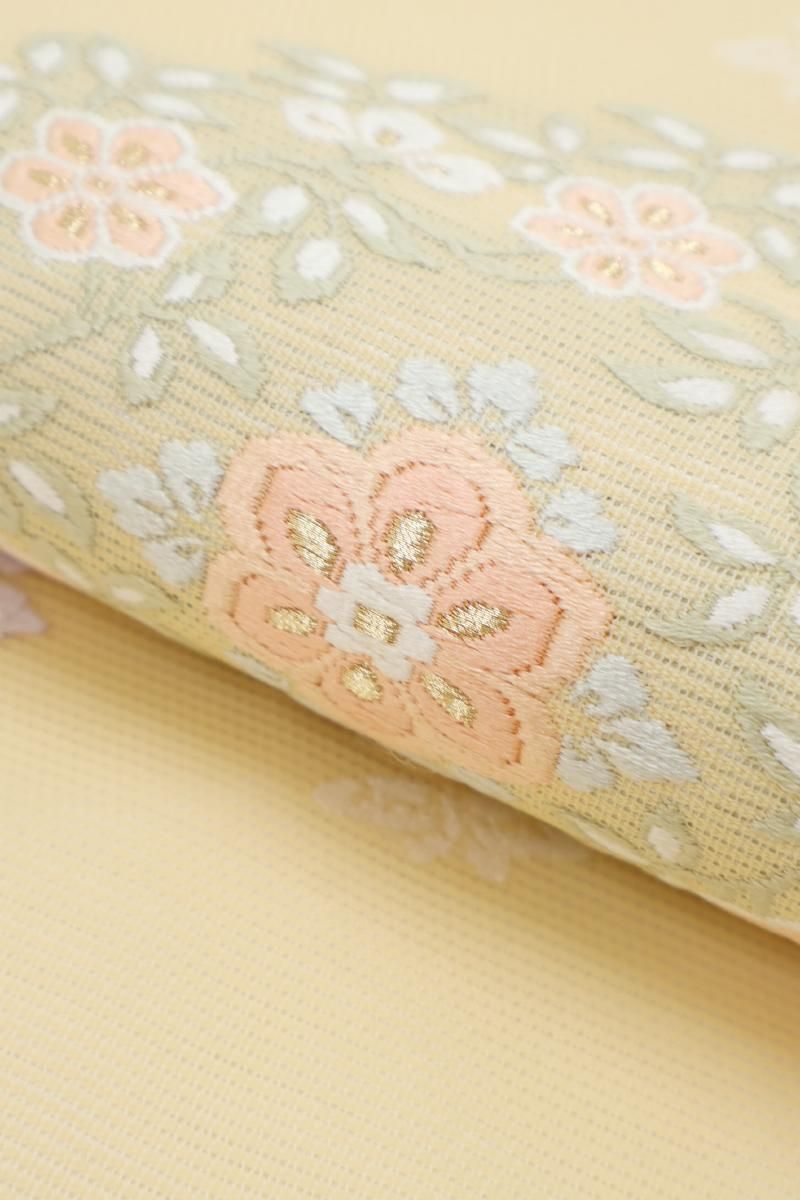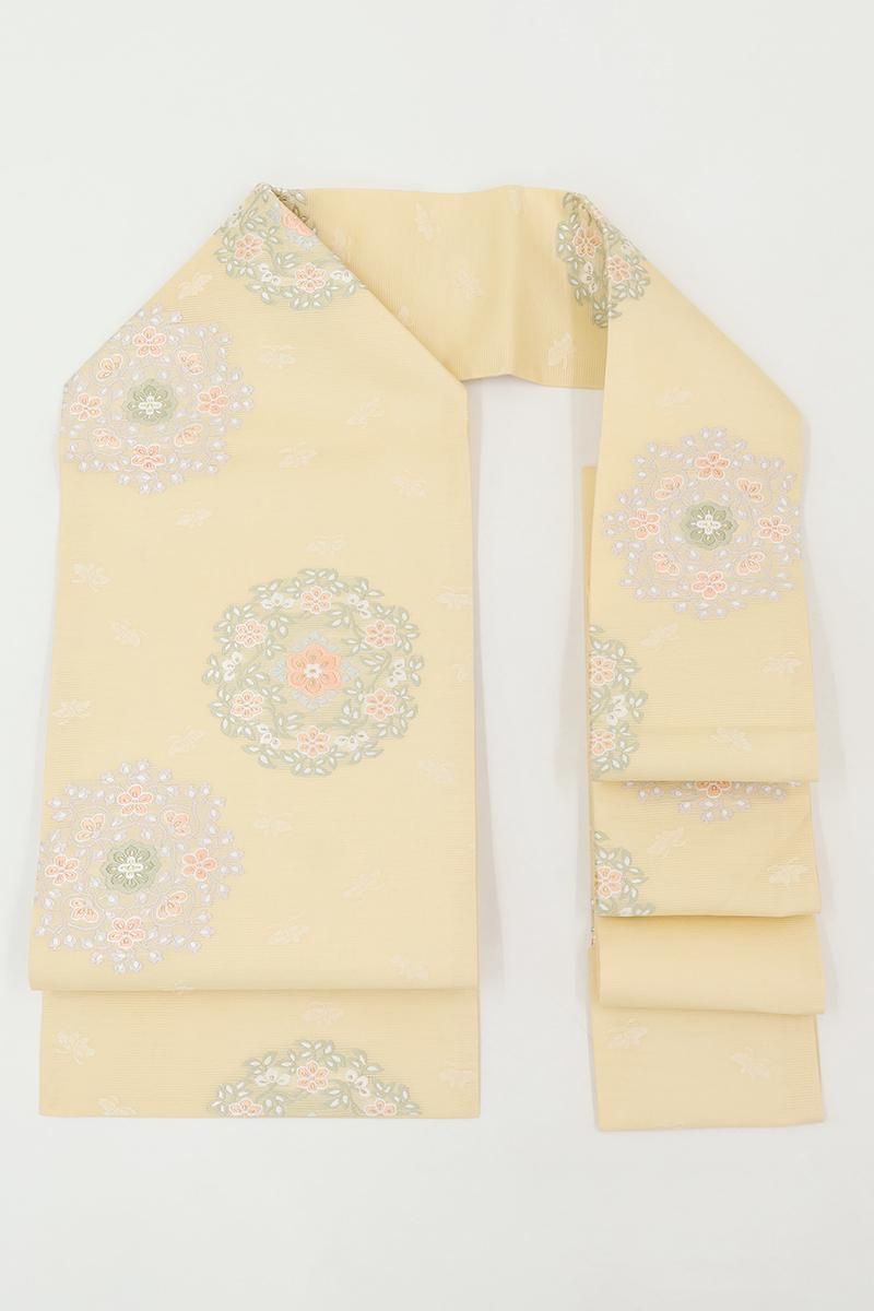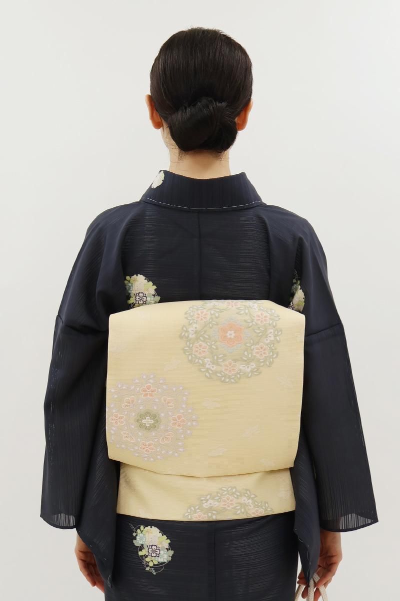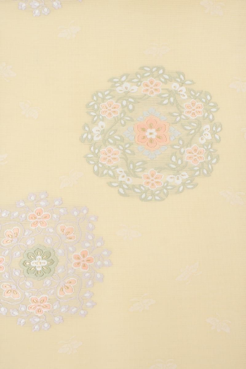 ふっくらとした絹糸の美しい光沢が甘美な彩りに浮かぶ、女性らしく柔和な印象のお品、さりげない金糸の煌めきが気品を添え、着姿を優美に引き立ててくれることと思います。格高の小紋や色無地、付下げなどに合わせて楚々とした装いをお楽しみくださいませ。