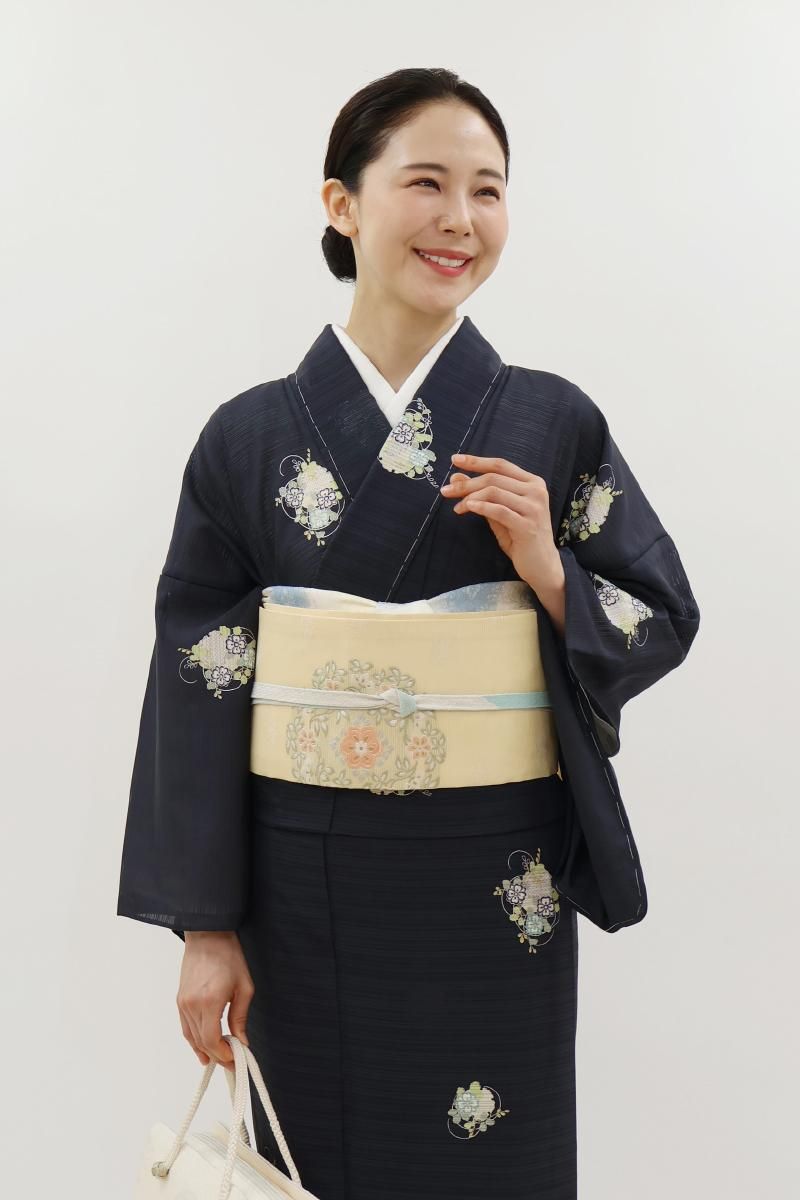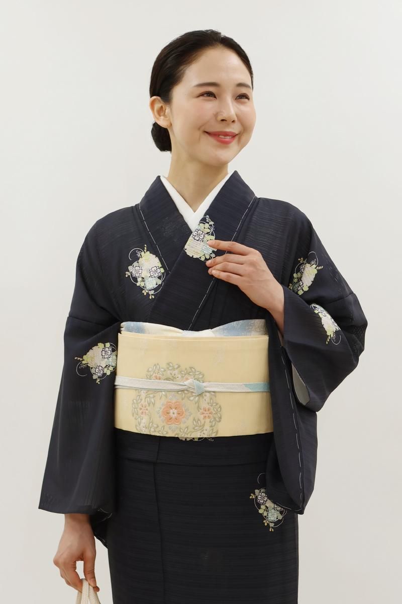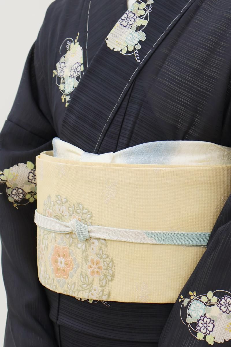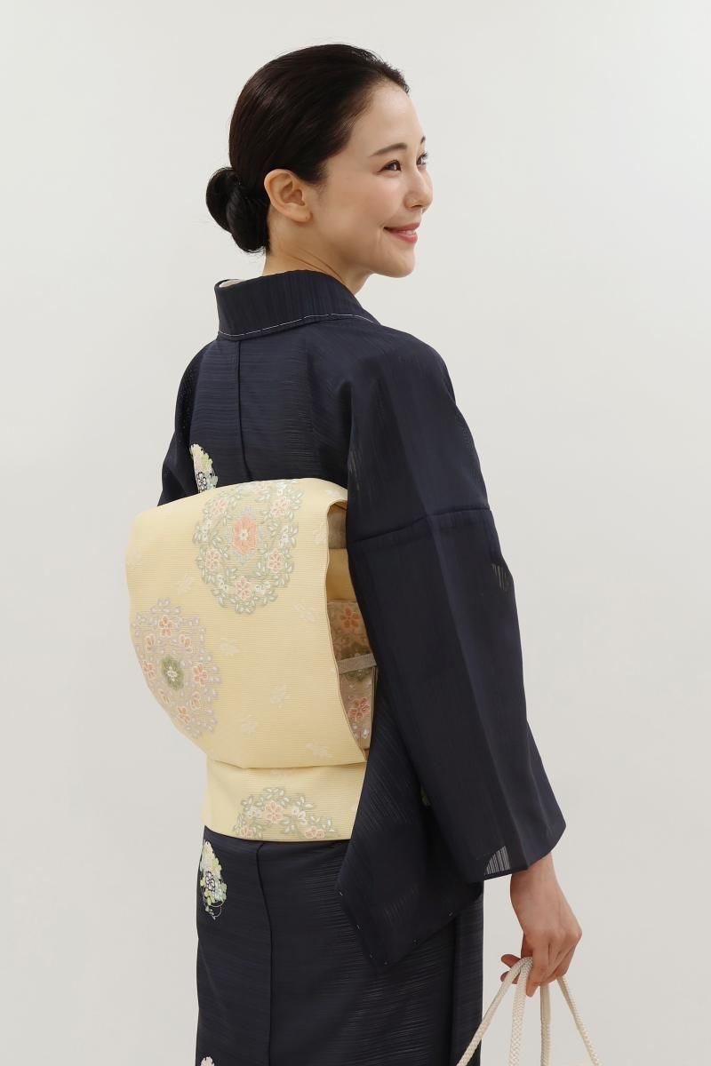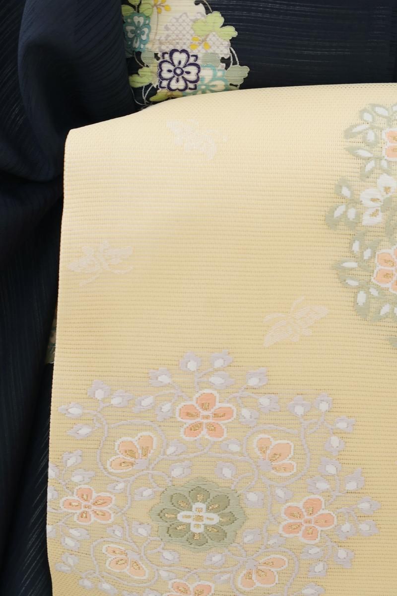 ふっくらとした絹糸の美しい光沢が甘美な彩りに浮かぶ、女性らしく柔和な印象のお品、さりげない金糸の煌めきが気品を添え、着姿を優美に引き立ててくれることと思います。格高の小紋や色無地、付下げなどに合わせて楚々とした装いをお楽しみくださいませ。