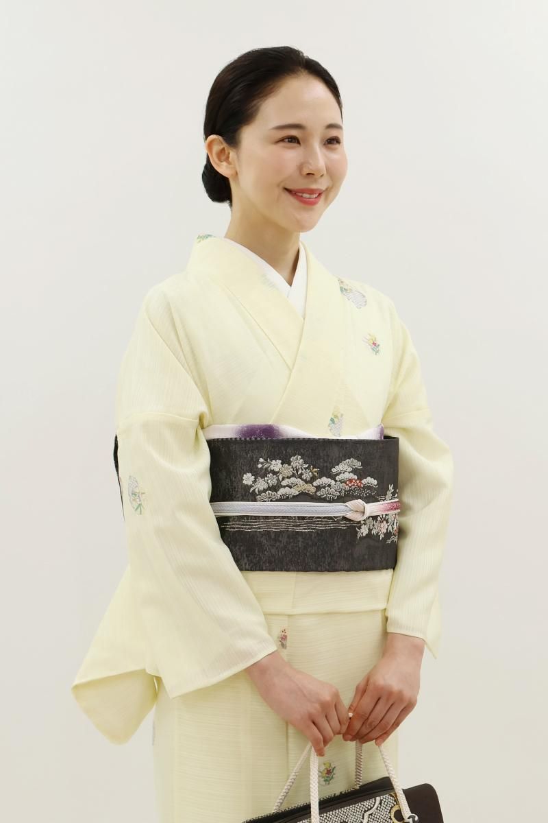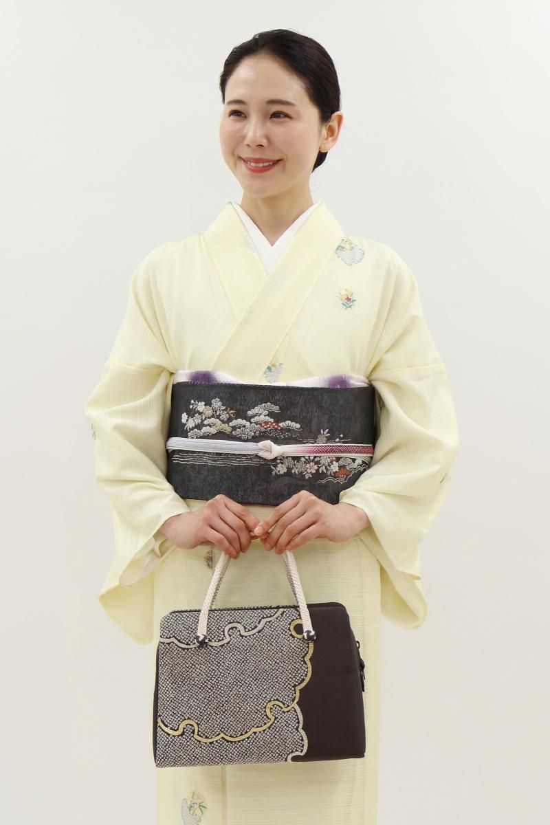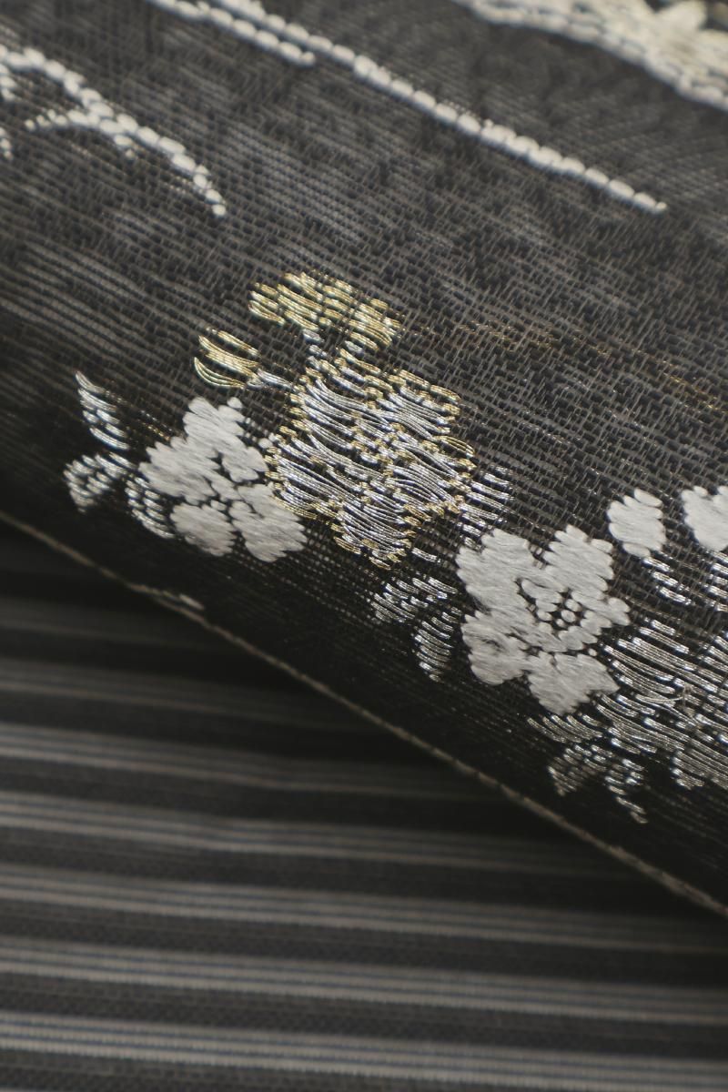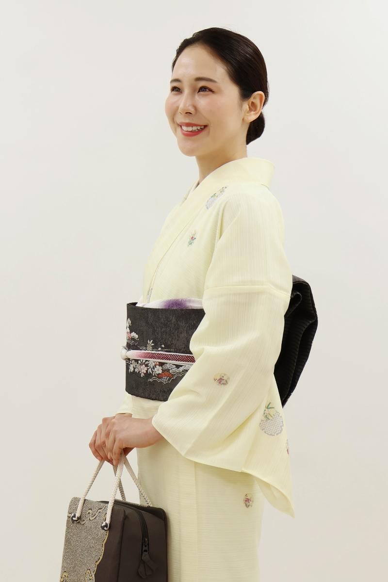 さっくりと透け感豊かな地に、ふっくらとした甘撚りの絹糸が奥行きをもたらすお品、シックな彩りで表された古典意匠や金銀糸の輝きが気品を際立たせていますね。格高の小紋から色無地、付下げなどに合わせて、はんなりとした装いをお楽しみくださいませ。