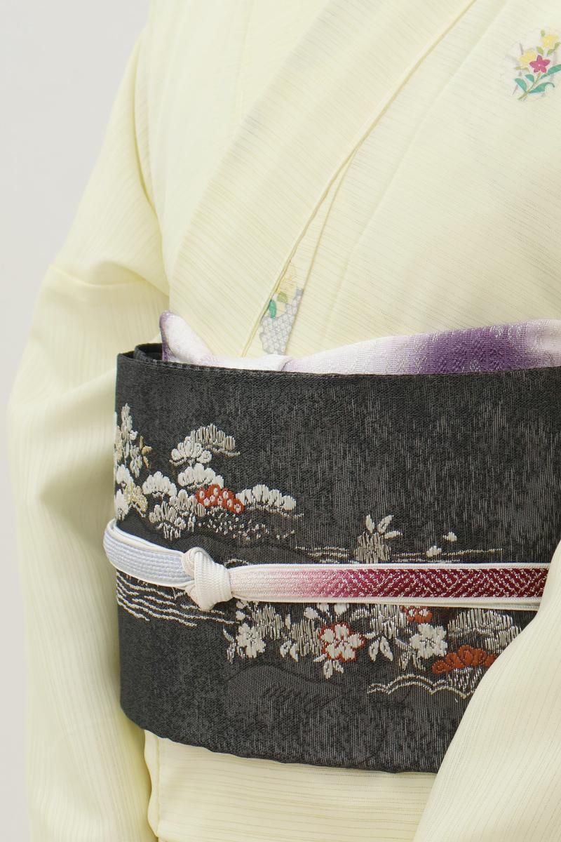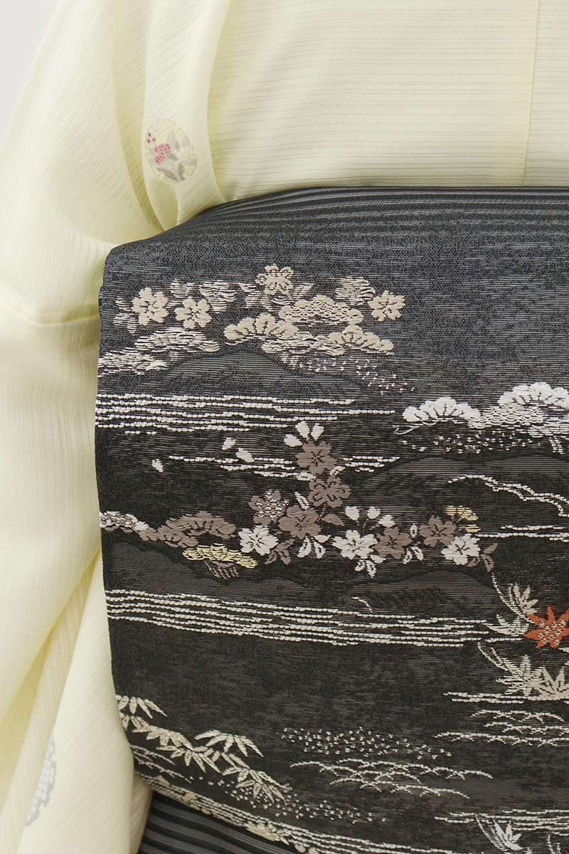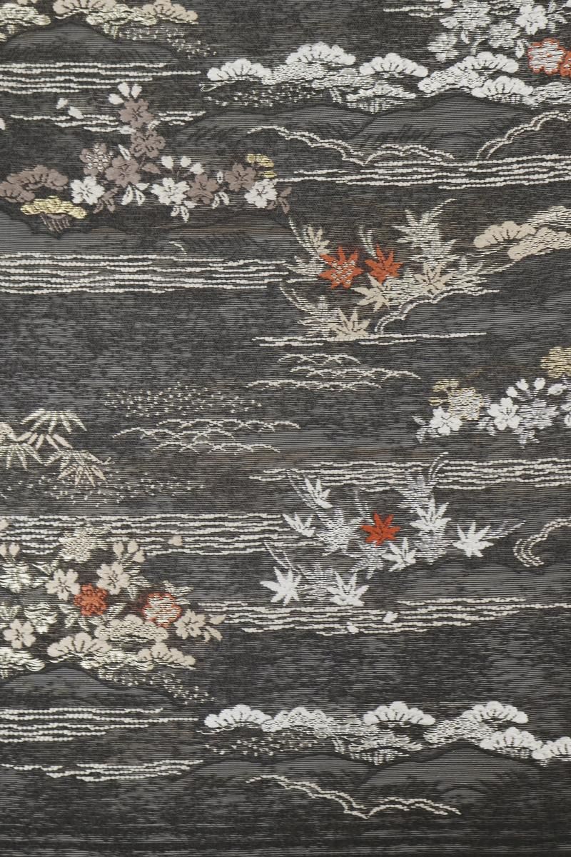 消炭色が近いでしょうか、ごく深いグレーの絽地に、波に桜や楓、松などを細やかに配した夏の袋帯です。