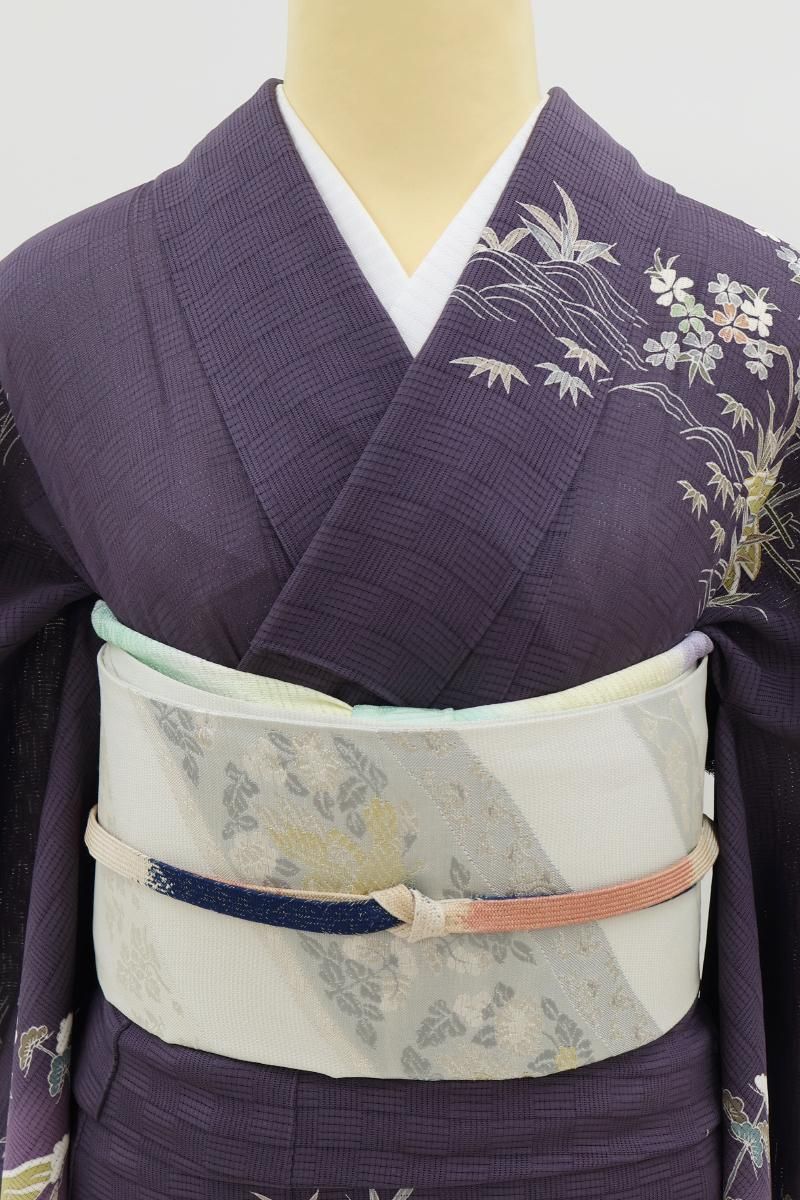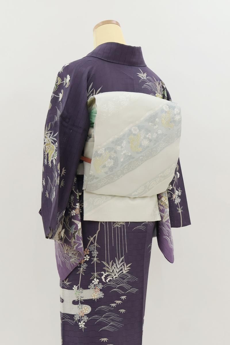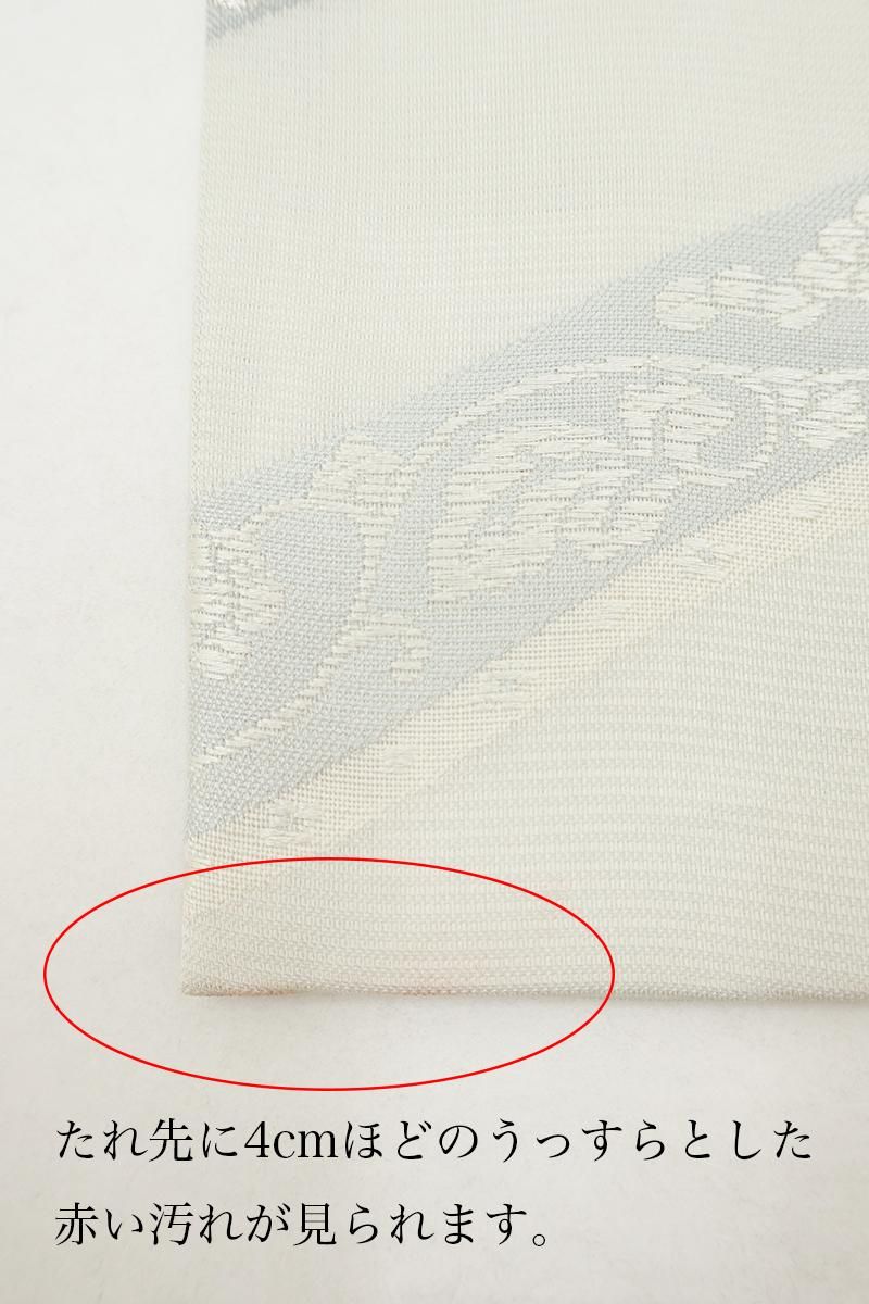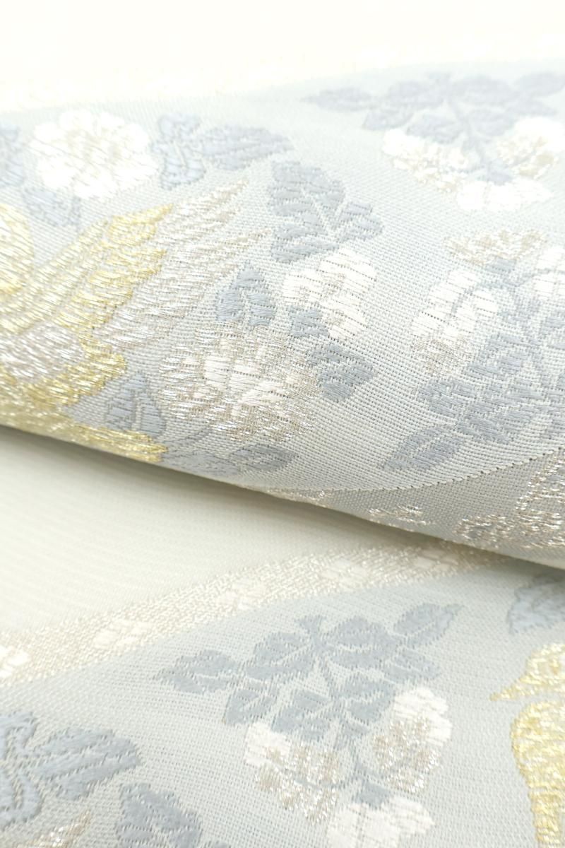 清々しいお色目に金銀糸の輝きが品格を添えるお品、さっくりとした地の風合いが清涼感を引き立てますね。一本お持ちいただくと何かと重宝な白色の帯、色無地から付下げ、訪問着などに合わせて、端正な表情をお楽しみいただけることと思います。この機会にいかがでしょうか。