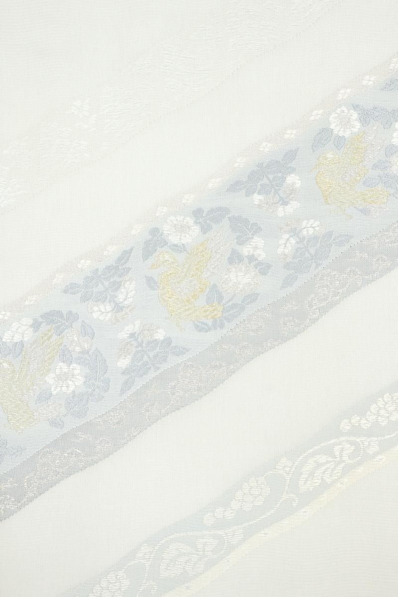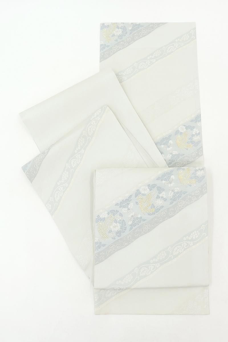 ほのかに灰みを含んだ白系の地に斜め段に、花鳥文や葡萄唐草などを配した絽の袋帯です。