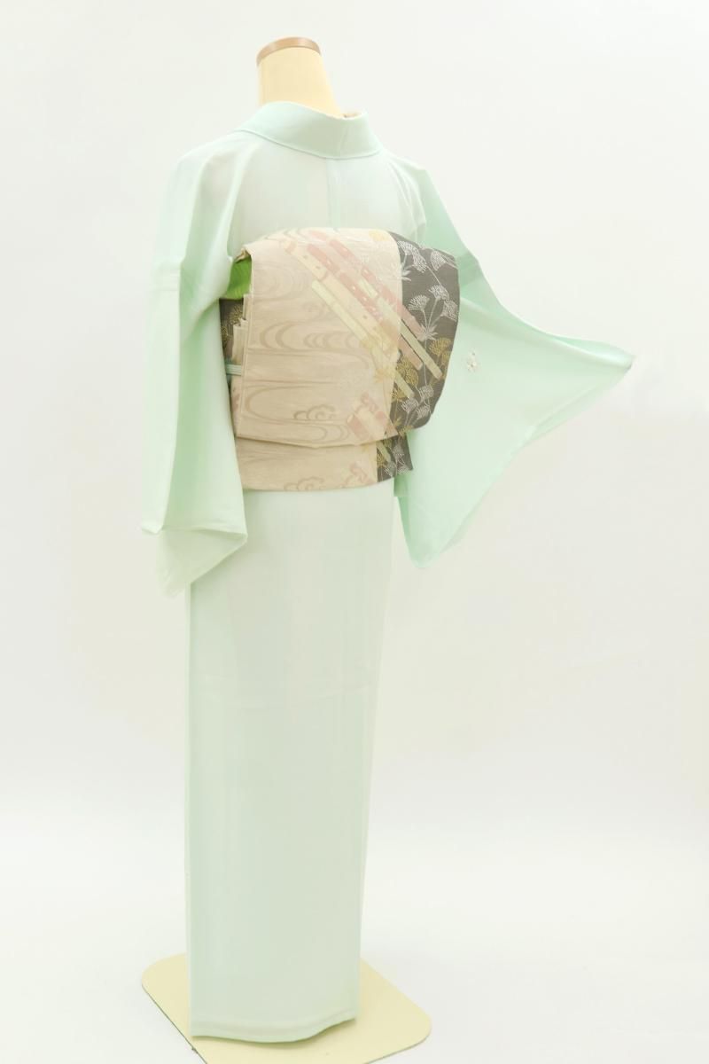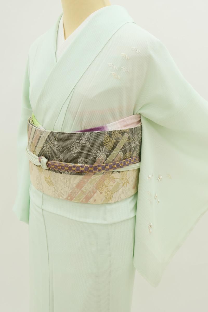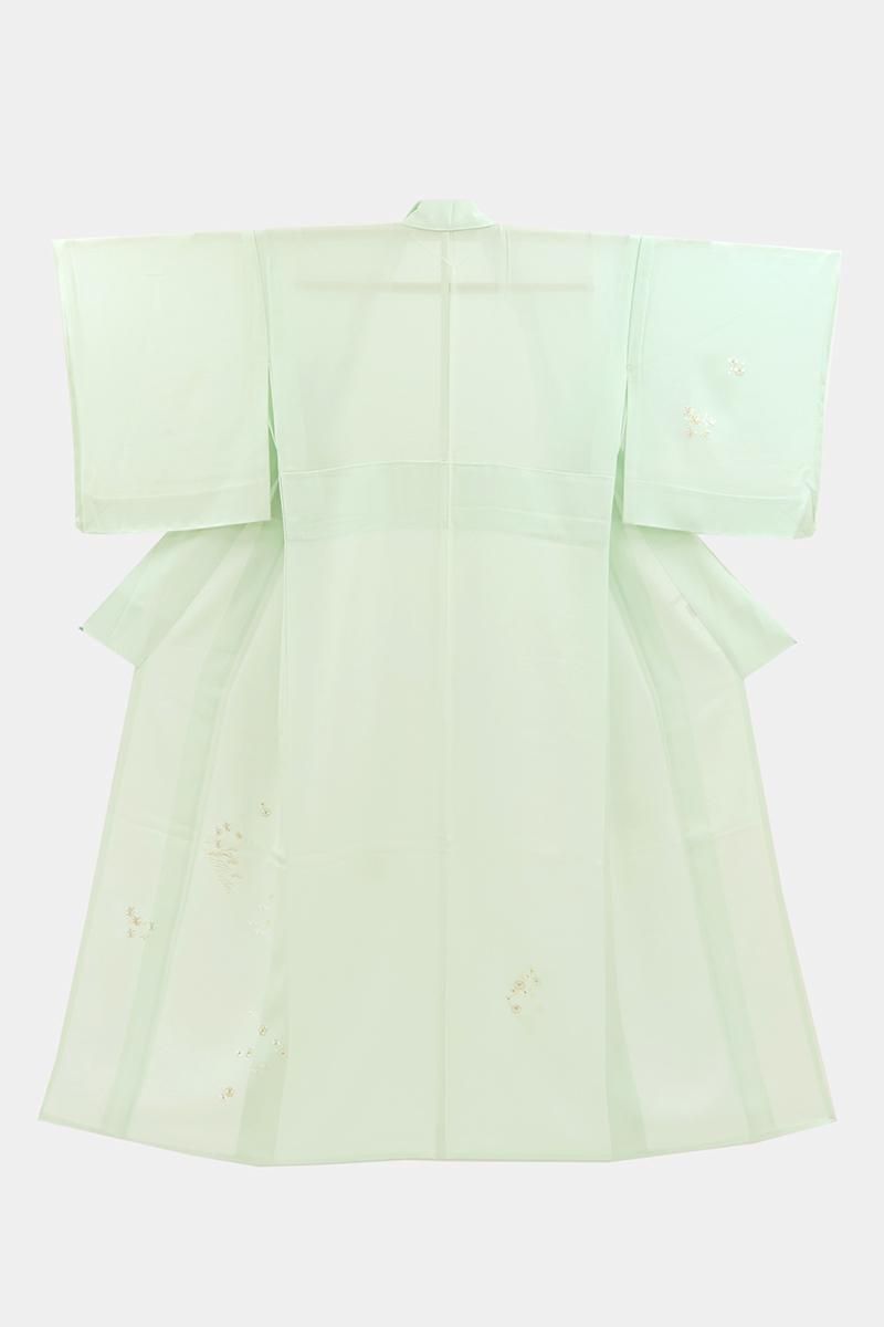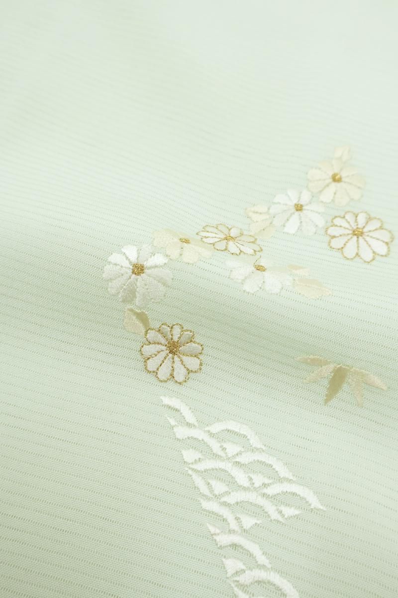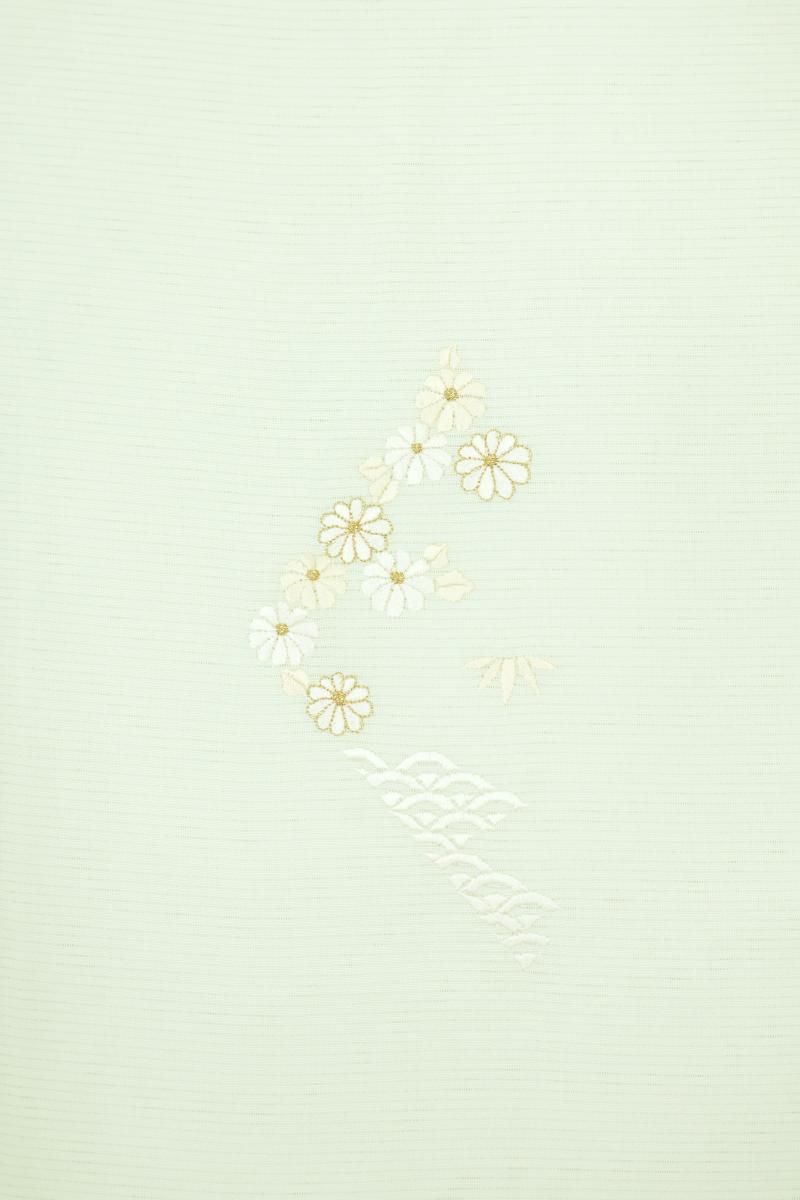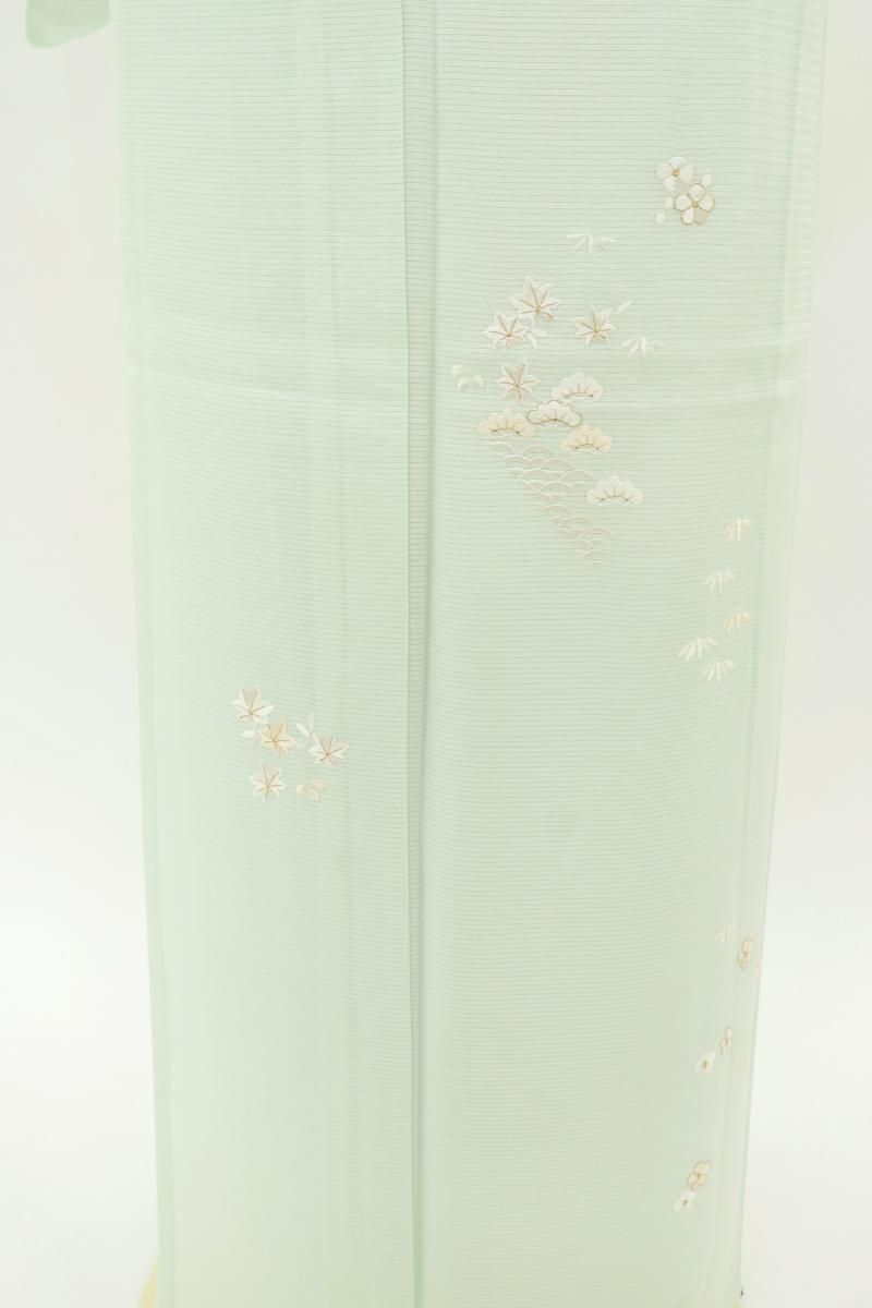 淡いミントグリーンの地に、松竹梅や菊、青海波などを細やかな繍いであしらった絽の付け下げです。
