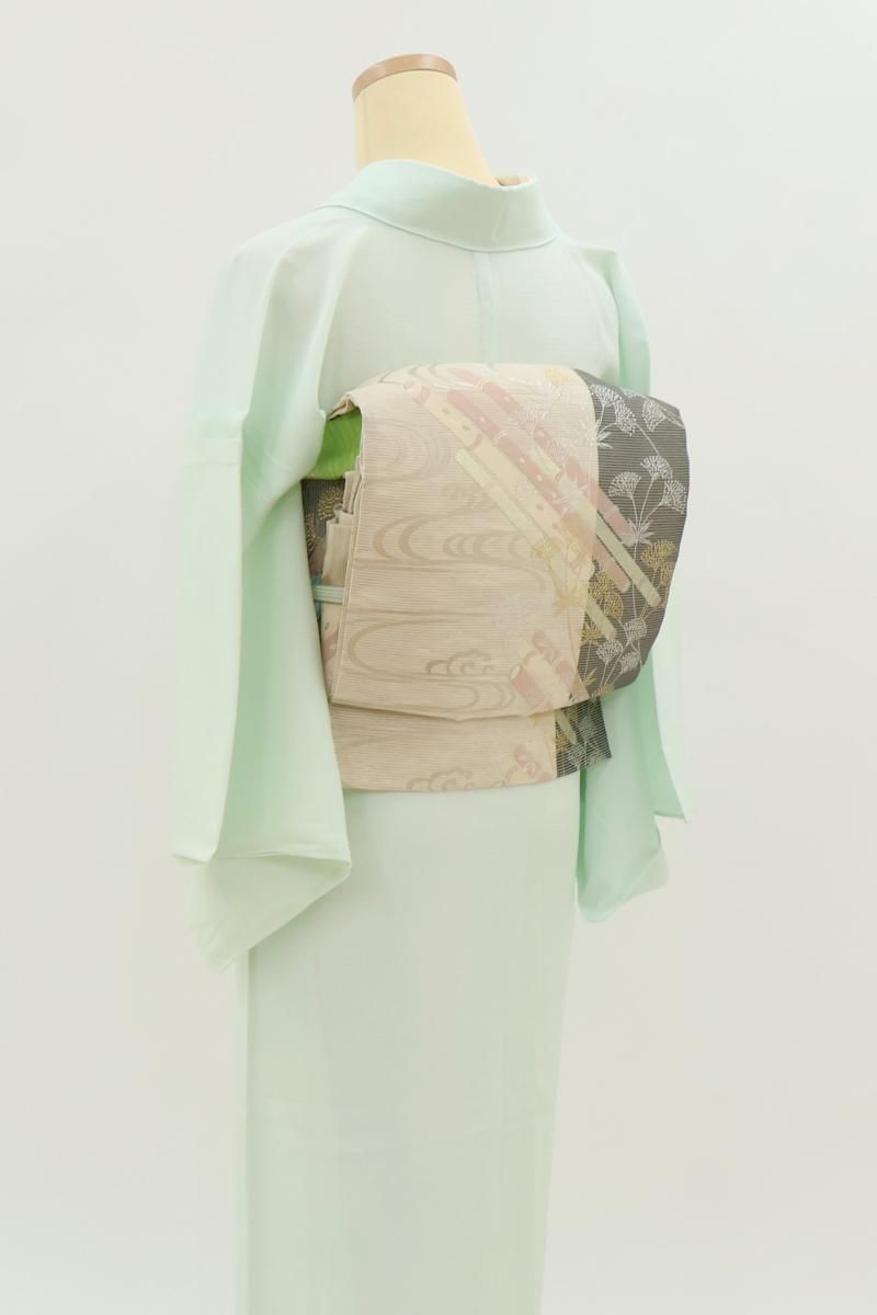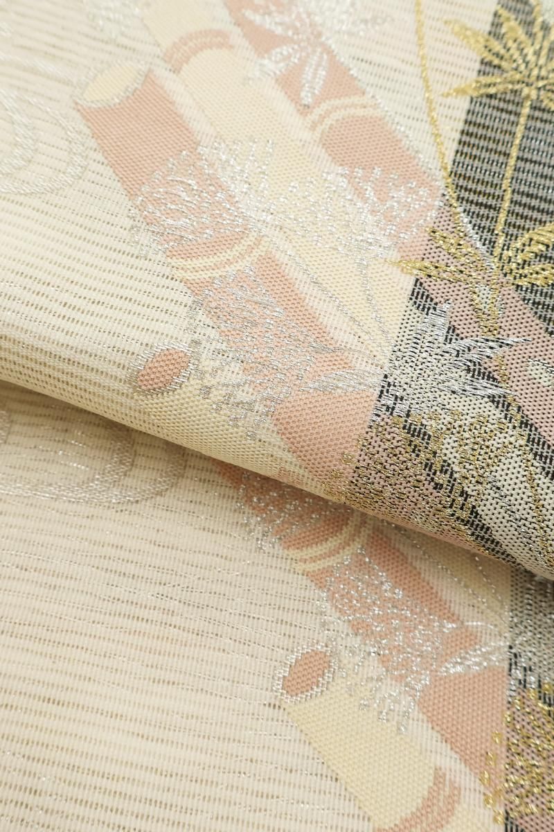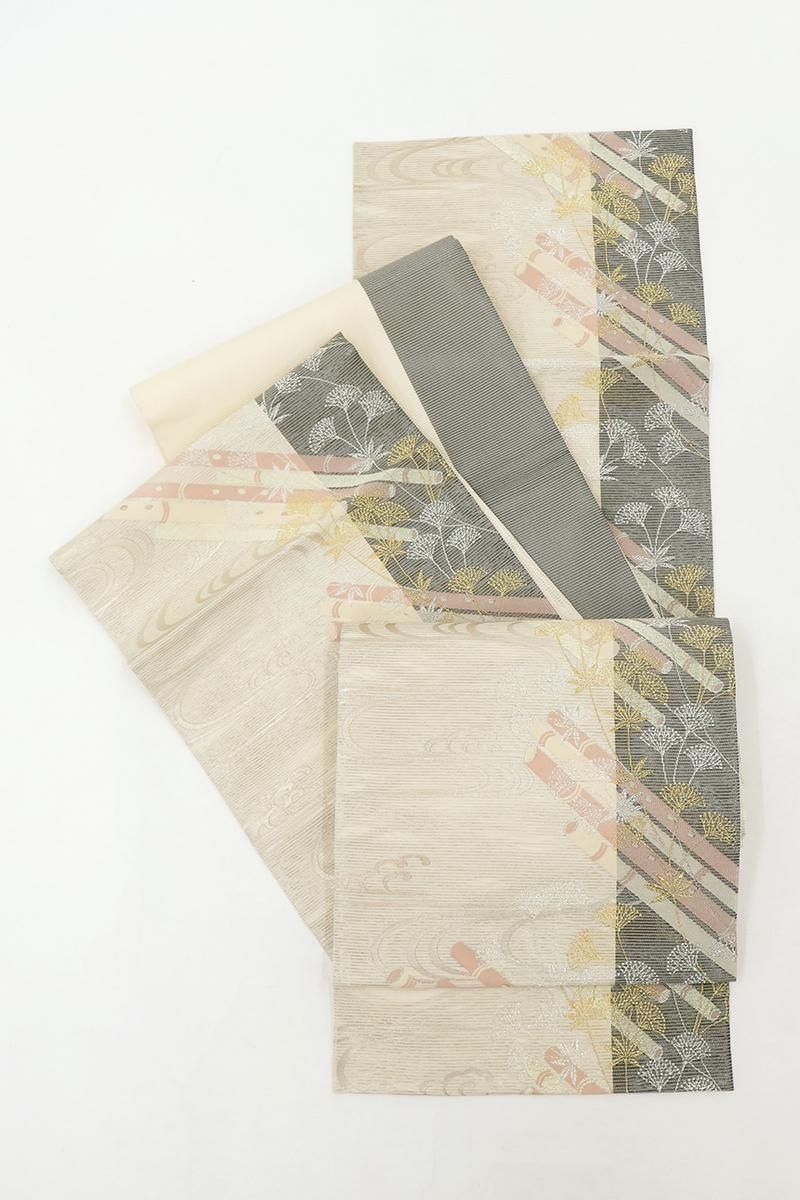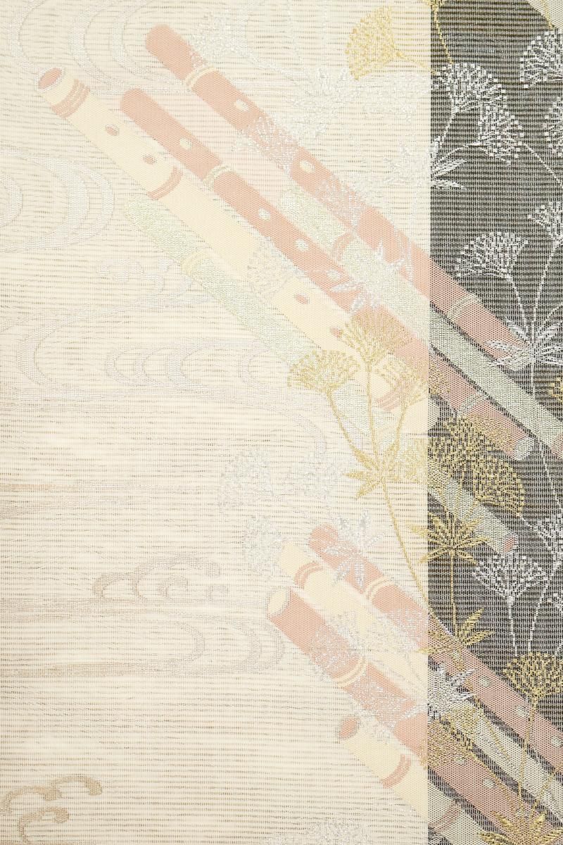 鳥の子色が近いでしょうか、ごく淡いベージュの地に深いグレーで場を分け、おおらかな波を背景に、秋草や笛の図を織り出した絽の袋帯です。透け感ゆたかなさっくりとした地風に、金銀糸を基調として表現された古典意匠が雅やかな雰囲気のお品、芯地にはさりげなく銀糸が施されており、一層の気品を添えますね。改まったお席やパーティなど夏のお呼ばれへのご用意にいかがでしょうか。