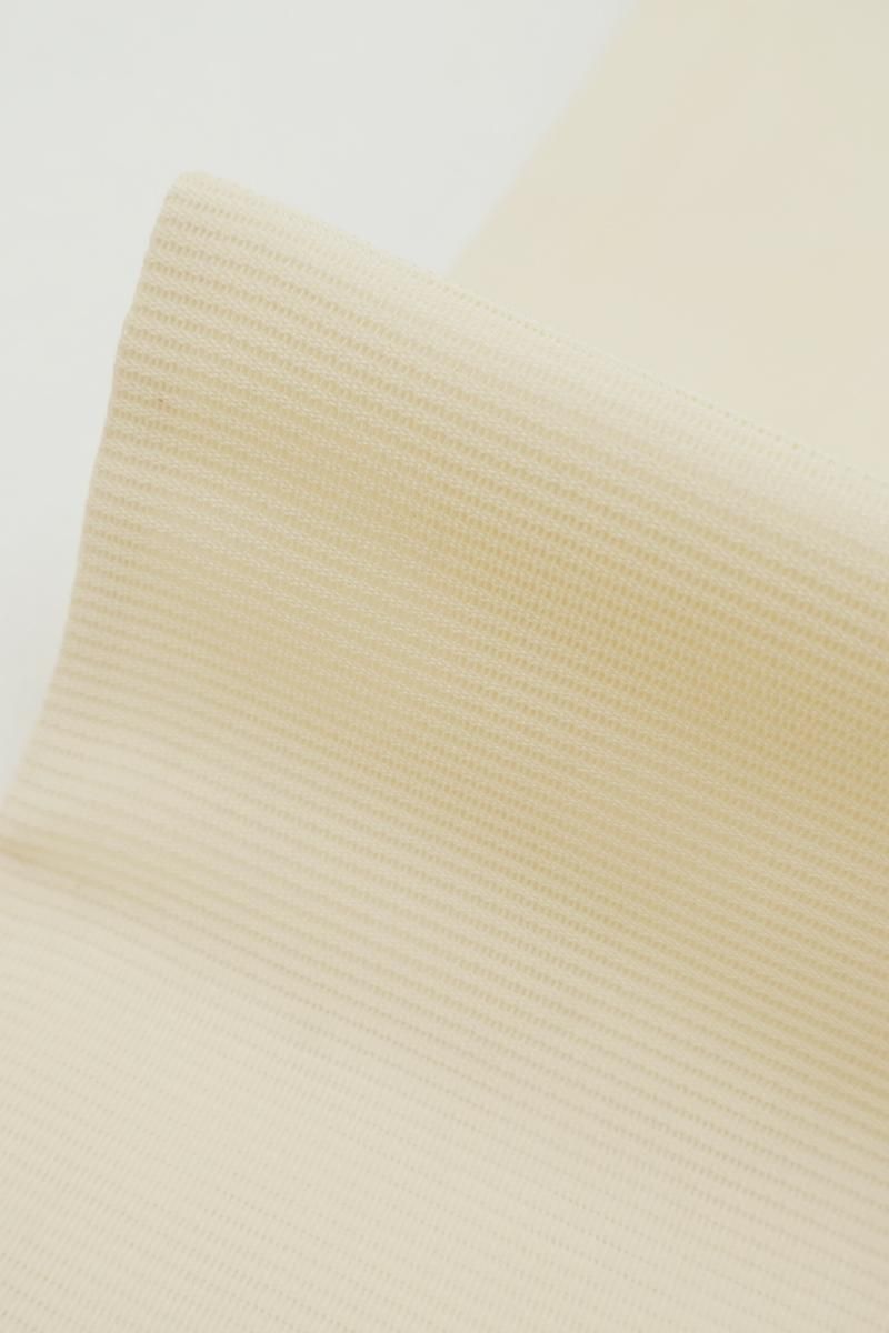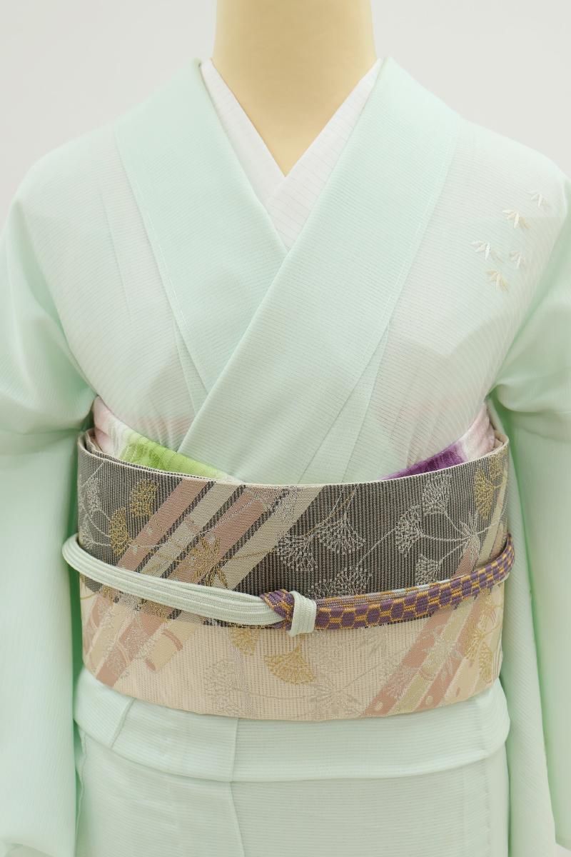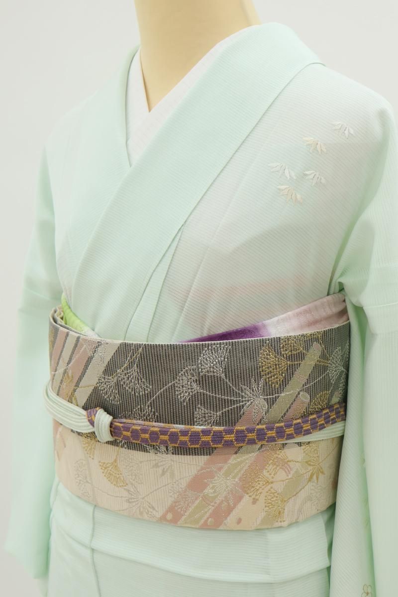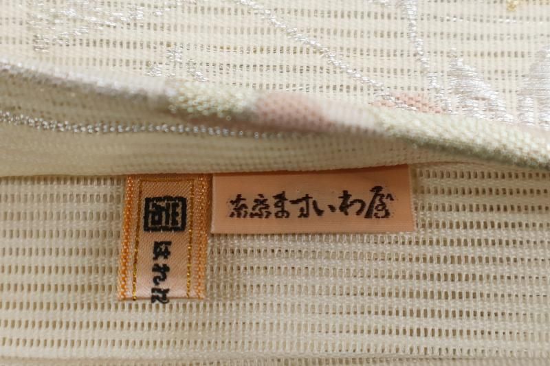 鳥の子色が近いでしょうか、ごく淡いベージュの地に深いグレーで場を分け、おおらかな波を背景に、秋草や笛の図を織り出した絽の袋帯です。透け感ゆたかなさっくりとした地風に、金銀糸を基調として表現された古典意匠が雅やかな雰囲気のお品、芯地にはさりげなく銀糸が施されており、一層の気品を添えますね。改まったお席やパーティなど夏のお呼ばれへのご用意にいかがでしょうか。