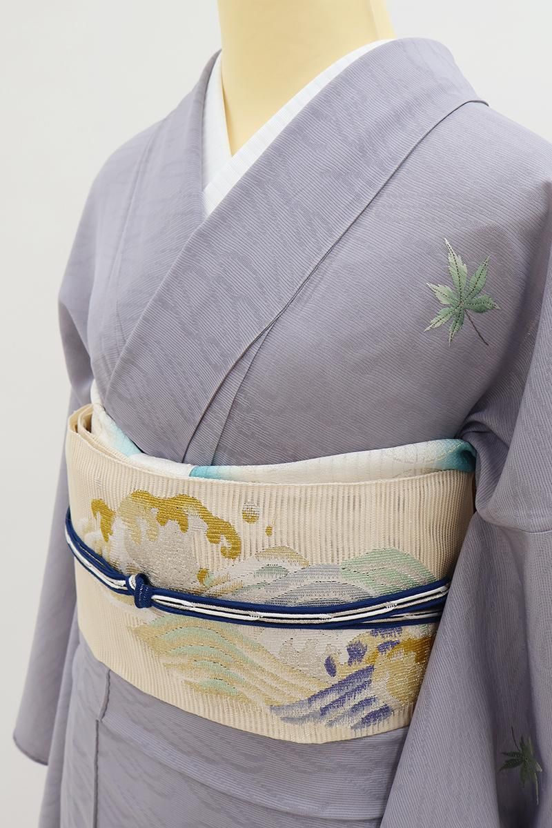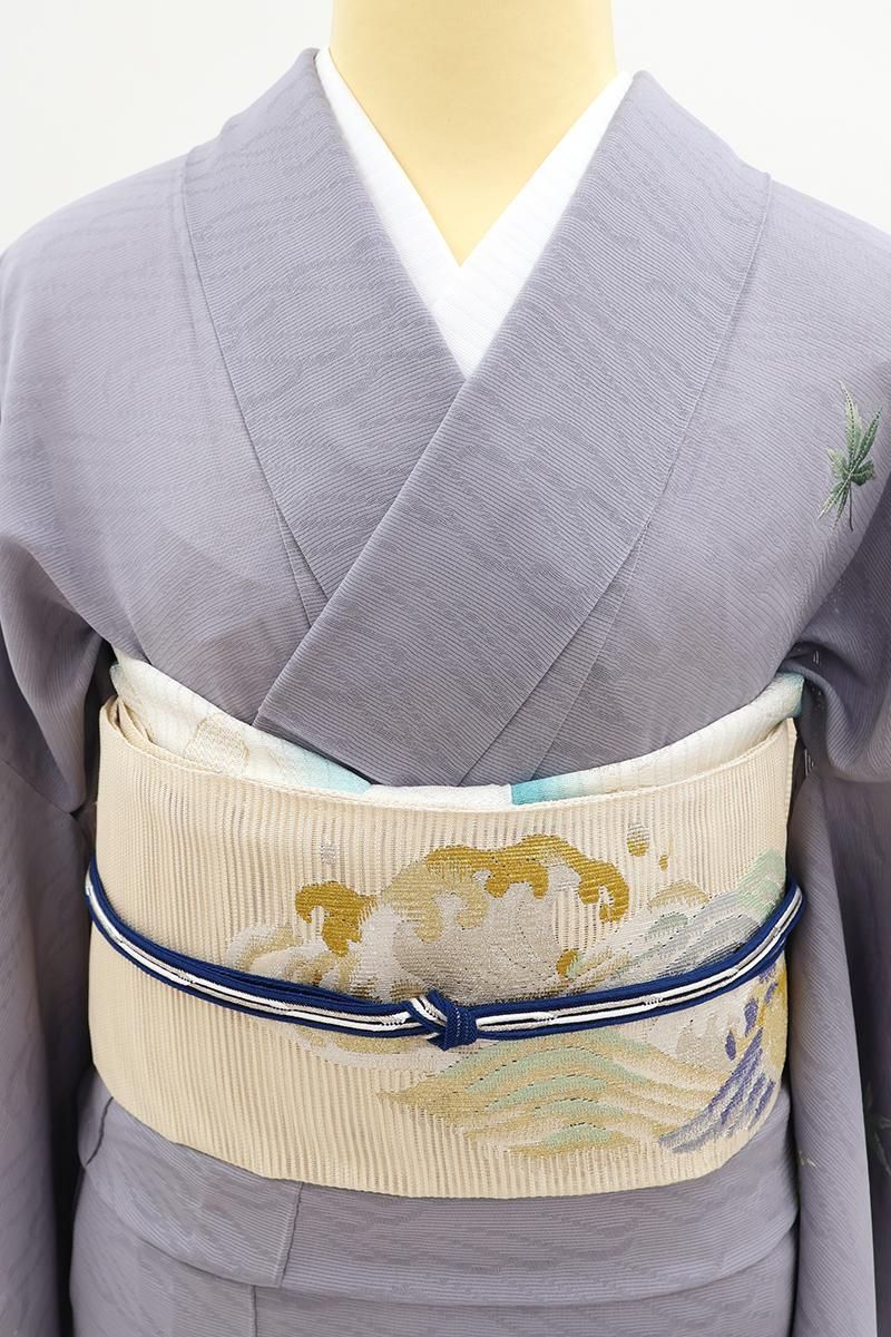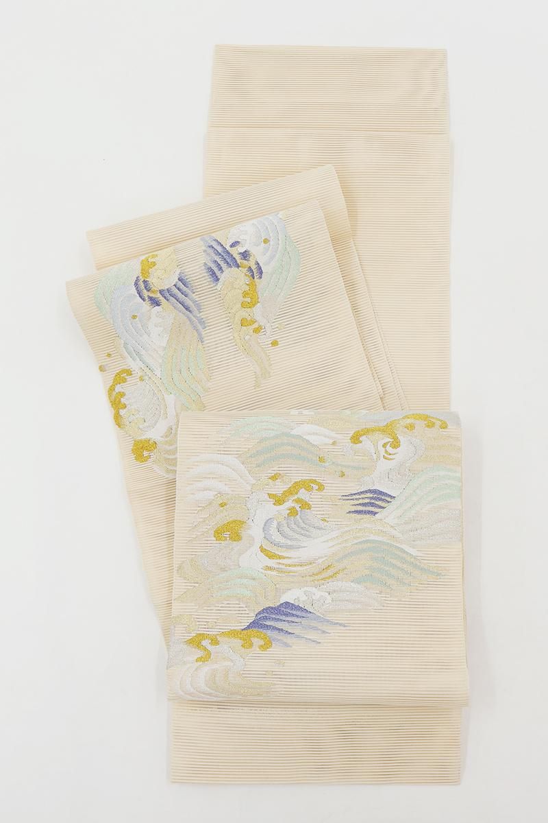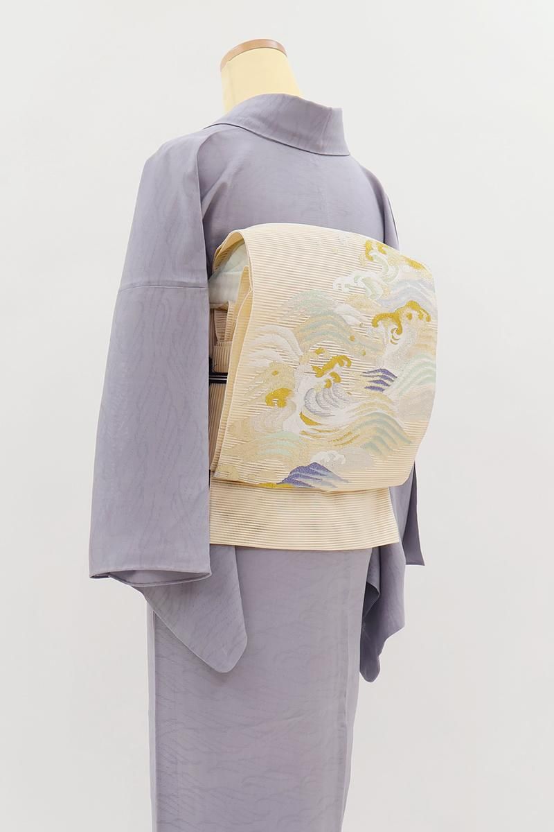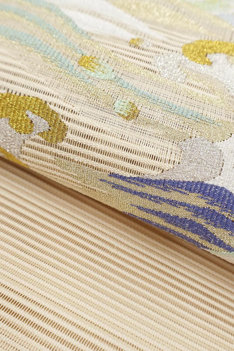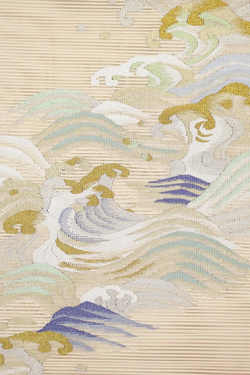 クリーム色が近いでしょうか、クリームベージュの地に、躍動感あふれる波文をあしらった絽綴れの袋帯です。透け感ゆたかな明るいお色目に、金銀糸をふんだんに用いて表現された意匠が後ろ姿を印象的に引き立てるお品、リズミカルな動きが清々しく、清涼感溢れる装いでお楽しみいただけることと思います。夏のお呼ばれなど改まったお席やパーティなどにいかがでしょうか。