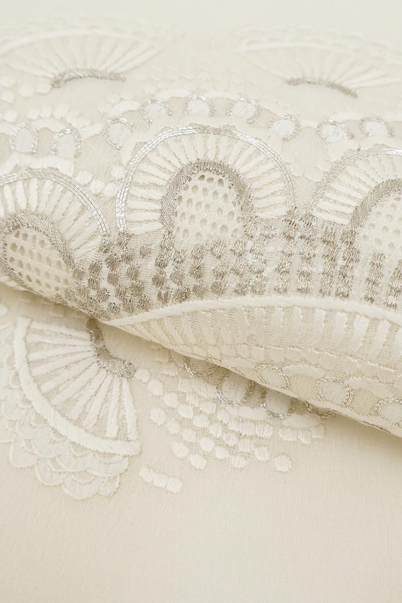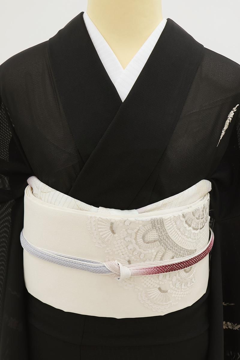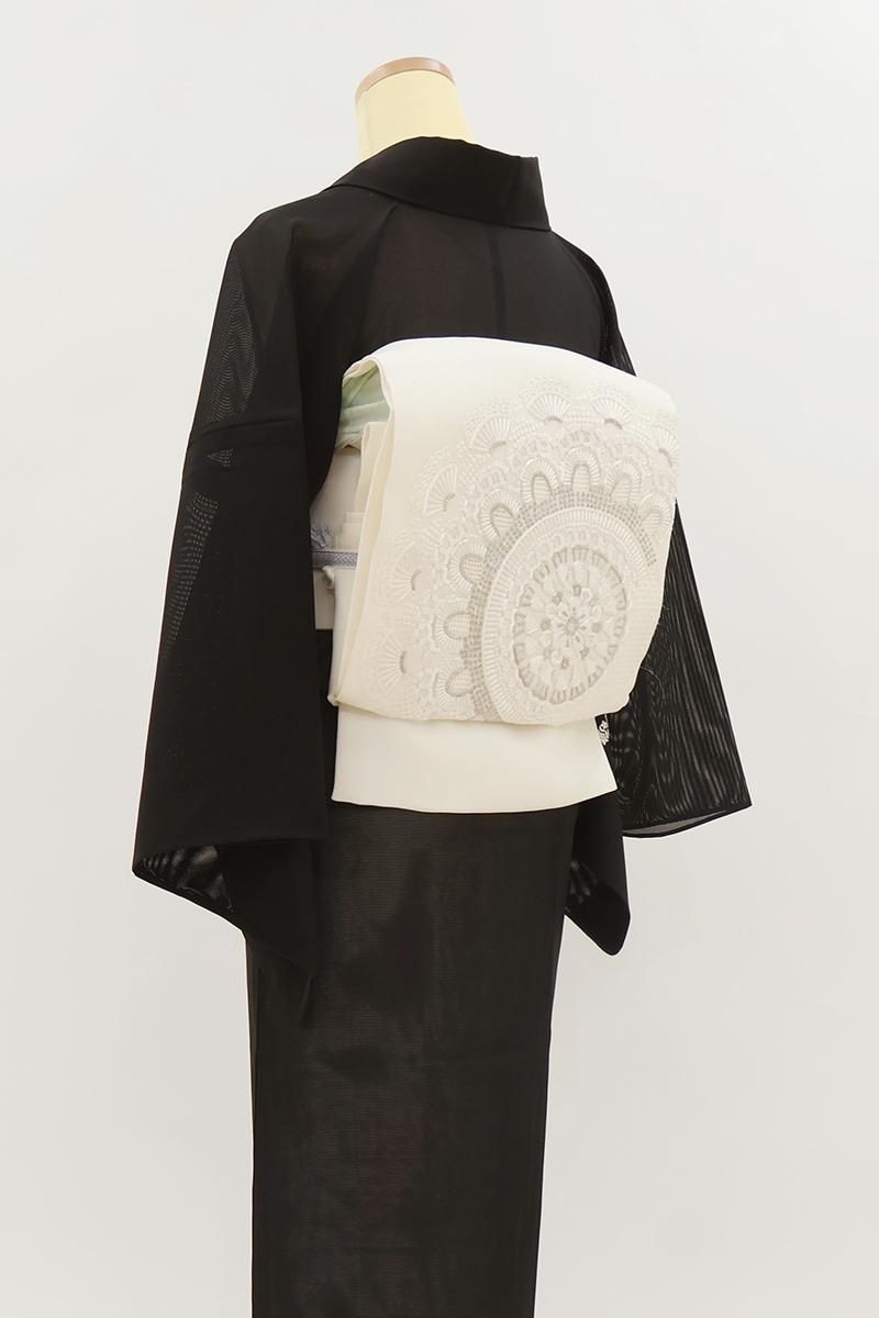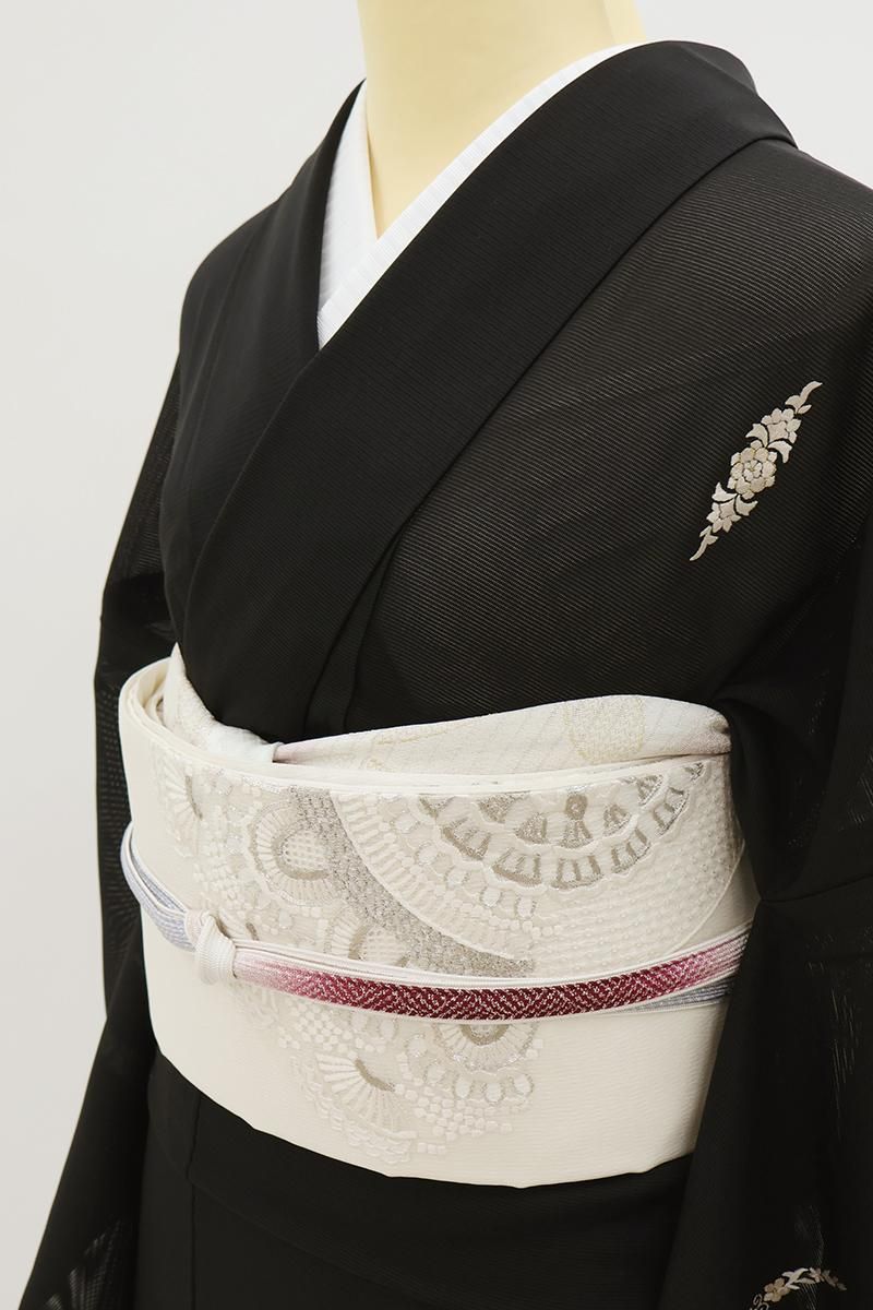 しゃりっとした地風の明るいお色目に白糸と銀糸のみで表現された優雅なモチーフが楚々とした雰囲気のお品、パーティなどの装いを気品豊かに引き立ててくれることと思います。清々しい白色の帯は様々な色柄のお着物にやさしく寄り添ってくれますね。是非この機会にいかがでしょうか。