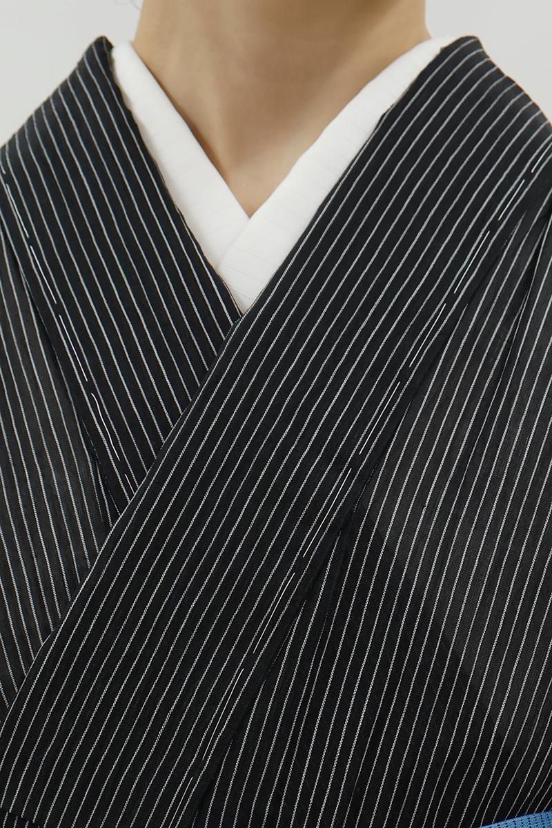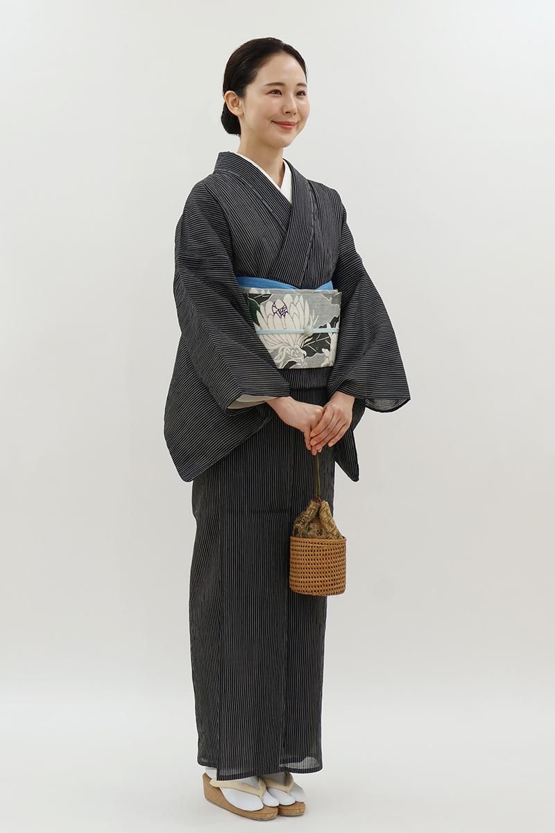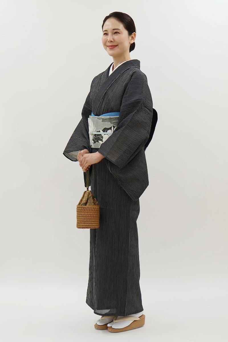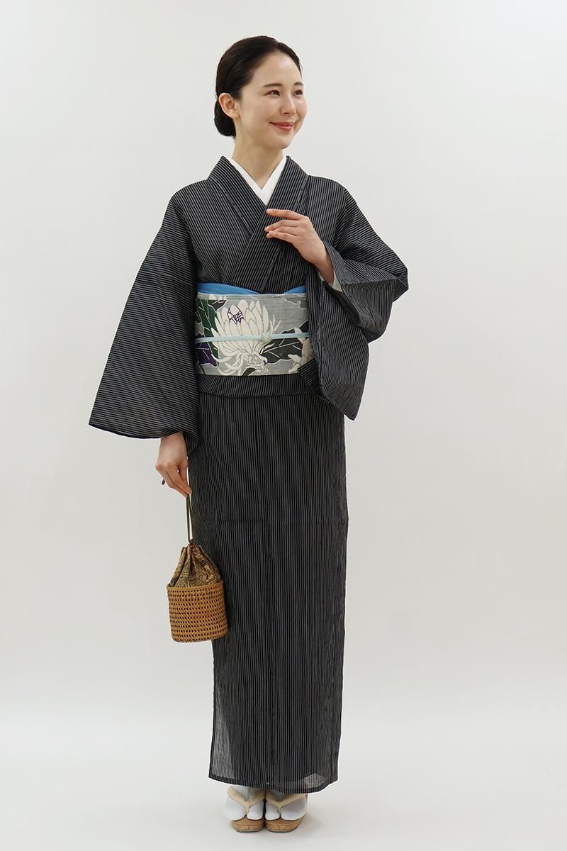 暑い夏にも安心なお手入れのしやすさ、そして細やかなしぼから生まれるさらりと快適な着心地から、この季節手放せない小千谷縮です。こちらはきりりとした黒色の地に、白色で竪縞を織りだしたお品、シンプルな色柄は帯合わせも自在、様々なコーディネートをお楽しみいただけそうですね。お家でお手入れできる気軽さも夏には大切な要素。涼風が抜けてゆくような素敵なカジュアルをいかがでしょうか。