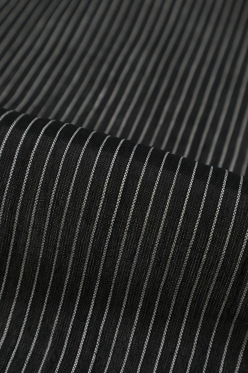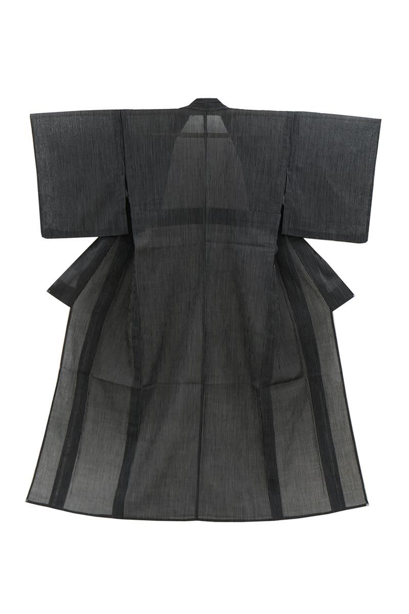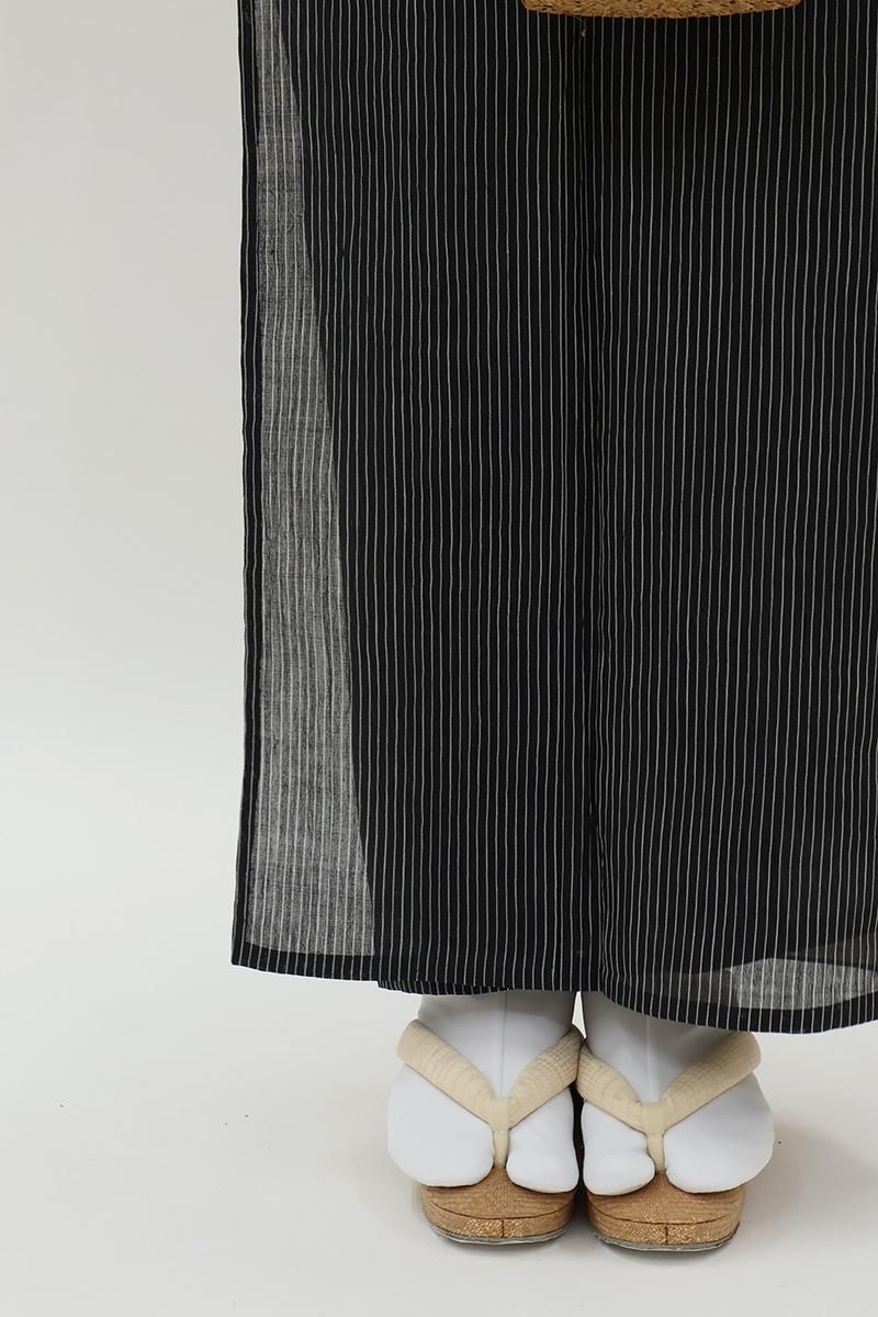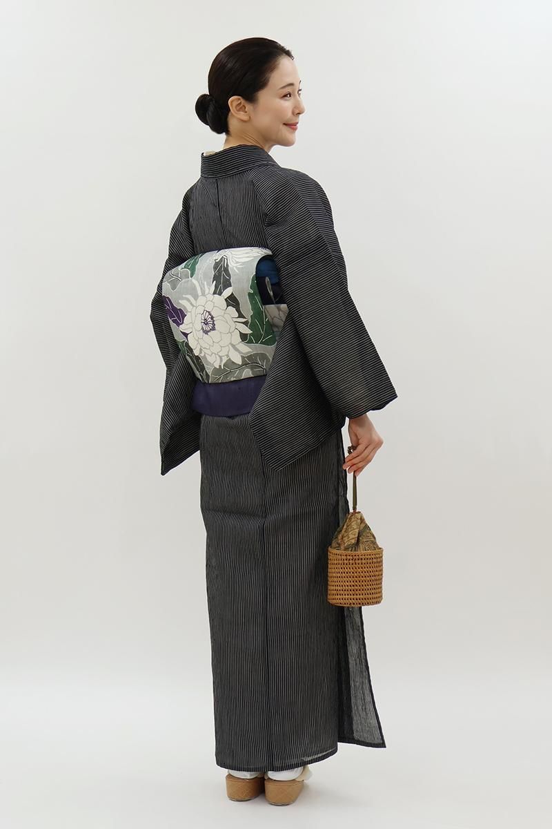 暑い夏にも安心なお手入れのしやすさ、そして細やかなしぼから生まれるさらりと快適な着心地から、この季節手放せない小千谷縮です。こちらはきりりとした黒色の地に、白色で竪縞を織りだしたお品、シンプルな色柄は帯合わせも自在、様々なコーディネートをお楽しみいただけそうですね。お家でお手入れできる気軽さも夏には大切な要素。涼風が抜けてゆくような素敵なカジュアルをいかがでしょうか。
