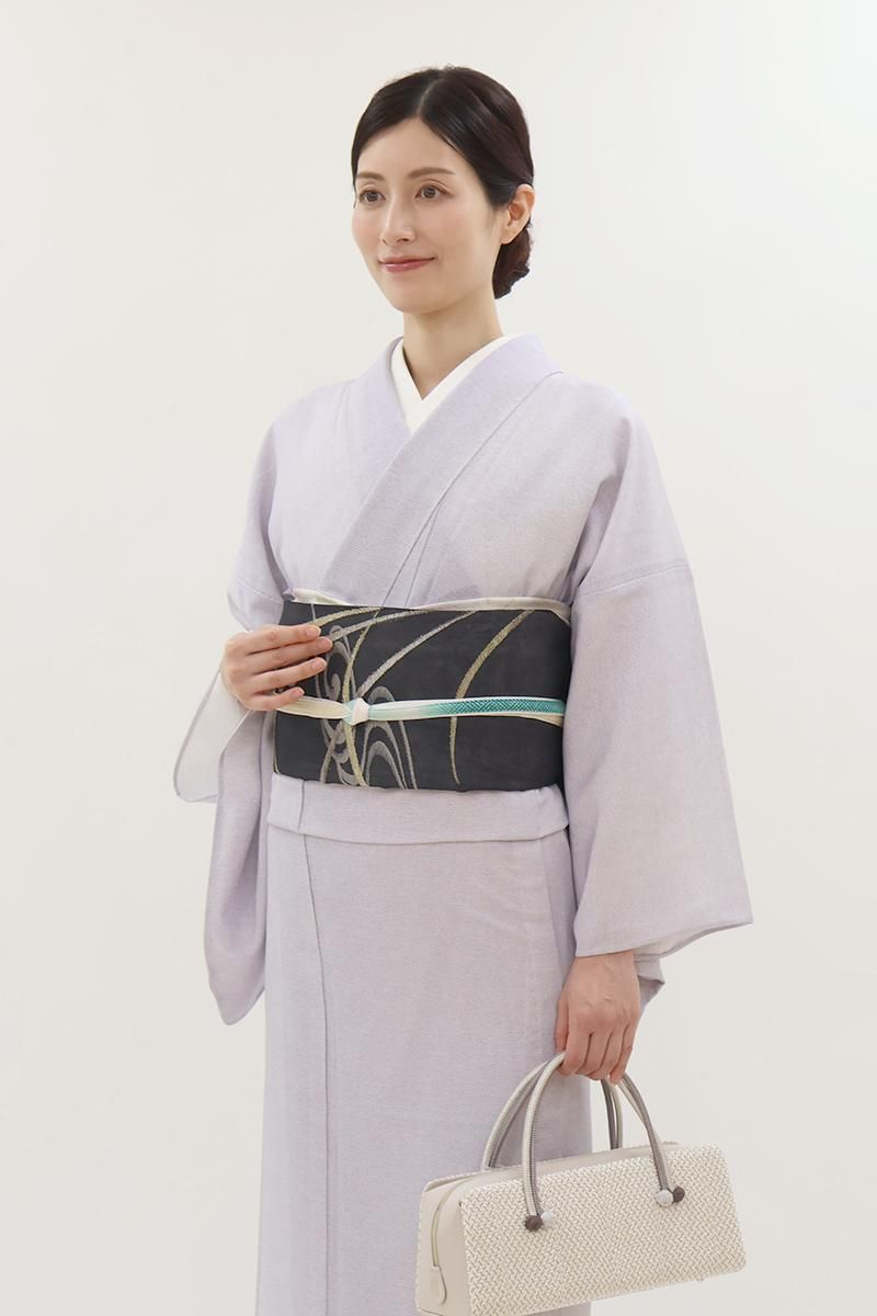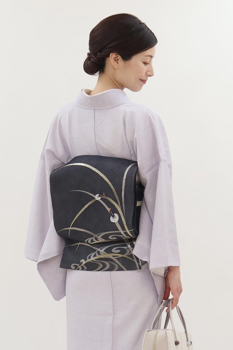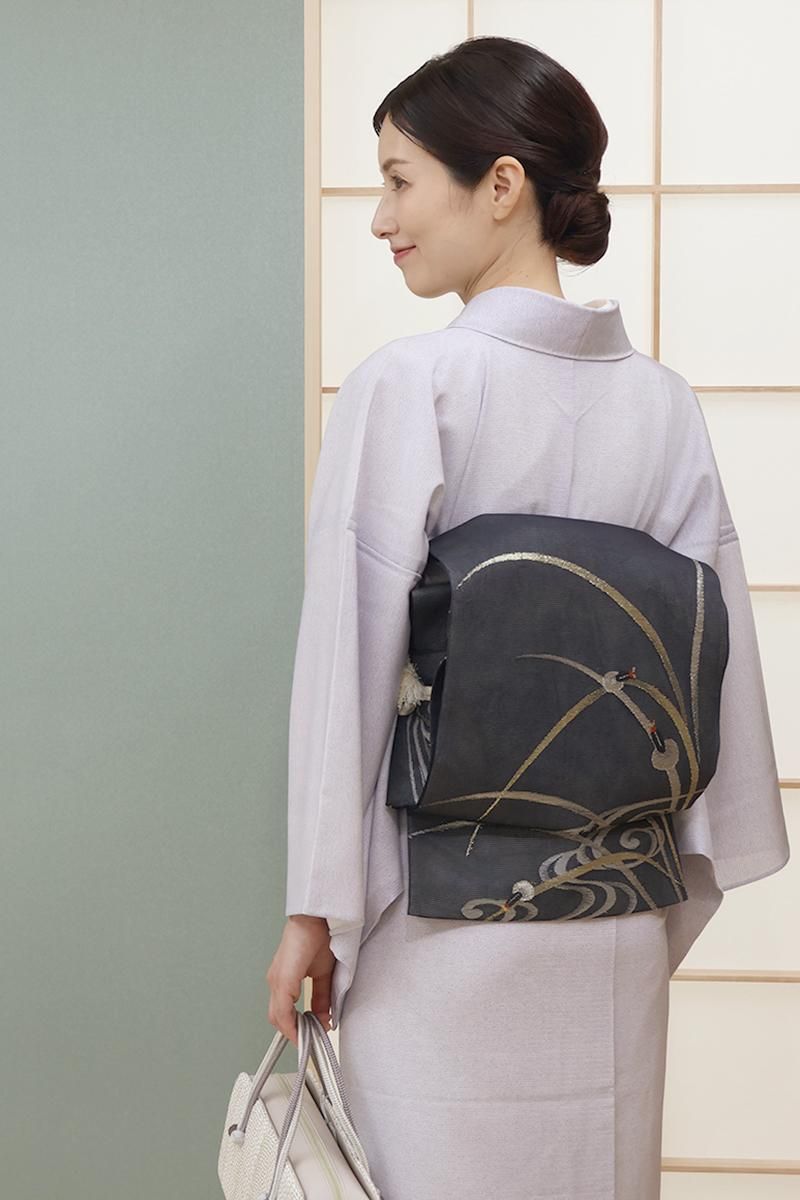 しゃりっとした風合いのシックなお色目に、金銀糸で表現された風情豊かな景色が、見る人の目にも涼やかな風を運ぶ一品、しっとりと落ち着いた色柄ゆきは年齢を問わずにお使い頂けそうですね。色無地や付下げなどに合わせて、涼感を運ぶ装いをお楽しみくださいませ。