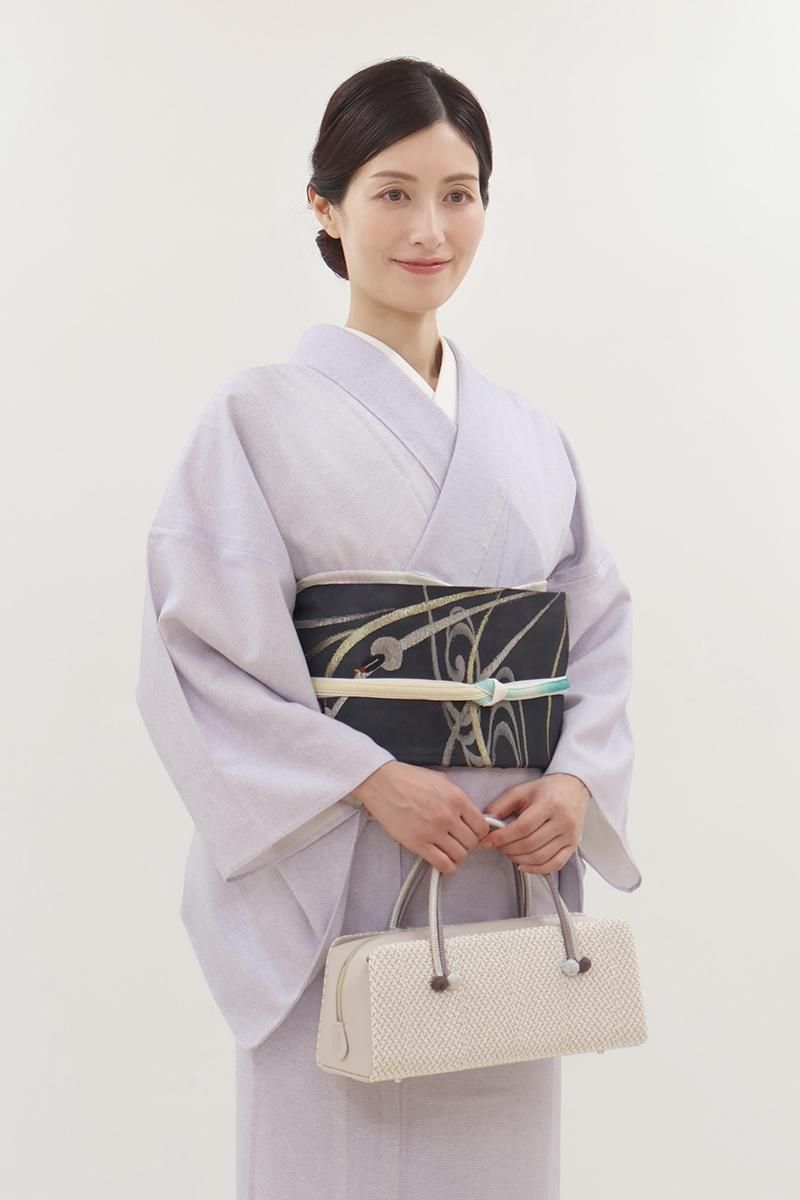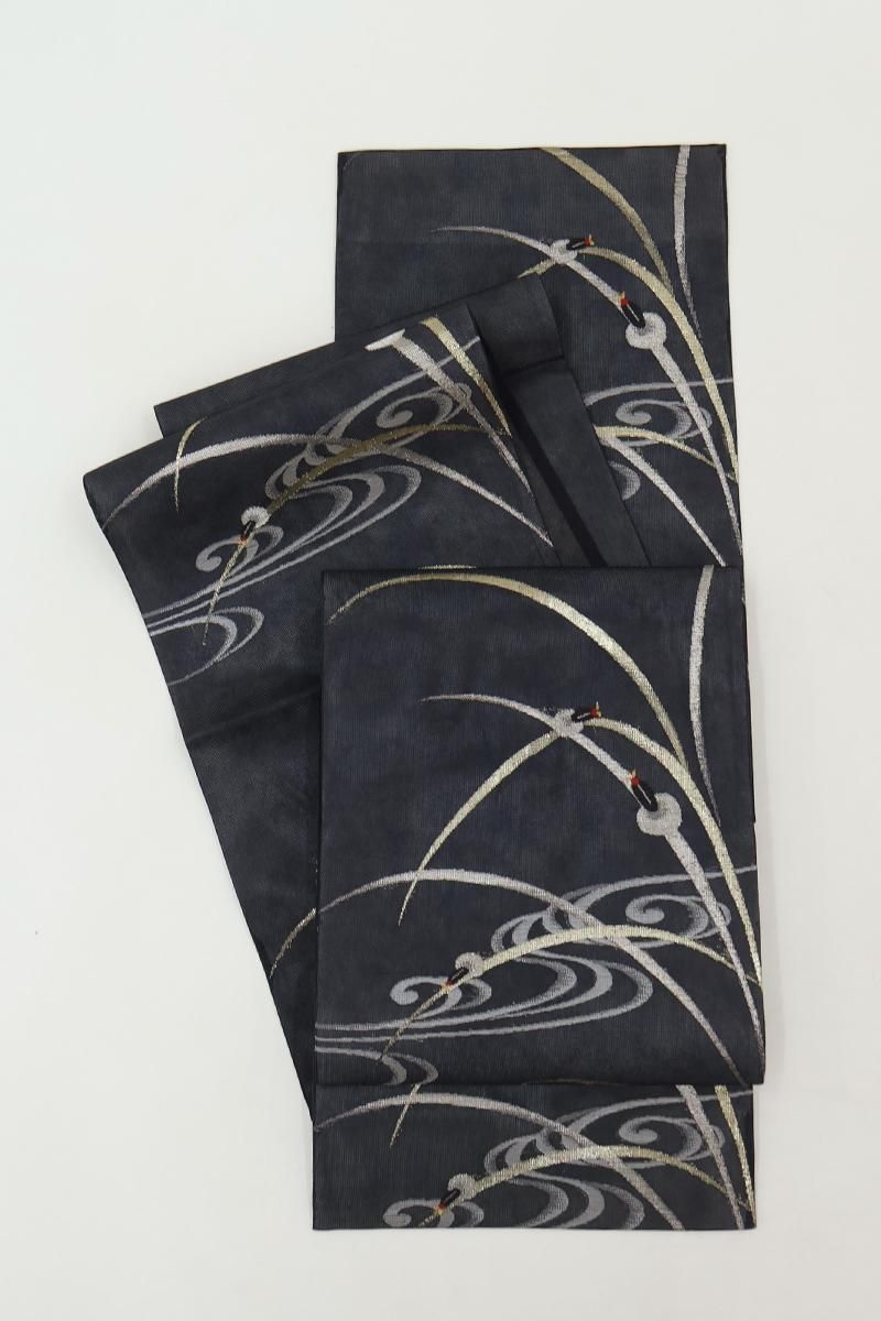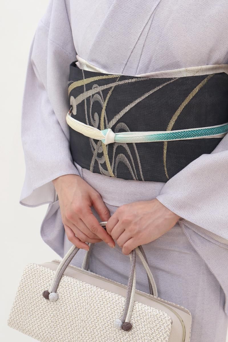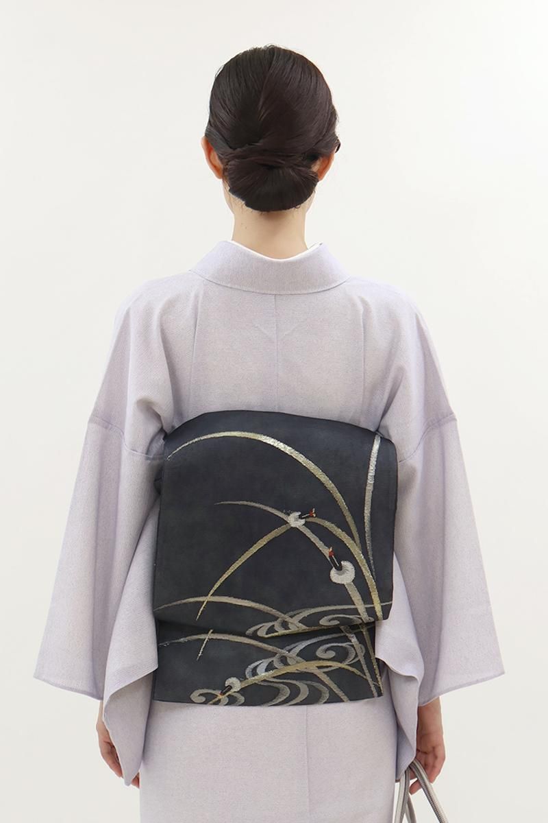 しゃりっとした風合いのシックなお色目に、金銀糸で表現された風情豊かな景色が、見る人の目にも涼やかな風を運ぶ一品、しっとりと落ち着いた色柄ゆきは年齢を問わずにお使い頂けそうですね。色無地や付下げなどに合わせて、涼感を運ぶ装いをお楽しみくださいませ。