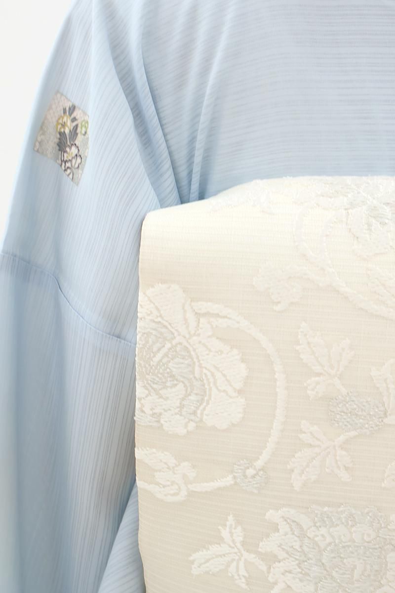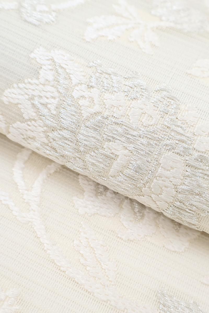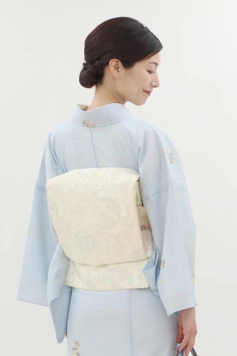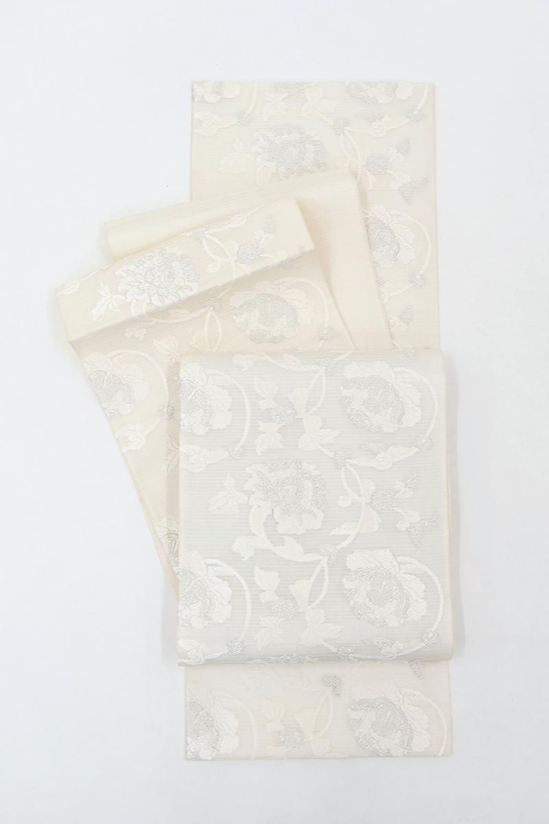 こちらはすっきりとしたオフホワイトの地に、牡丹唐草文を織り出したお品、白と銀のみでおおらかに表現された格調高い古典意匠に清々しい気品が香りますね。透け感の豊かな地風にふっくらとした甘撚りの絹糸の光沢が美しく映え、シンプルながら存在感たっぷりに装いを引き立ててくれることと思います。色無地から付け下げ、訪問着などに合わせて、洗練された着こなしをお楽しみくださいませ。