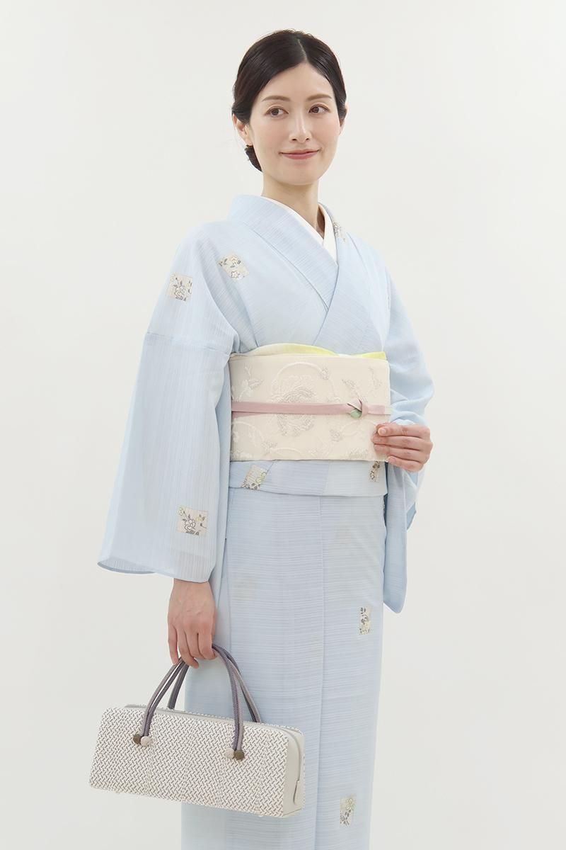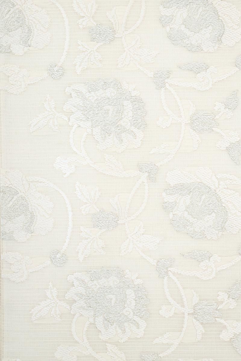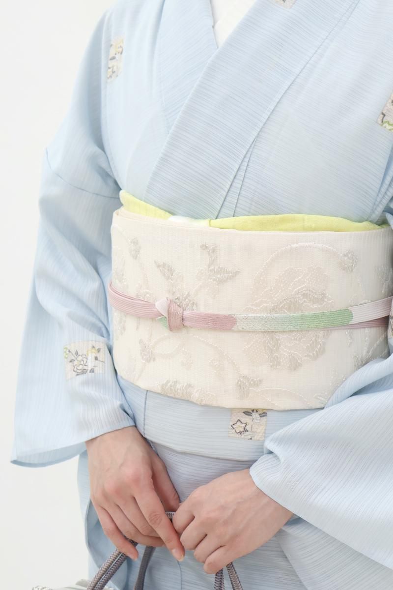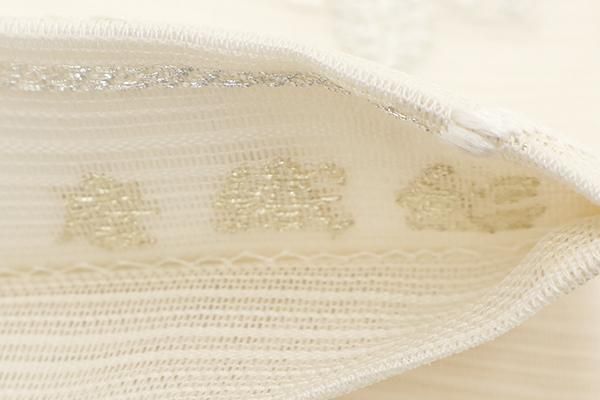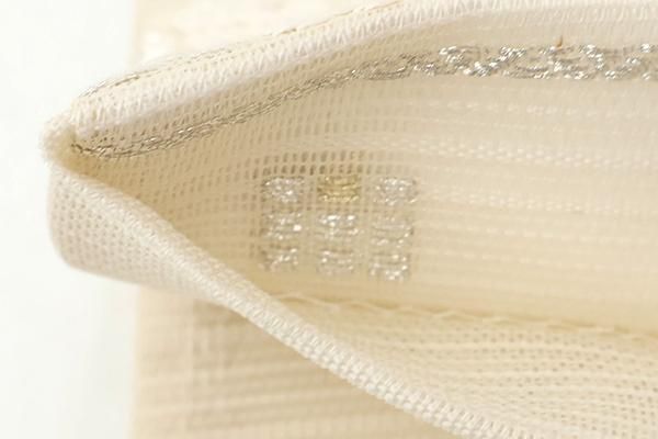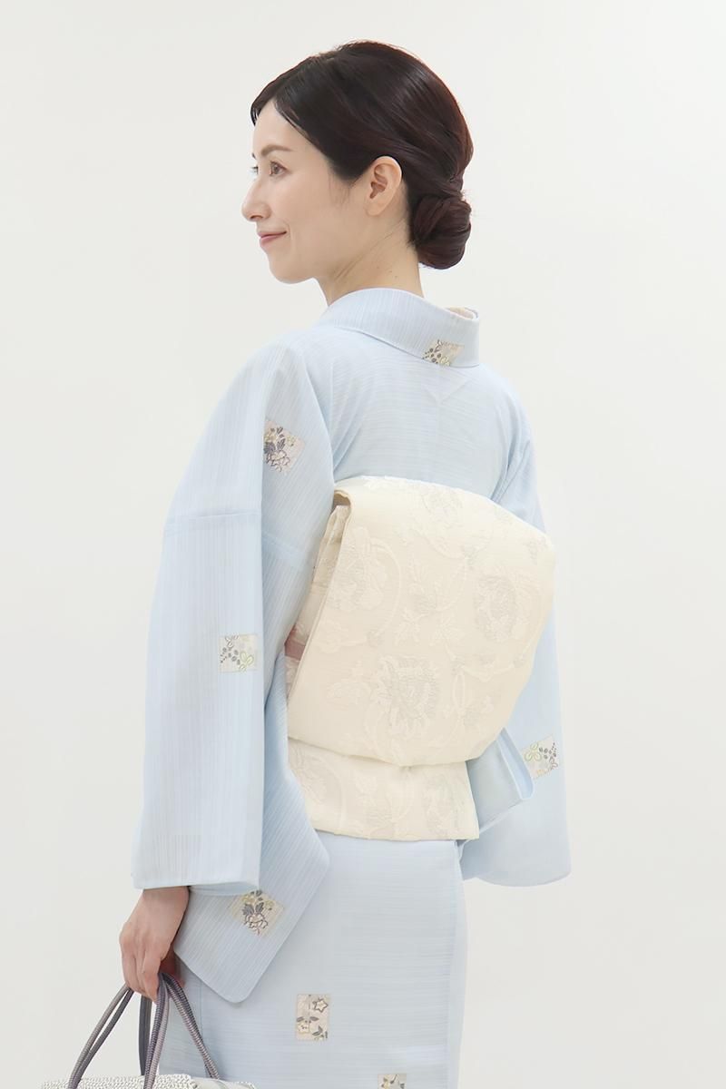 こちらはすっきりとしたオフホワイトの地に、牡丹唐草文を織り出したお品、白と銀のみでおおらかに表現された格調高い古典意匠に清々しい気品が香りますね。透け感の豊かな地風にふっくらとした甘撚りの絹糸の光沢が美しく映え、シンプルながら存在感たっぷりに装いを引き立ててくれることと思います。色無地から付け下げ、訪問着などに合わせて、洗練された着こなしをお楽しみくださいませ。