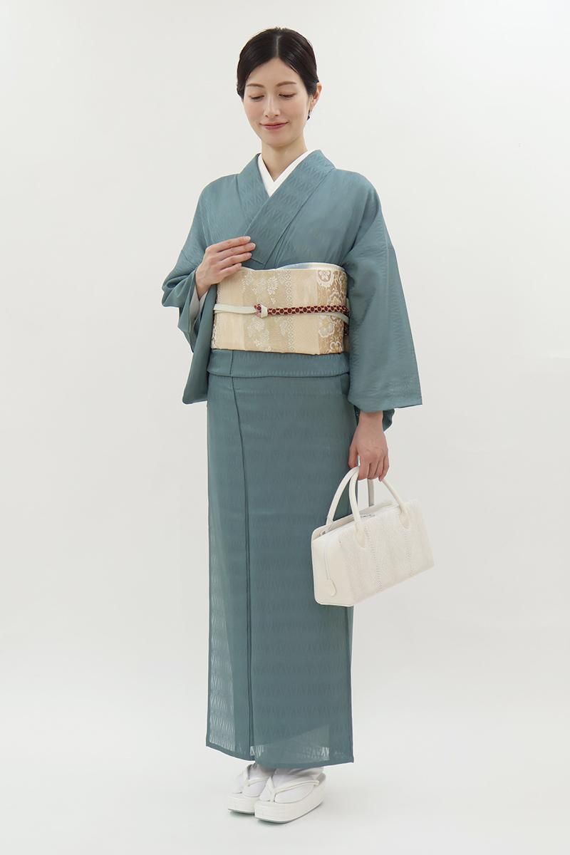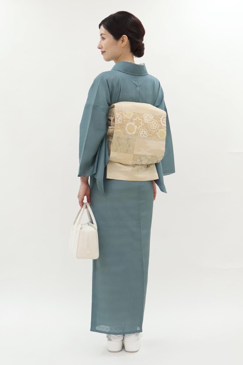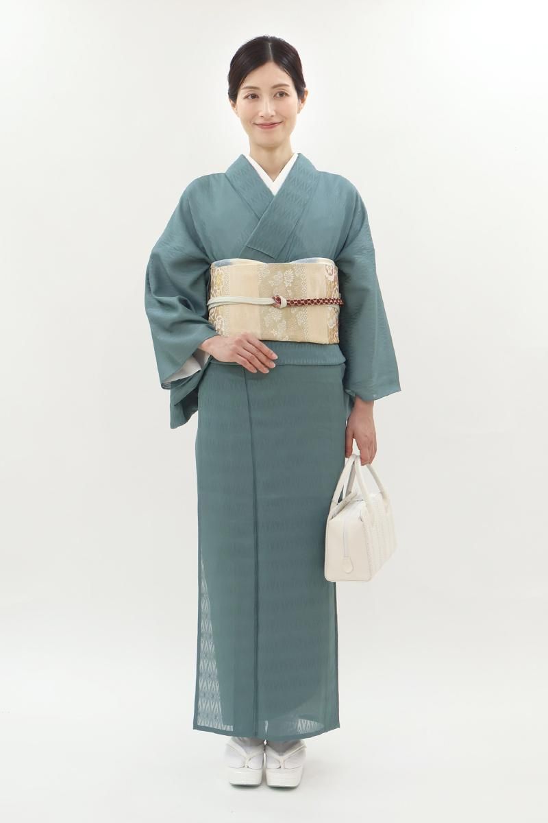 こちらはぐっと落ち着いたお色目に菱の地紋がふわりと浮かび、涼やかな風情を添えるお品、装いを大人の女性らしくしっとりと引き立ててくれそうですね。繍の一ッ紋付きですので、お茶のお席などの改まった場面にも重宝いただける一枚、この機会にいかがでしょうか。