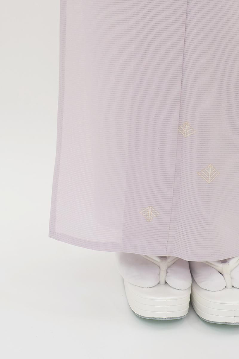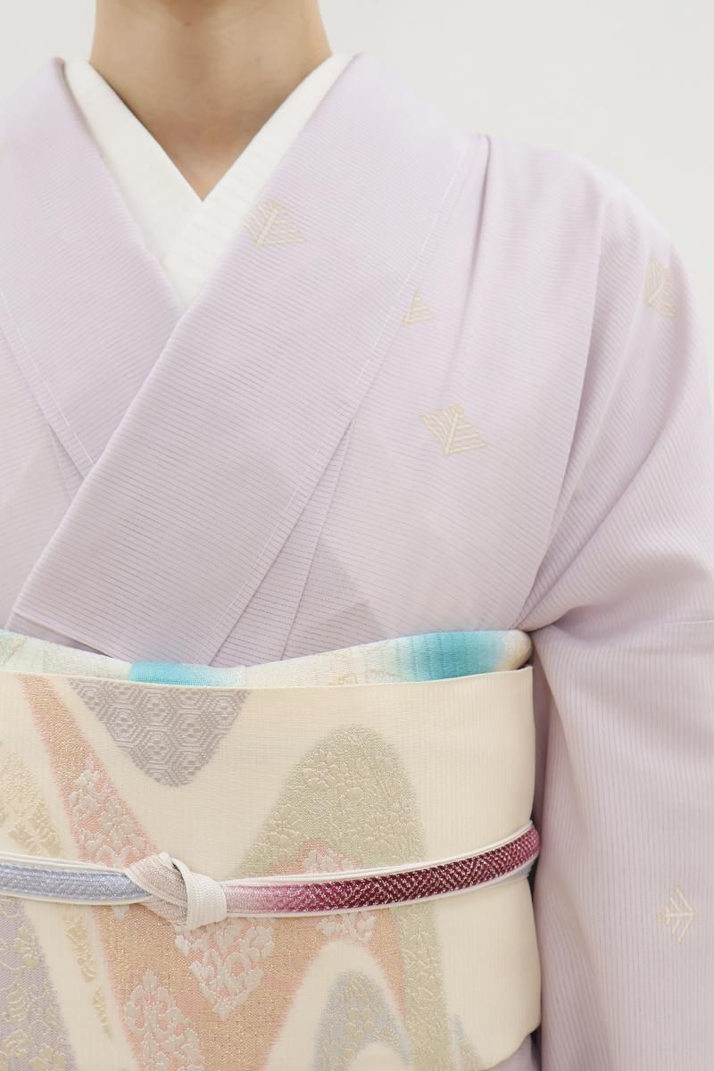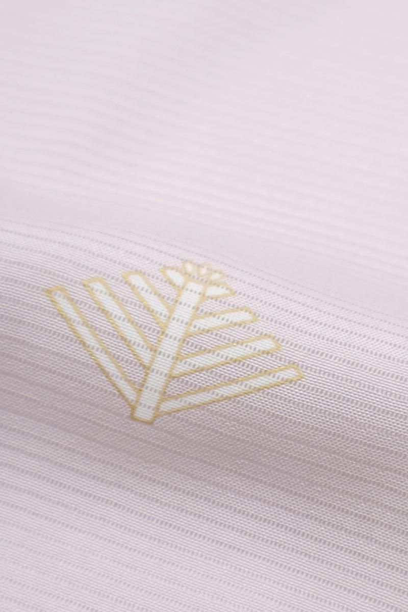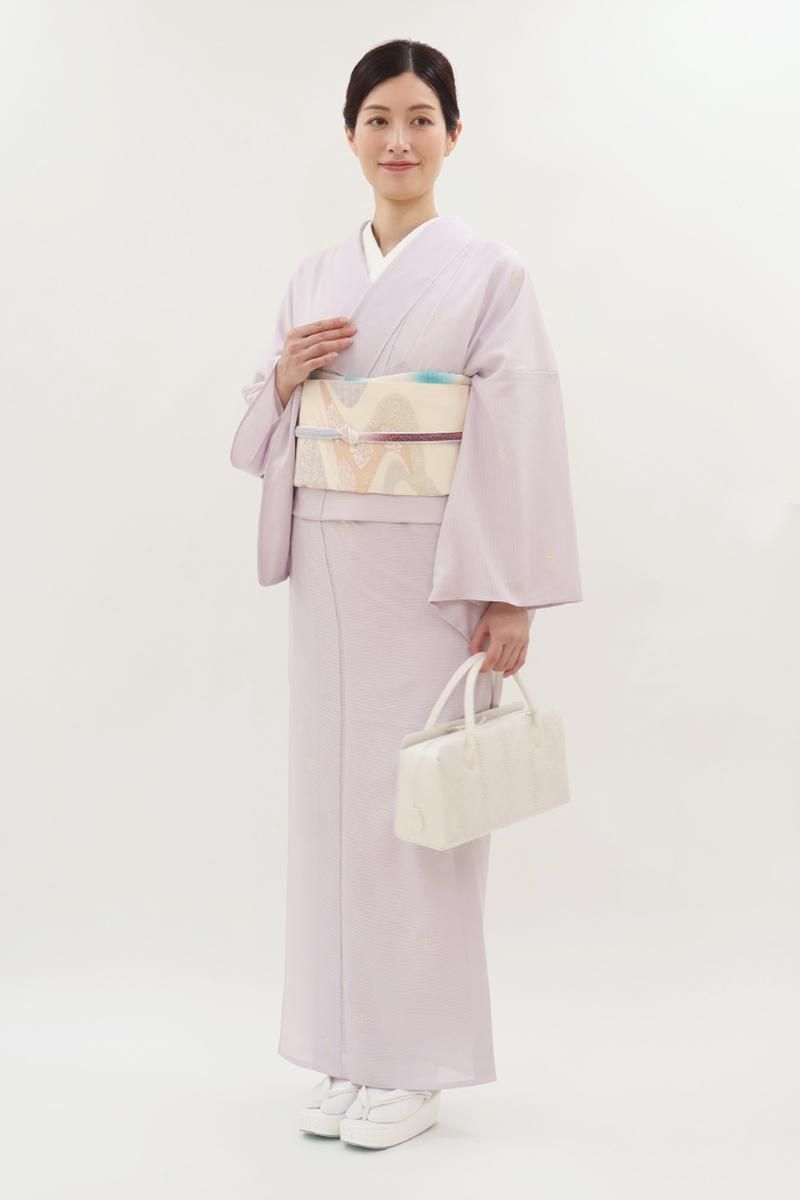 色を薄めたライラック色が近いでしょうか、ほのかに灰みを含んだ明るい薄紫色の地に、小さな松葉文を散らした絽の小紋です。こちらはしっとりと女性らしいお色目に、品良く配された小ぶりな飛び柄の文様が楚々とした気品を添えたお品、装いをはんなりと愛らしい雰囲気で引き立ててくれそうですね。どなたにも好感度の高い装いをお楽しみいただけることと思います。様々な帯合わせでお食事会やお出かけなどにいかがでしょうか。