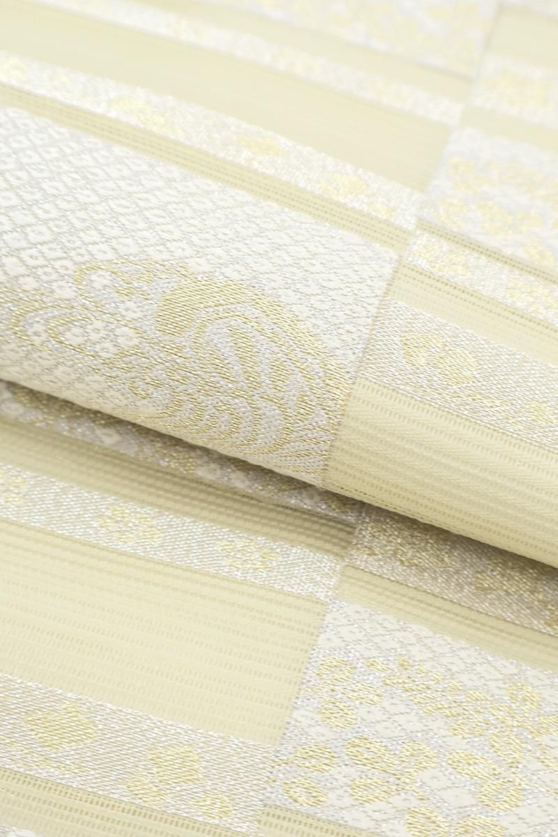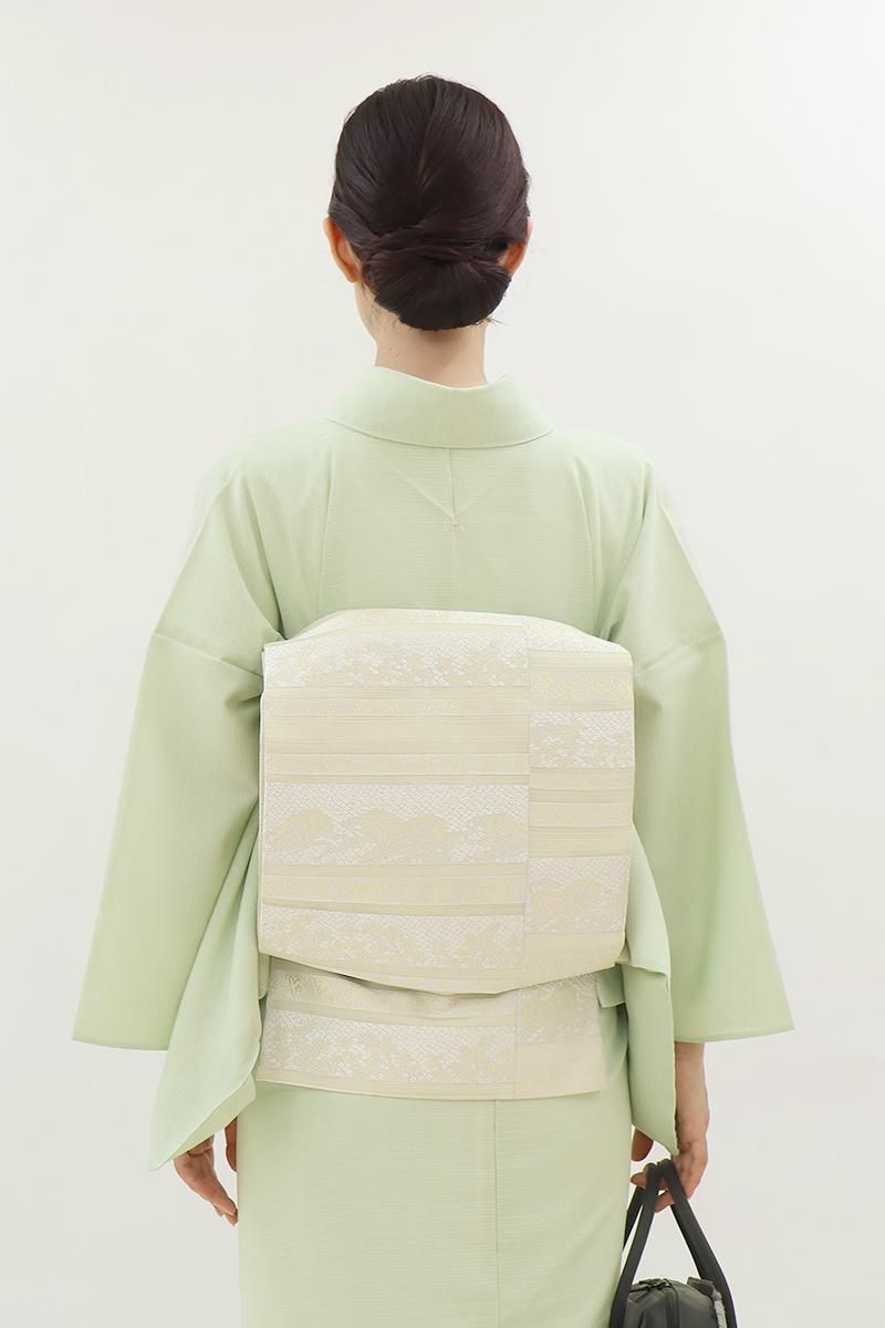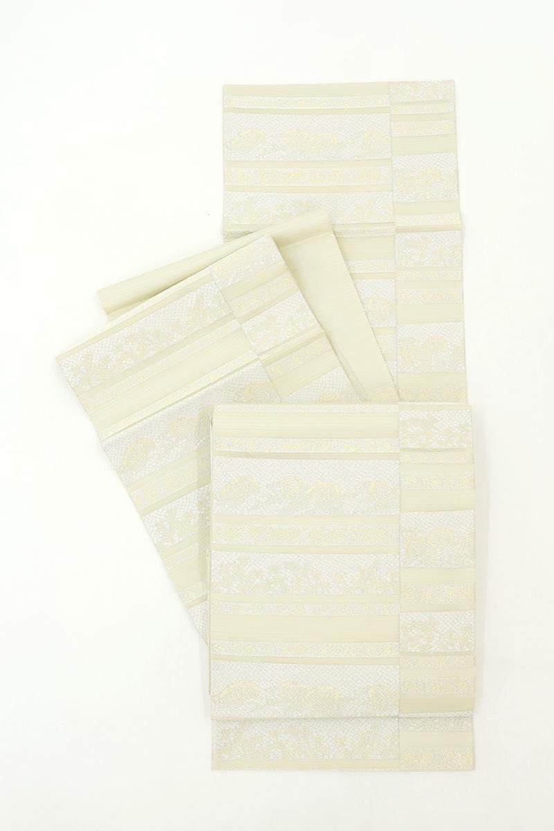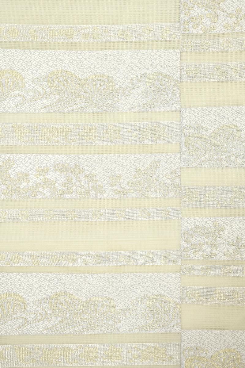 乳白色が近いでしょうか、黄み寄りの白色の地に、変わり段に波や片輪車などを織り出した絽の袋帯です。明るいお色目に金銀糸と白糸のみで表現された古典意匠がすっきりと清楚な印象のお品、装いに季節ならではの涼感を運んでくれそうですね。穏やかな色柄は合わせる着物を選ばず、色無地から訪問着などの装いを品良く引き立ててくれることと思います。夏の改まったお祝いのお席にいかがでしょうか。