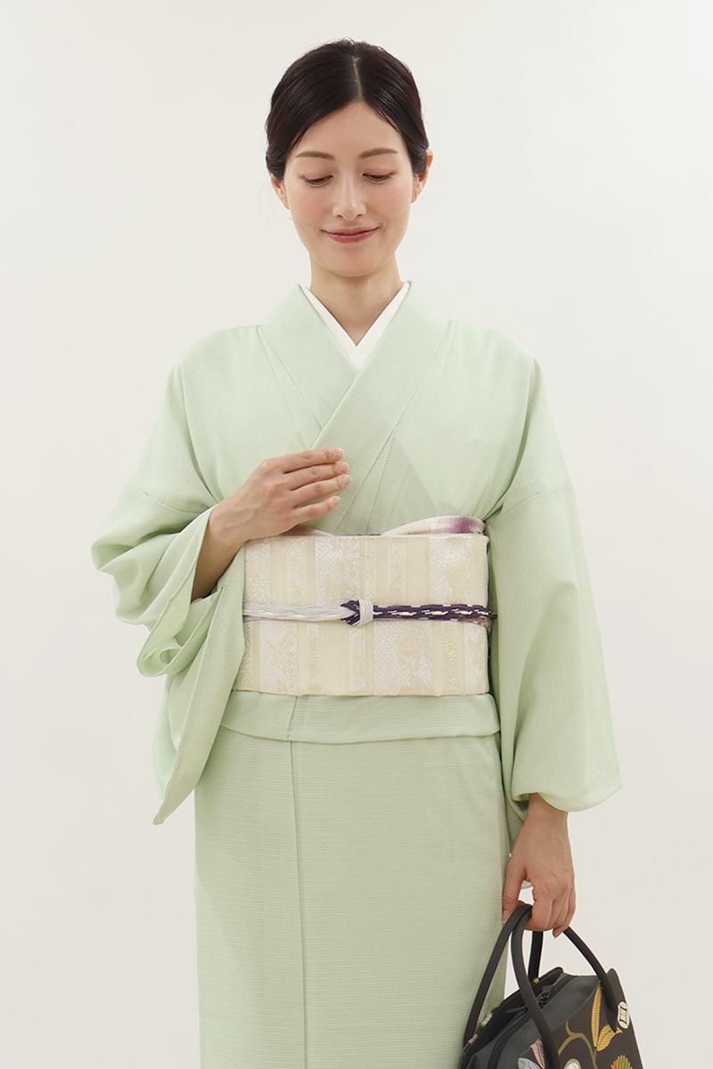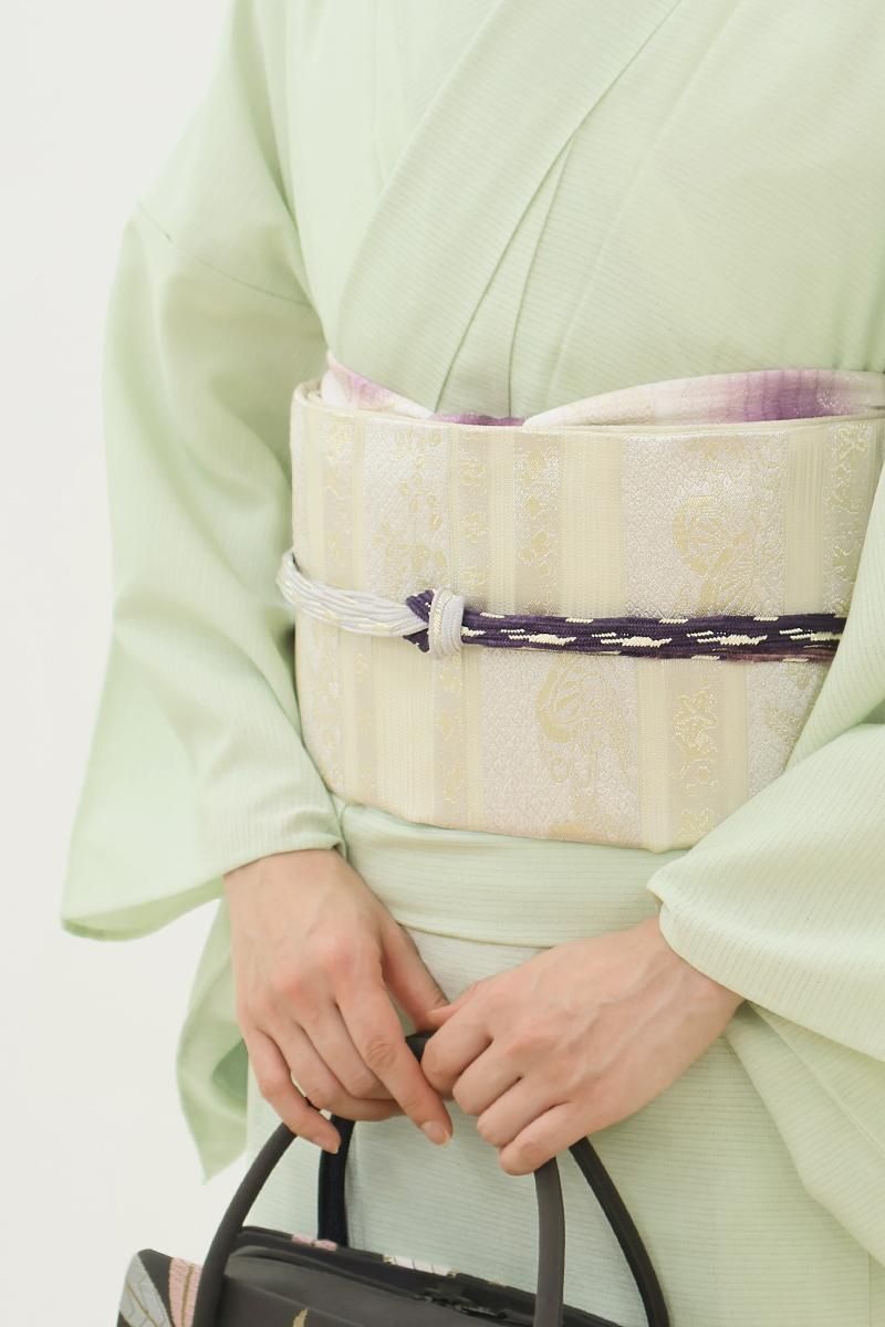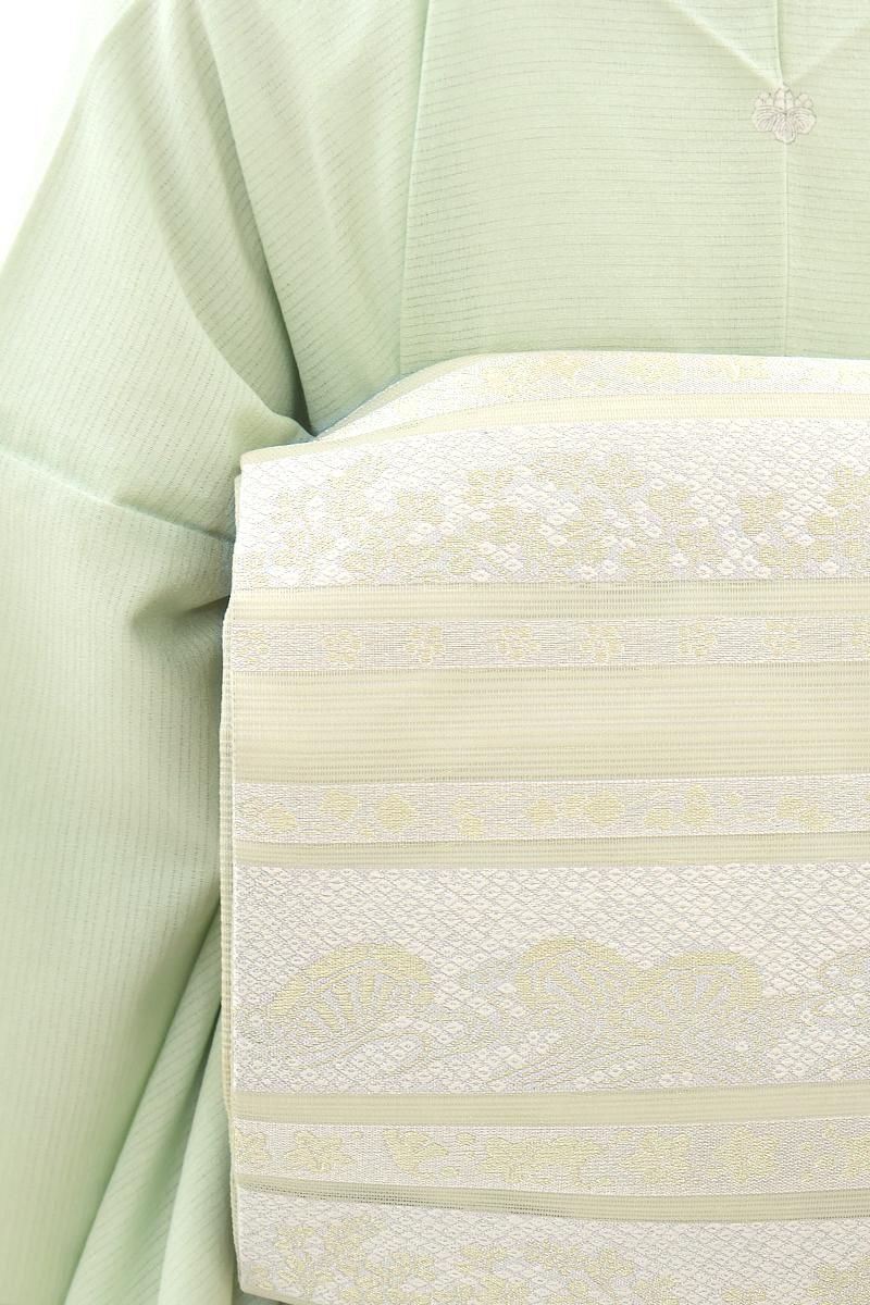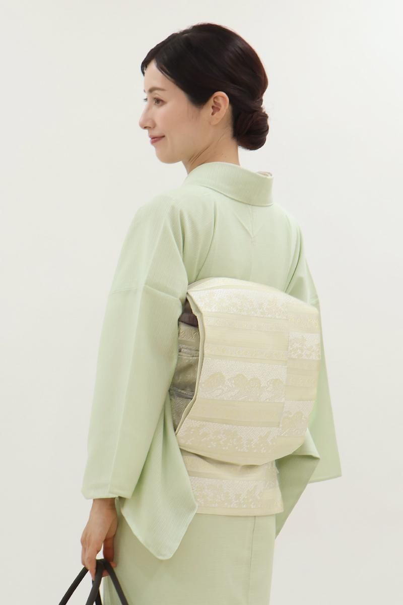 乳白色が近いでしょうか、黄み寄りの白色の地に、変わり段に波や片輪車などを織り出した絽の袋帯です。明るいお色目に金銀糸と白糸のみで表現された古典意匠がすっきりと清楚な印象のお品、装いに季節ならではの涼感を運んでくれそうですね。穏やかな色柄は合わせる着物を選ばず、色無地から訪問着などの装いを品良く引き立ててくれることと思います。夏の改まったお祝いのお席にいかがでしょうか。