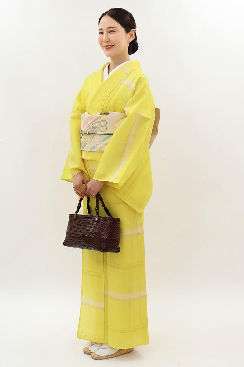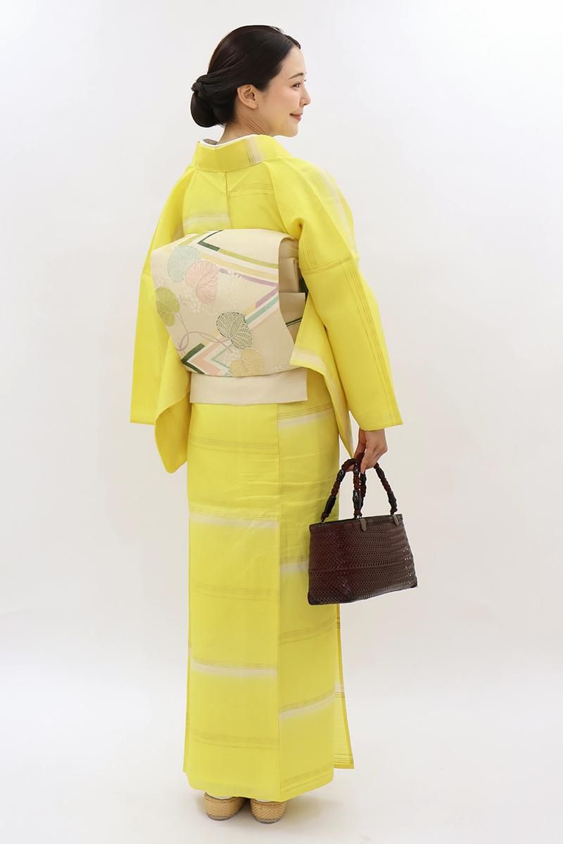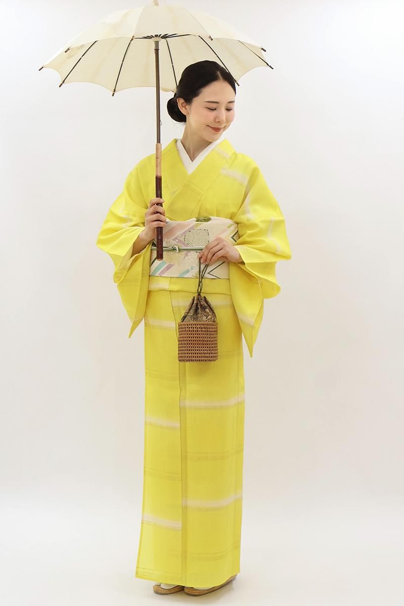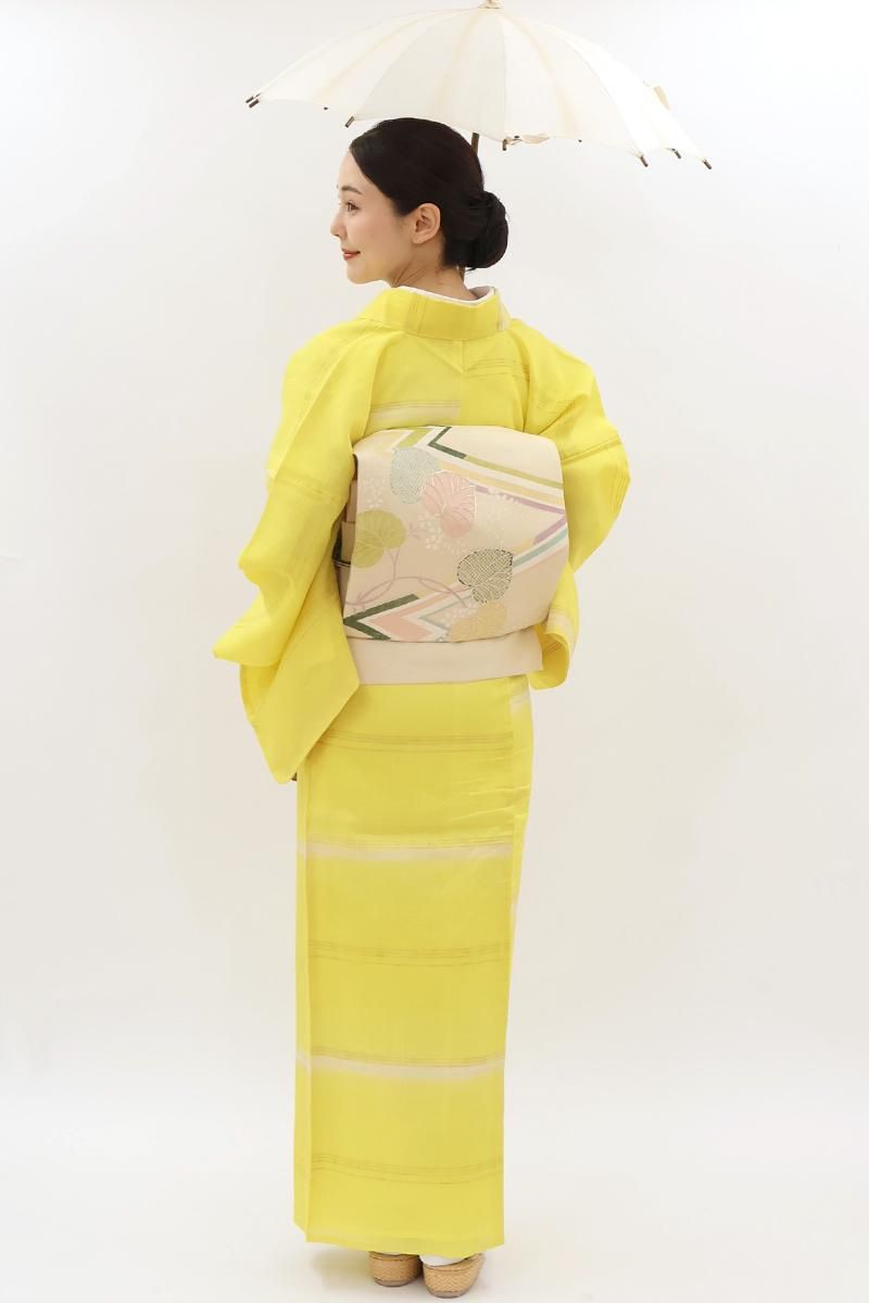 ぱっと目を惹く鮮やかなお色目が夏らしい雰囲気のお品、透け感のある軽やかな生地が風をはらみ、涼やかな着心地をお楽しみいただけることと思います。季節の染め帯や洒落袋帯など、様々な帯合わせで街着やお稽古、夏のお出かけなどにいかがでしょうか。