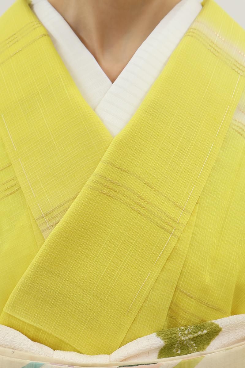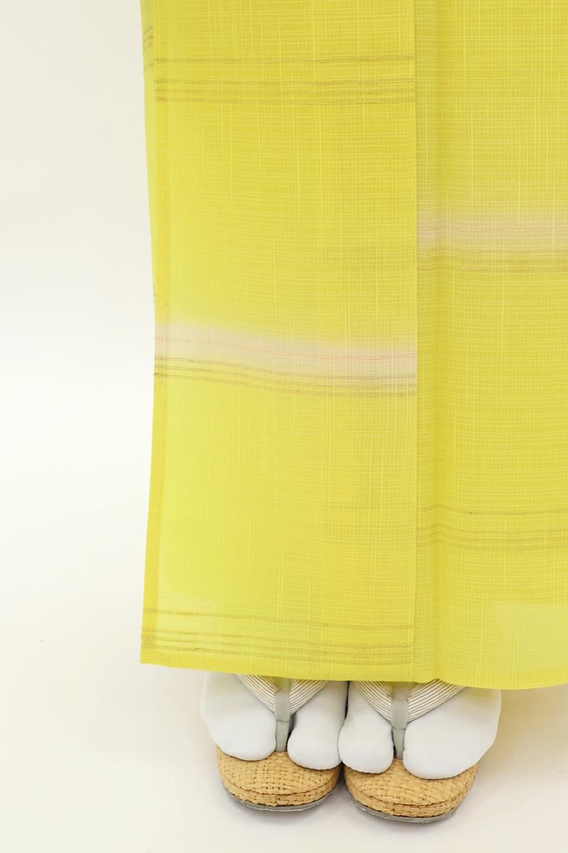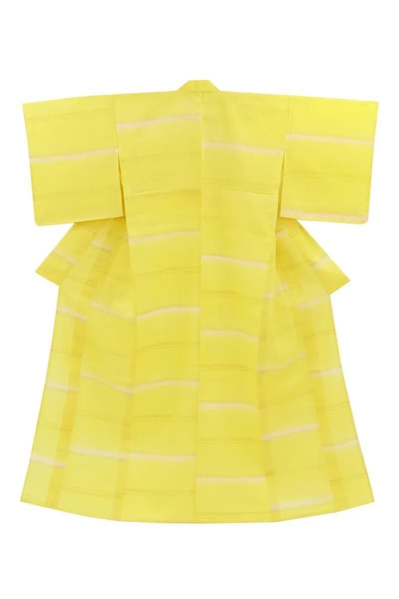 明度を上げたレモン色が近いでしょうか、明るい黄色の夏紬地に横段暈かしを配した小紋です。