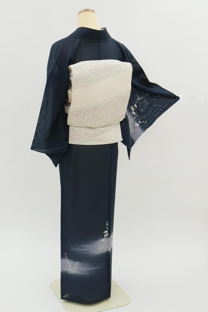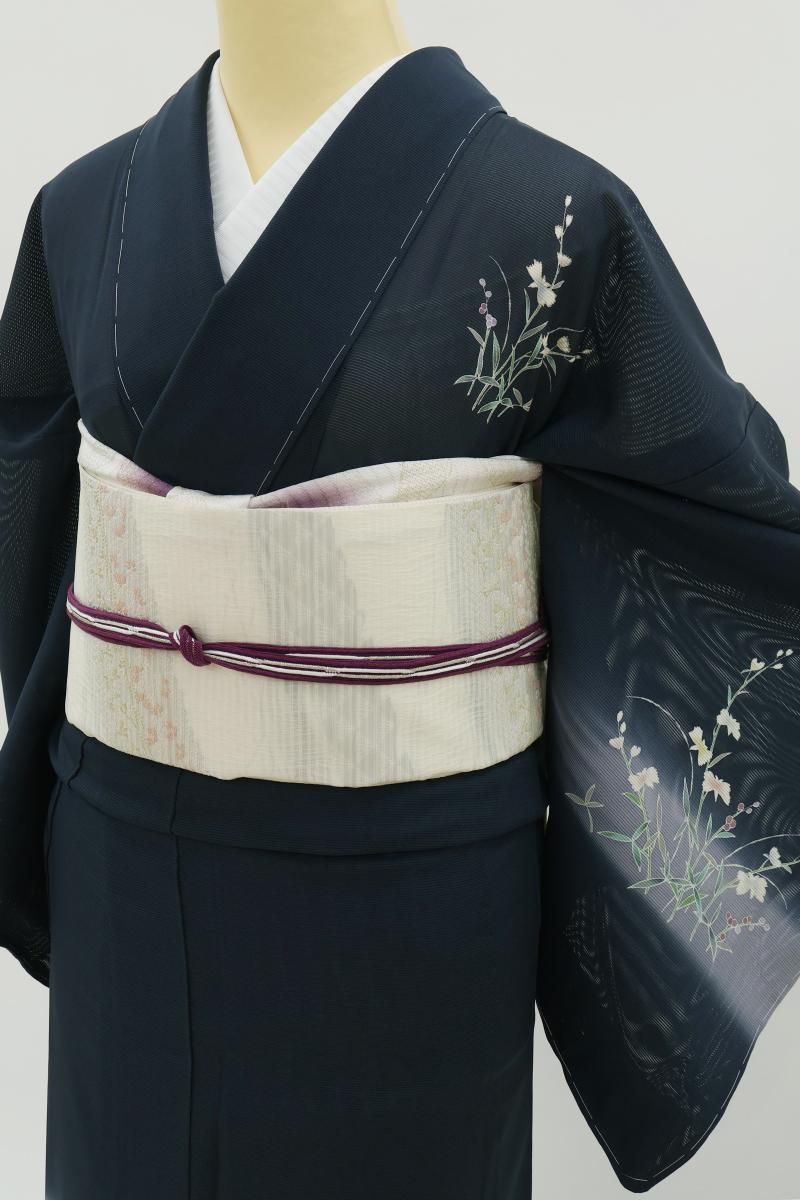 きりりとした深いお色目に優しいパステルカラーで表現された楚々とした花の姿がしっとりとした華やぎをみせるお品、銀彩の縁取りが涼感と気品を添え、凛とした着姿を創り出してくれそうですね。お茶席などの改まった場面やお呼ばれなどにいかがでしょうか。