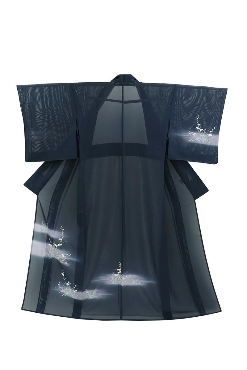 青鈍色が近いでしょうか、僅かに灰みを含んだ紺色の地に鷺草などの図を配した絽の付下げです。