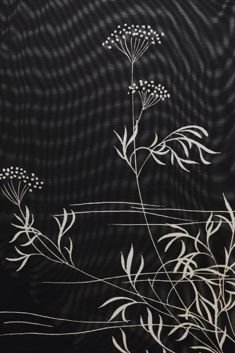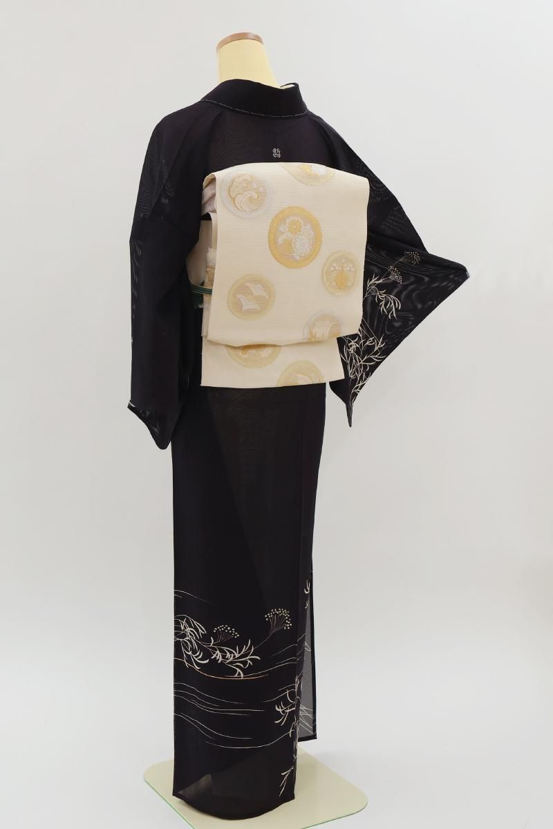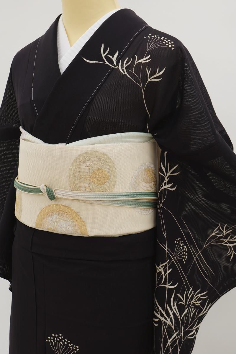 シックな地色にぐっと彩りを抑えて表現された風情ある景色に大人の女性の風格が感じられるお品、すっと走る金駒刺繍の輝きと立体感が気品と奥行きを添えていますね。夏の改まった場面やパーティなどに瀟洒な装いをお楽しみくださいませ。