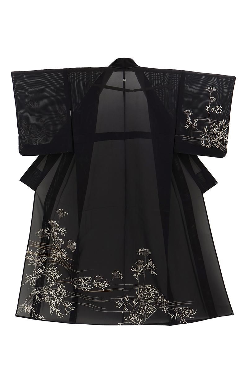 青みの黒色の地に、女郎花などの秋草の図を描いた絽の付下げです。