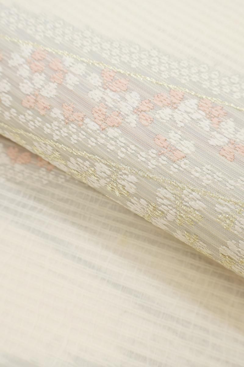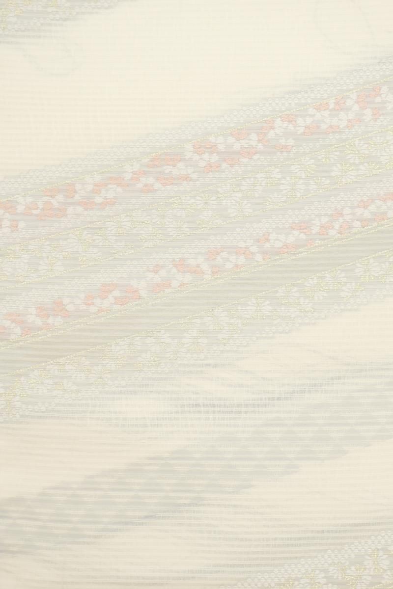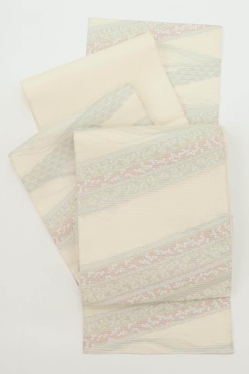 乳白色が近いでしょうか、ゆらぎのある表情のオフホワイトの地に、斜め段に白やピンク、薄グレーで桜や菊の小花や疋田、鱗などを配した夏の袋帯です。