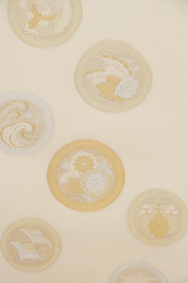 明るいクリーム色の地に波や揚羽蝶などをあしらった狂言の丸を織り出した絽の袋帯です。