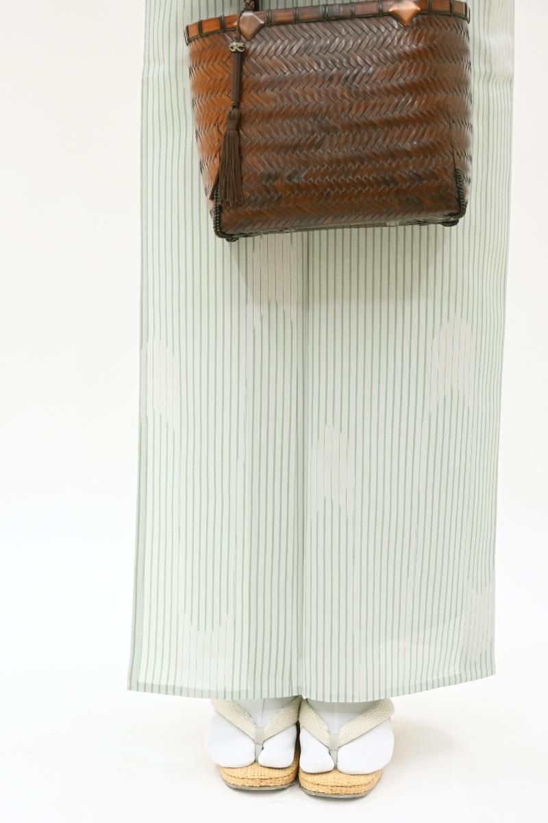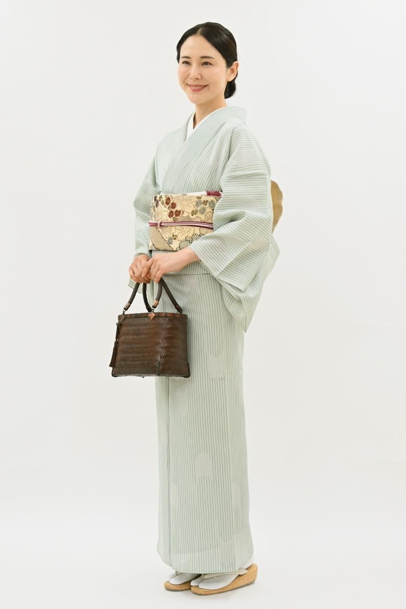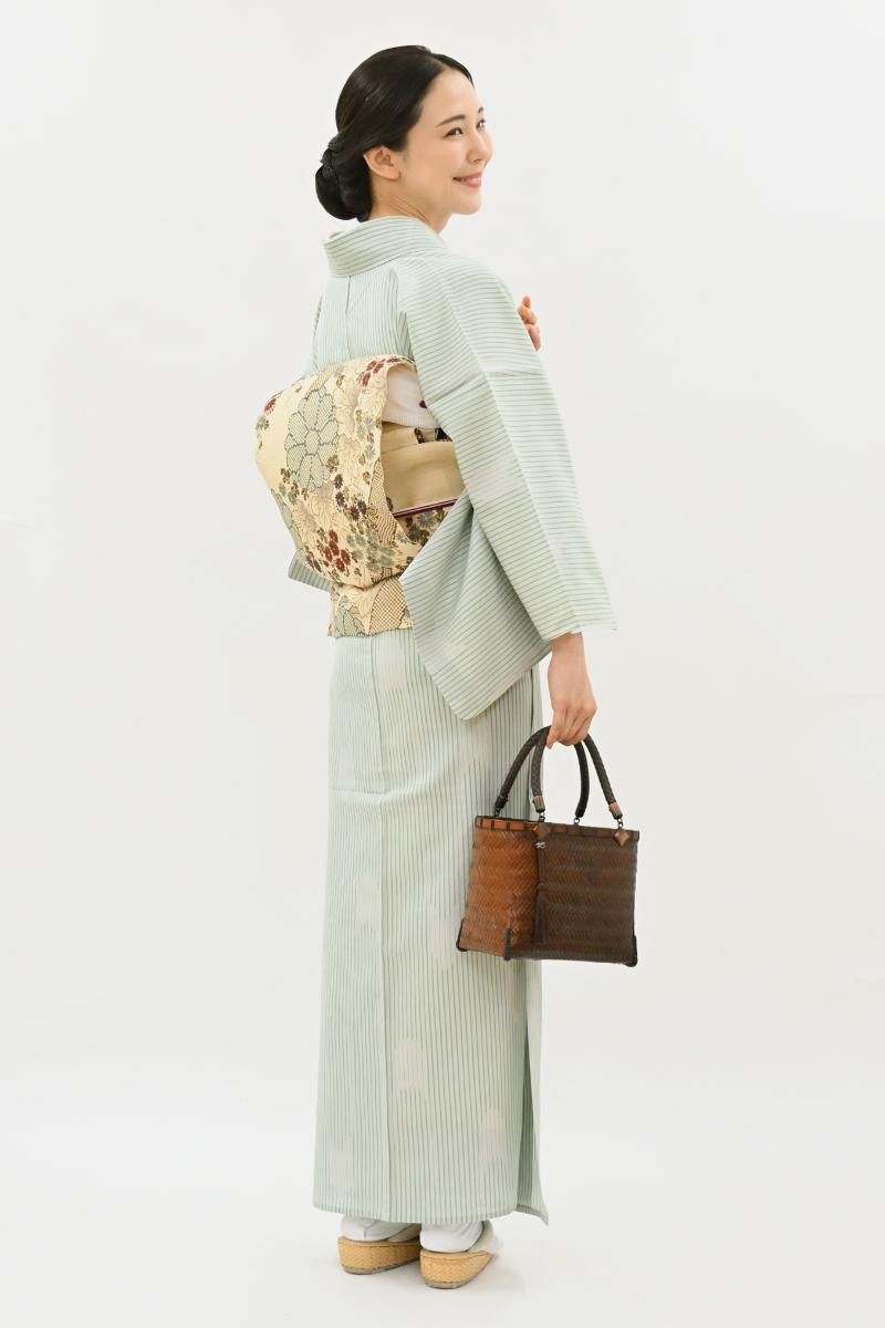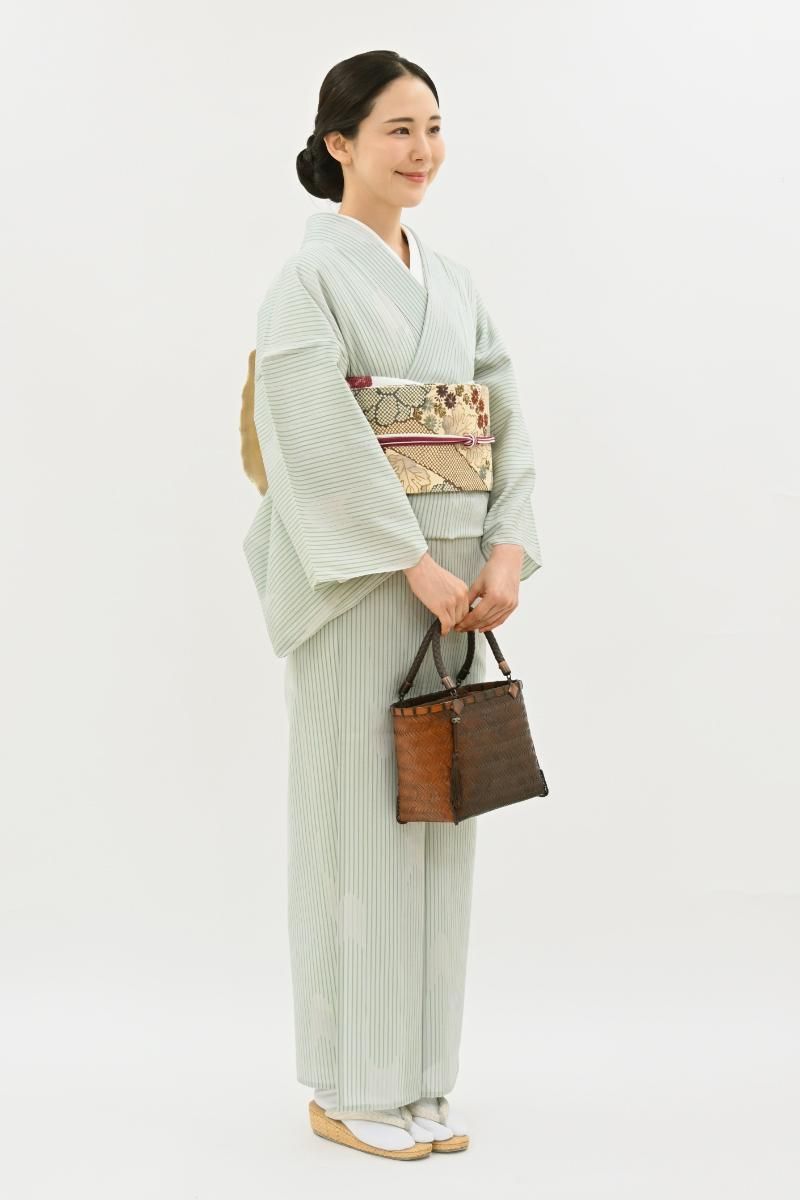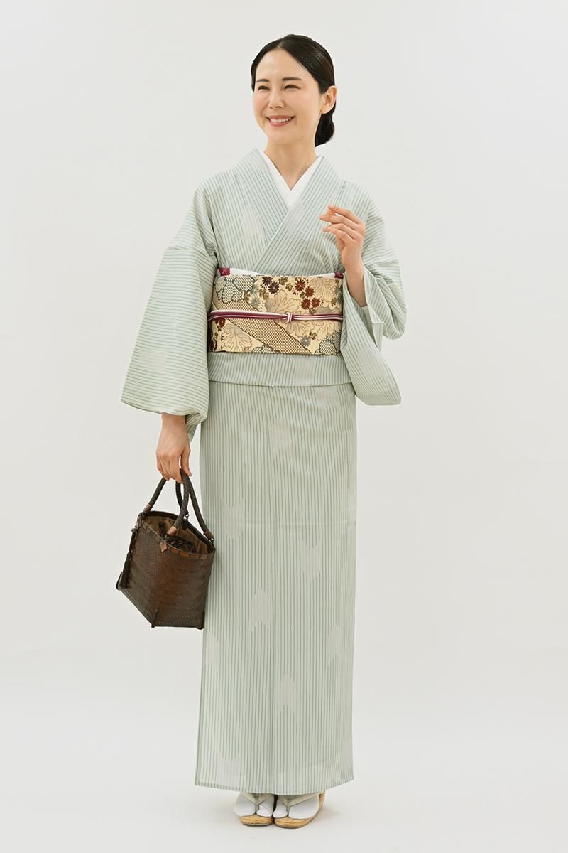 蝉の羽にも例えられる軽やかな美しさは明石縮ならではですね。すっきりと洗練された印象の色柄ですので着る方の年代も幅広く、夏を通して気軽にお召し頂けることと思います。お友達とのお出かけや街着などにいかがでしょうか。