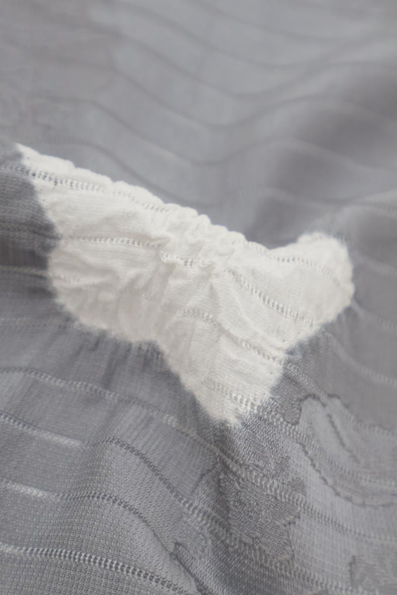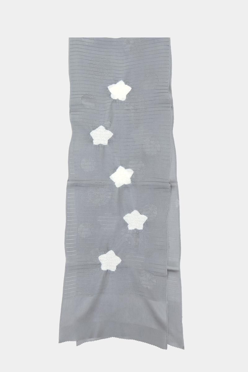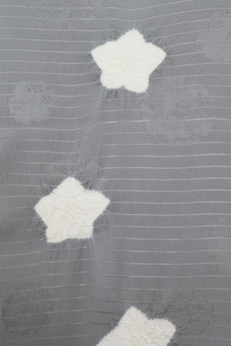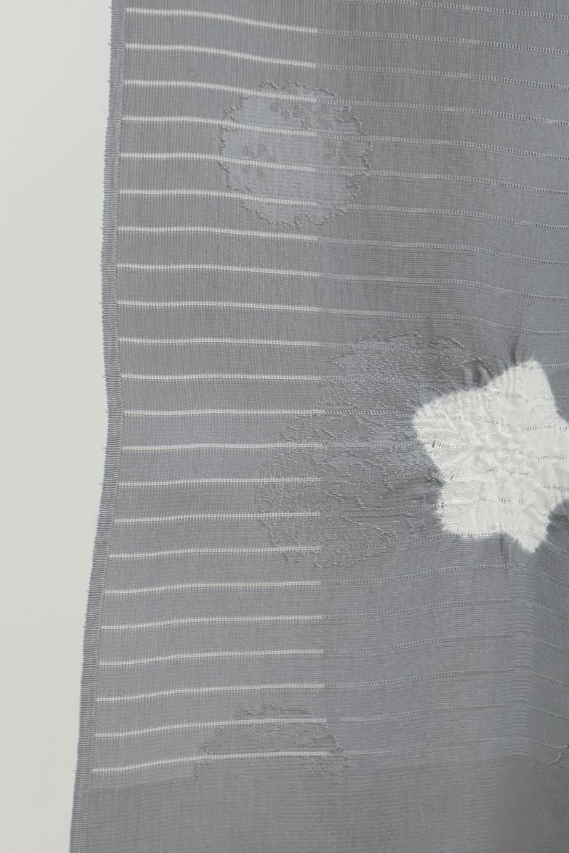 こちらは雪輪の地紋が織り出された地に、桔梗を散らした飛び絞りのお品。胸元やお太鼓脇からちらりと覗く美しい彩りが、装いに優しい趣きを添えてくれますね。お色目は薄いグレーにすっきりとした白色、装いをシックに引き立てる一枚です。飛び絞りならではのはんなりとした華をお楽しみ下さいませ。