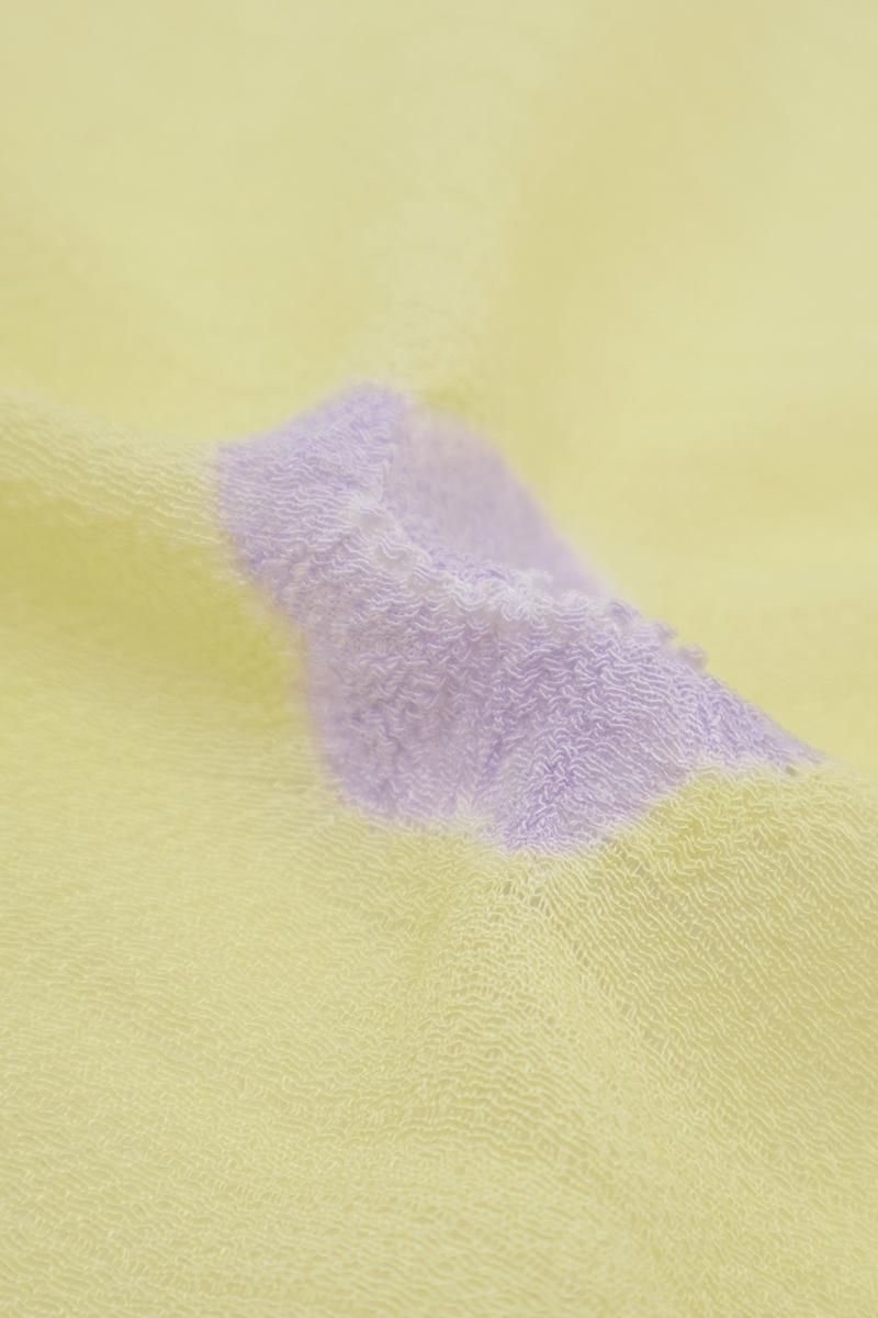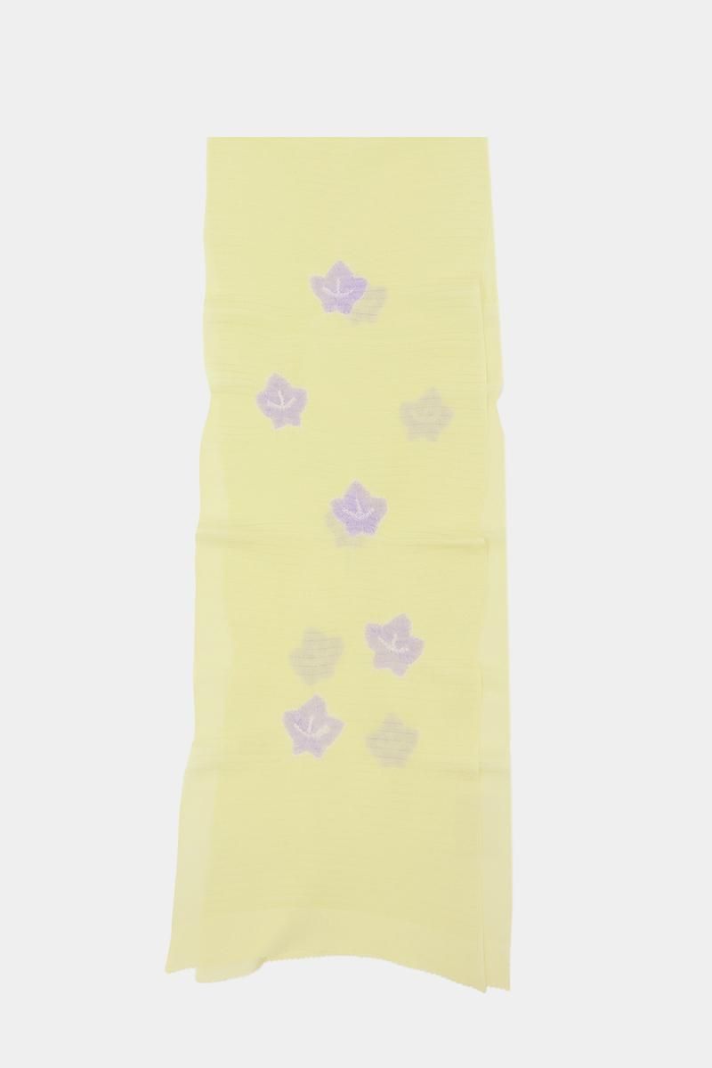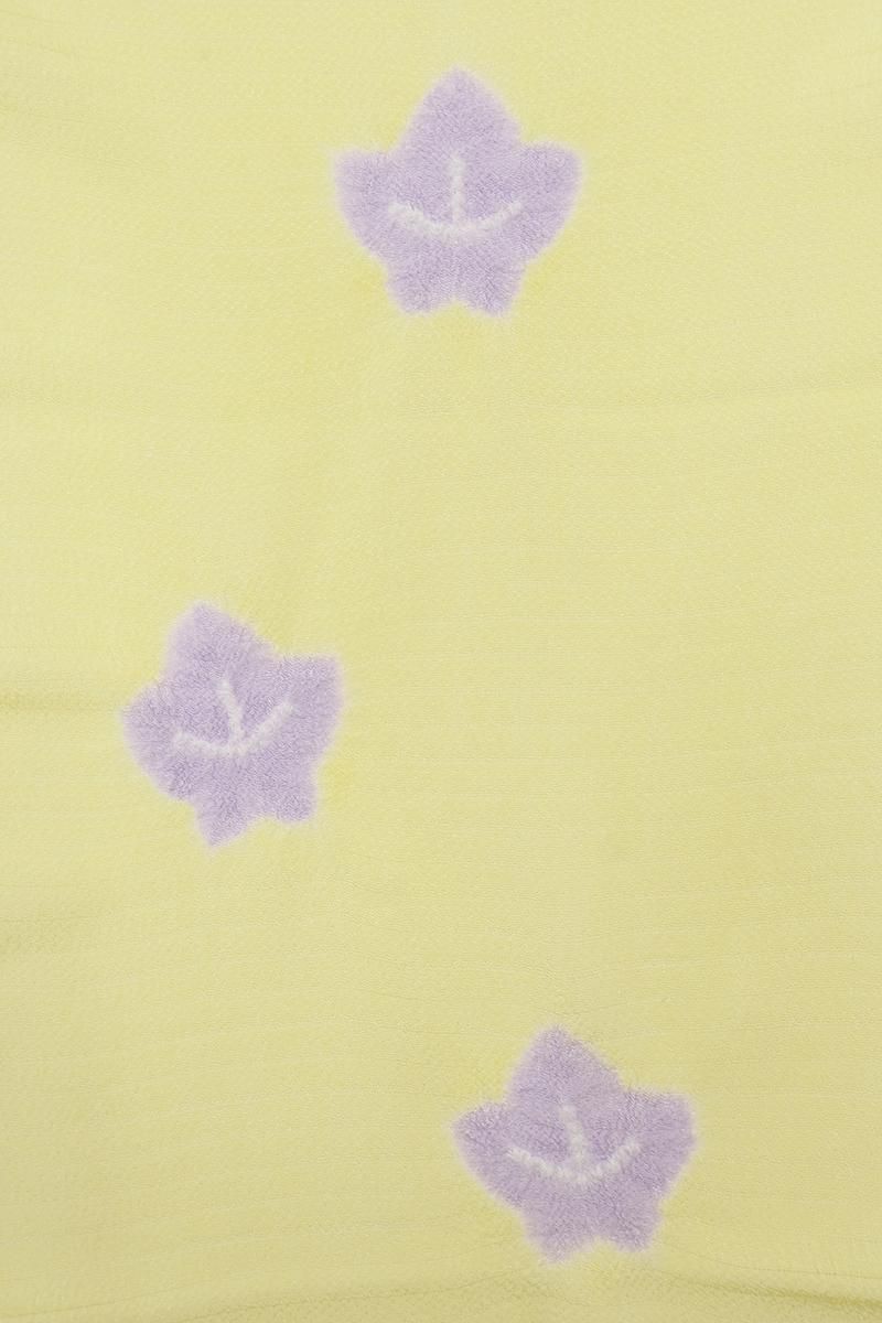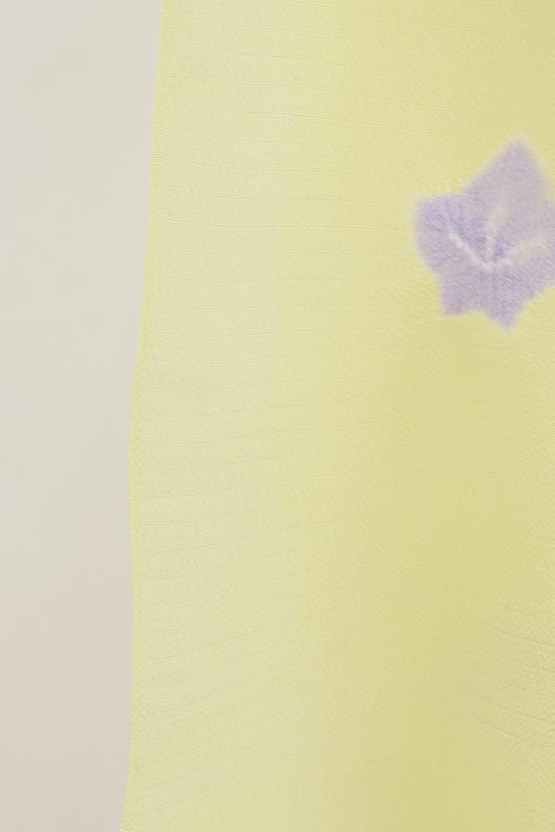 こちらは絽縮緬の地に、大らかな桔梗の花のかたちを散らした輪出し絞りのお品。胸元やお太鼓脇からちらりと覗く美しい彩りが、装いに優しい趣きを添えてくれますね。お色目は淡い黄色地に薄い紫色、装いを上品に引き立てる一枚です。飛び絞りならではのはんなりとした華をお楽しみ下さいませ。