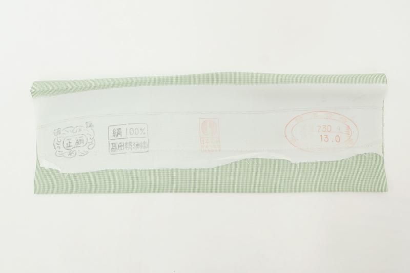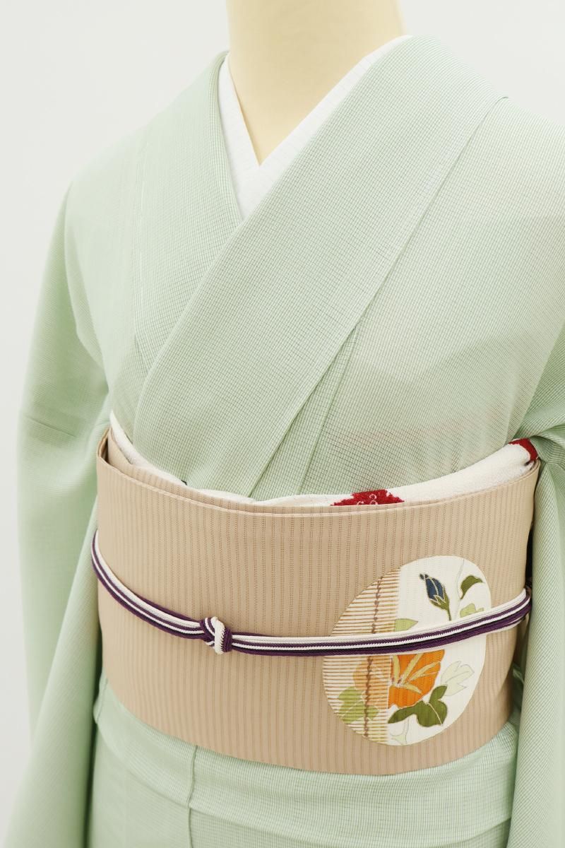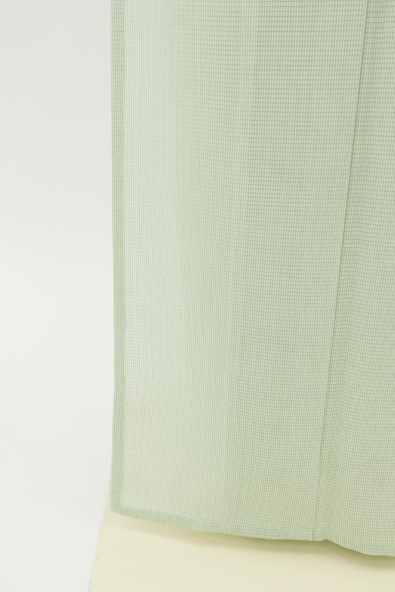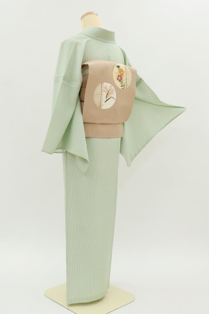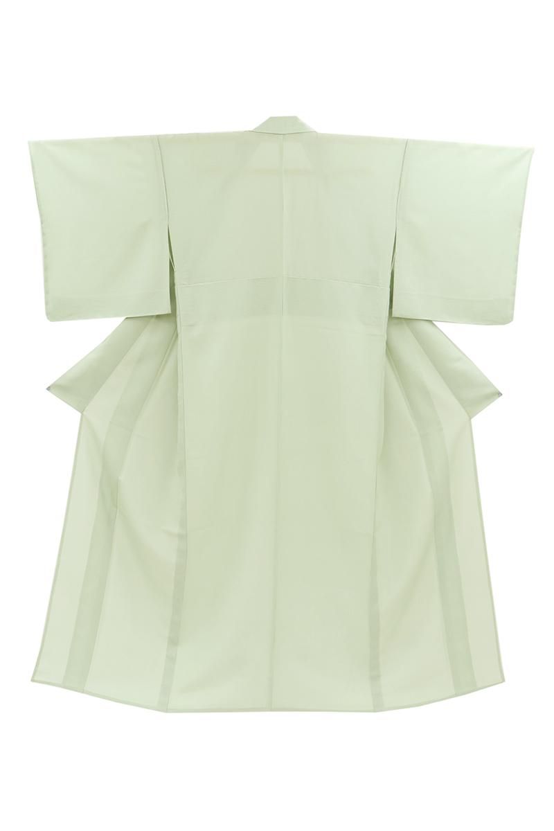 白緑色が近いでしょうか、ほのかに灰みを含んだ薄緑色の地に万筋を染めた絽の江戸小紋です。合わせる帯次第で様々なお席に対応できる細やかな柄行きの江戸小紋は一枚ご用意いただくと何かと重宝なもの、爽やかなお色目は帯の背景としても活躍してくれそうですね。季節の染め帯を合わせて気軽な街着に、また少し格高の袋帯などを合わせればお茶の席など、幅広い場面でお楽しみいただけることと思います。この機会にいかがでしょうか。