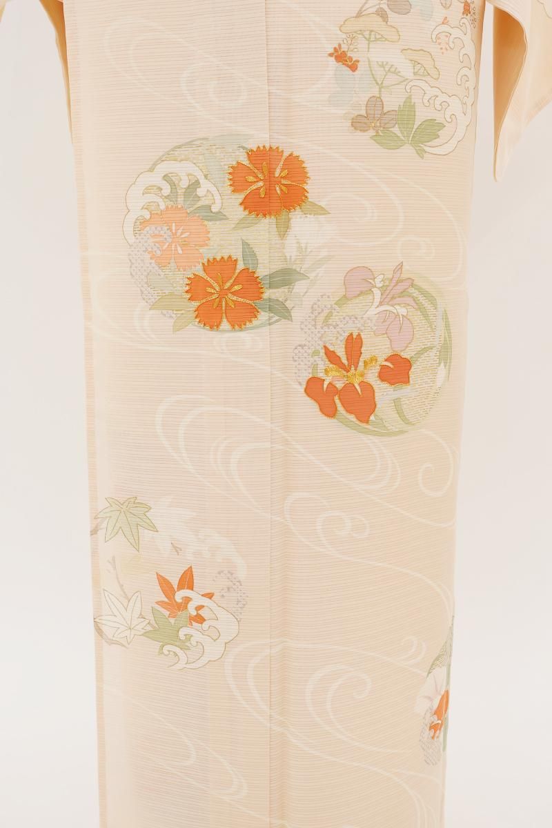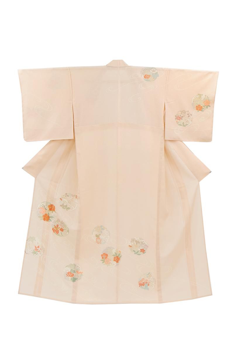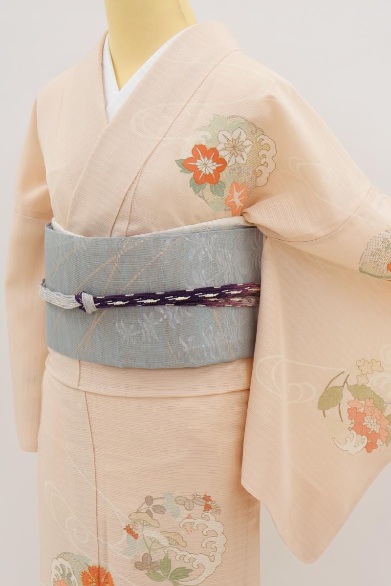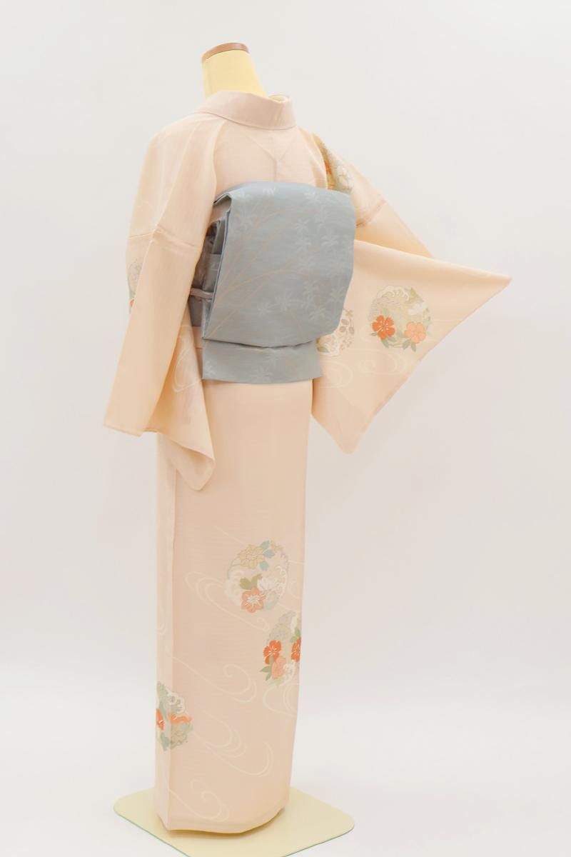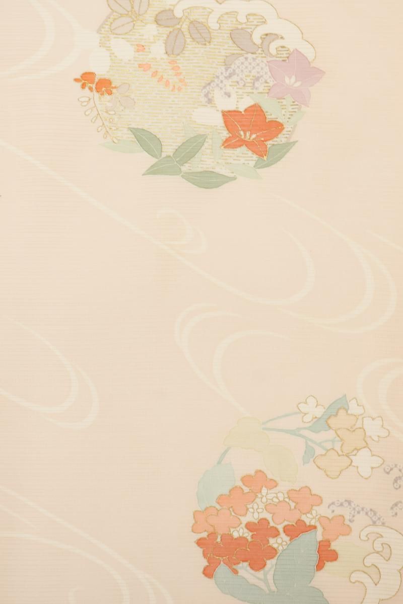 淡いピンク色の乱絽地に、ゆったりとした流水に紫陽花や鉄線、撫子や波の丸を配した訪問着です。