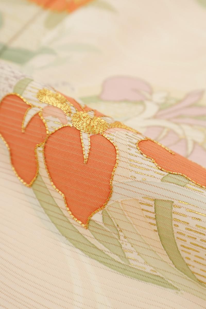 女性らしく優しいお色目に、甘さのある彩りで表された意匠がはんなりとした趣のお品、金彩や金糸の煌めきが華を添え、着姿を上品に引き立ててくれそうですね。染め下地には伊と幸さんの上質な生地が使用された一枚、夏のパーティや改まったお席にいかがでしょうか。