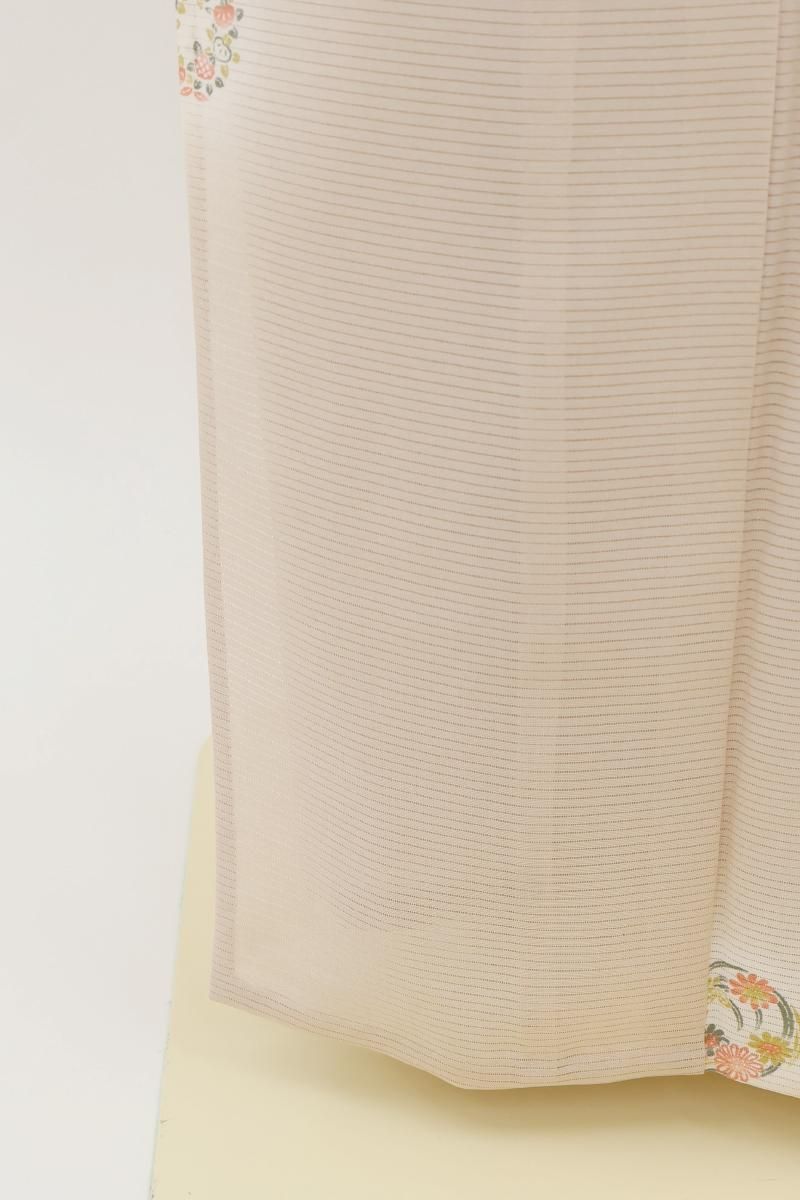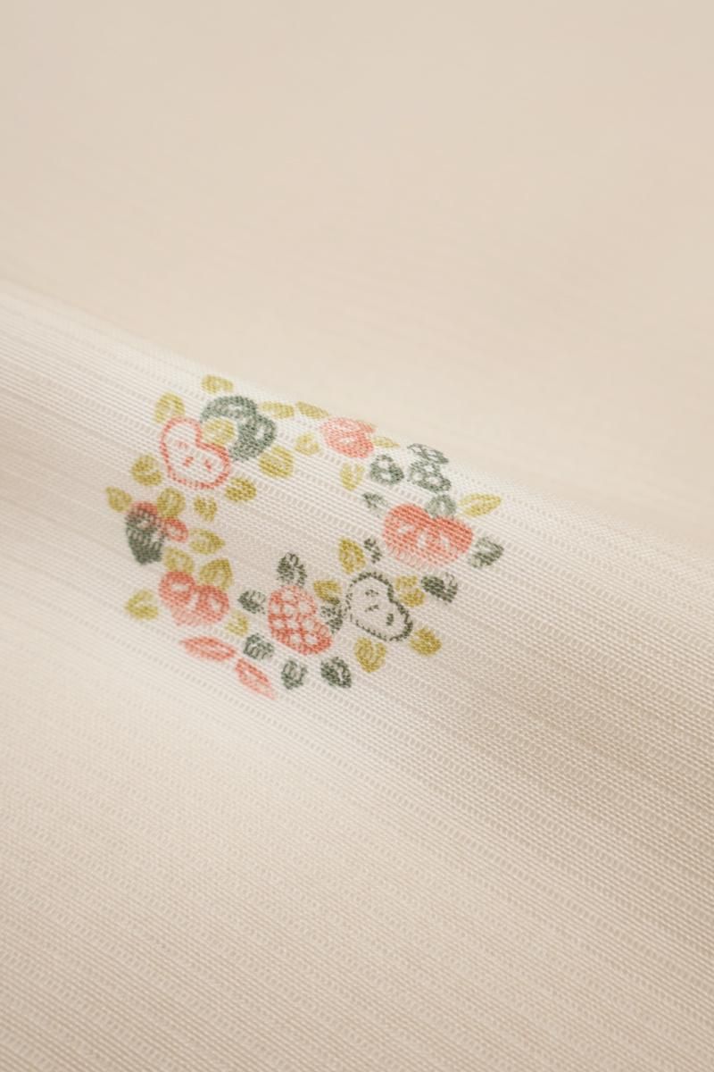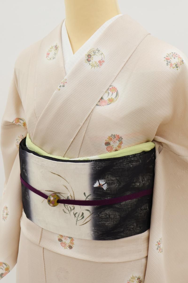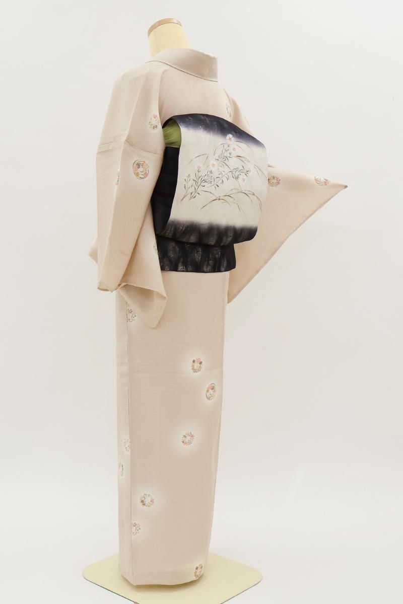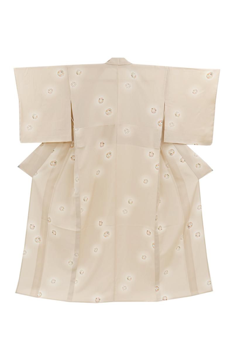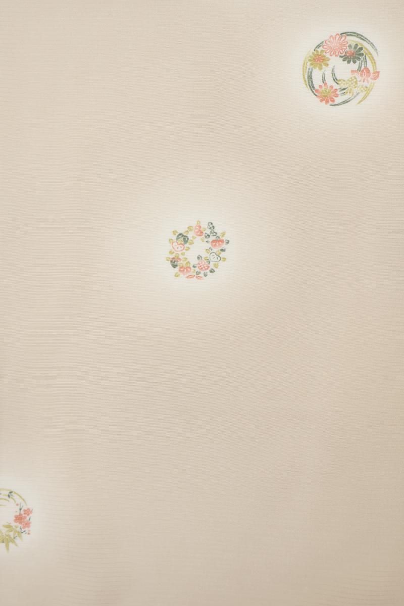 薄香色が近いでしょうか、灰みを含んだピンクベージュの地に、菊や橘、菖蒲など四季折々の花木の丸を散らした小紋です。