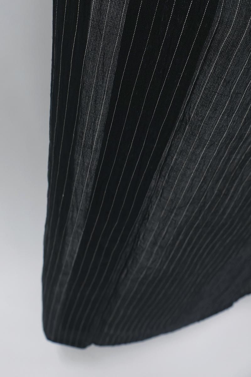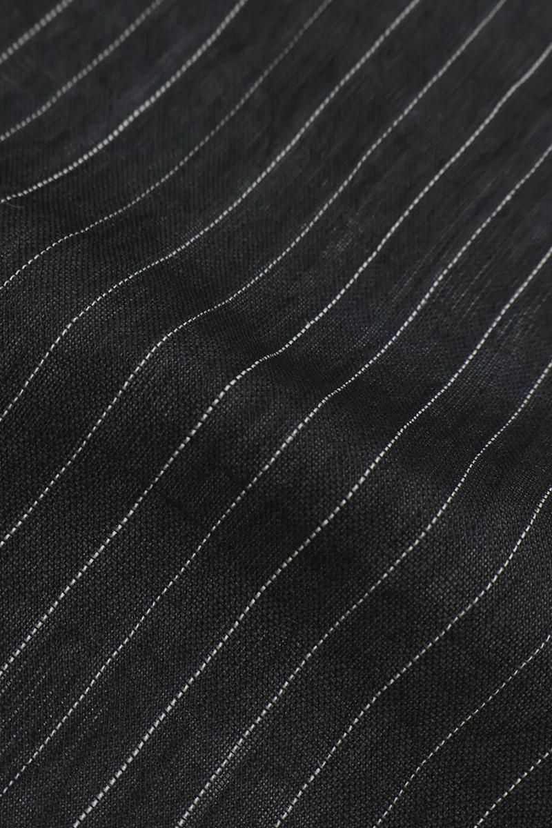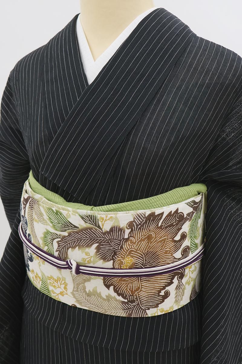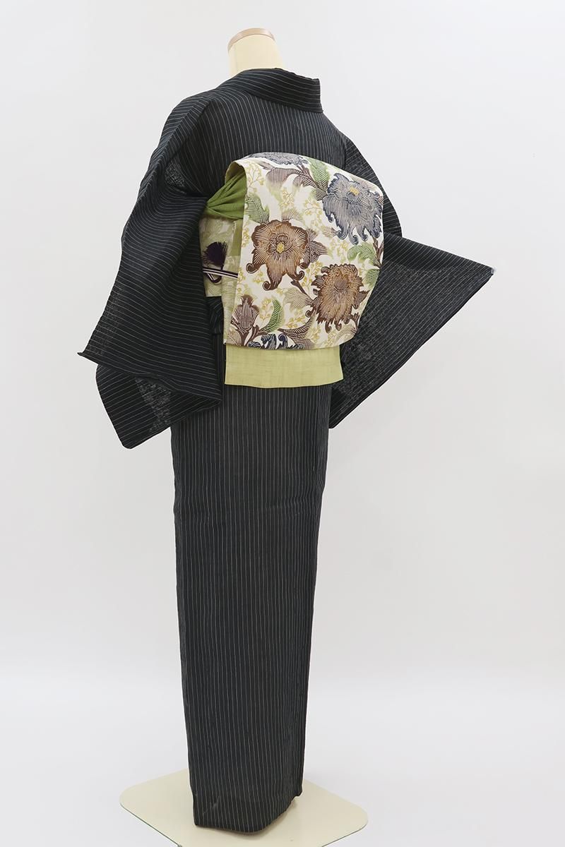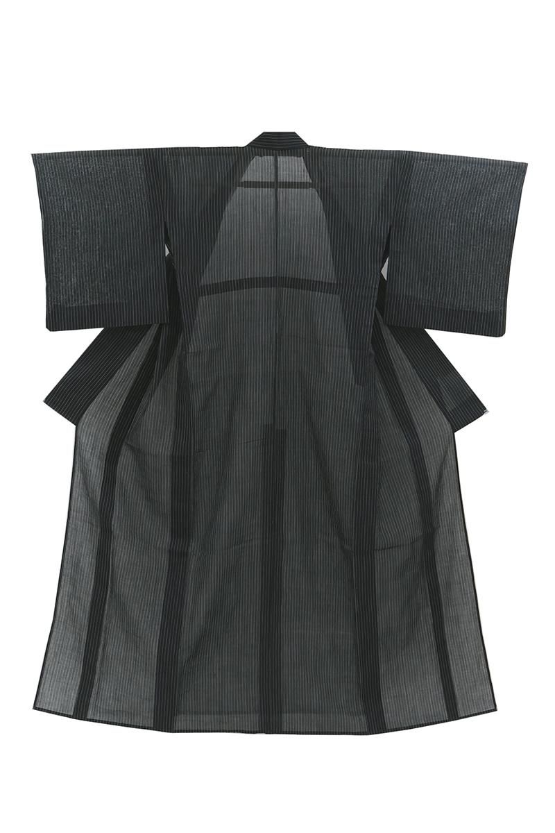 暑い夏にも安心なお手入れのしやすさ、そして細やかなしぼから生まれるさらりとした快適な着心地から、暑い夏の季節には手放せない小千谷縮の着物です。湿度の高い日本の夏には麻の質感がとても心地良いものですが、細やかなシボがさらりとした肌触りを生む麻縮なら、涼感もひとしおですね。こちらは黒色の地に細縞を配したお品、シンプルな色柄ですので帯合わせも自在、きりりと引き締まった小粋な装いをお楽しみいただけることと思います。この夏のお支度にいかがでしょうか。