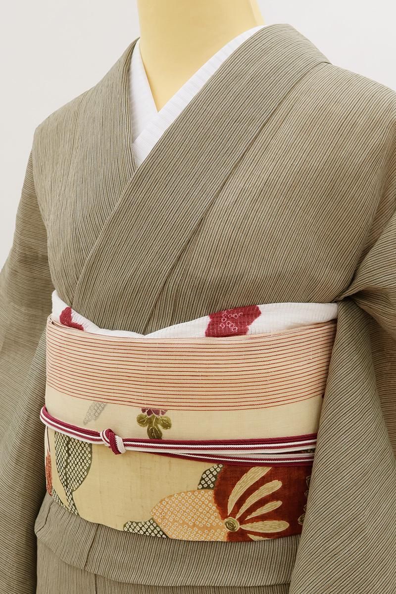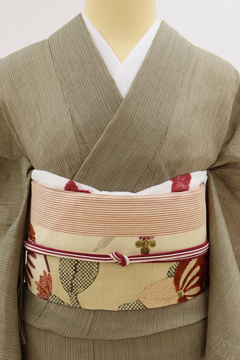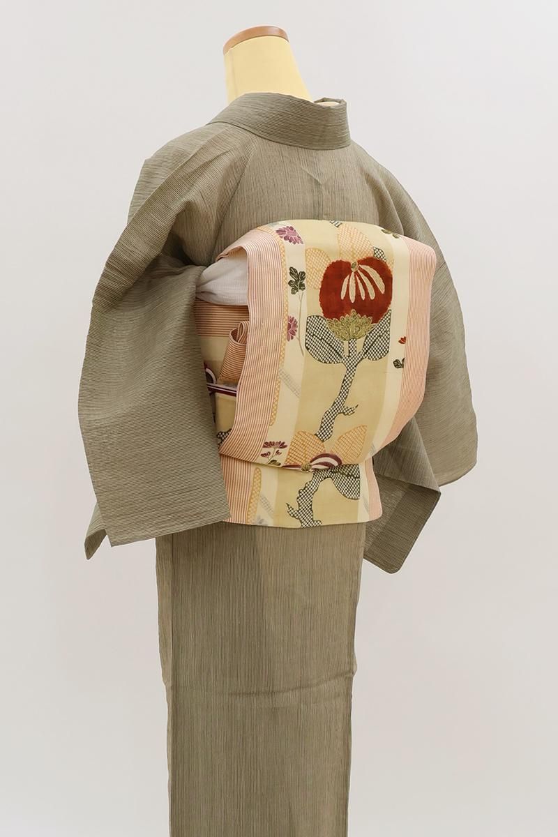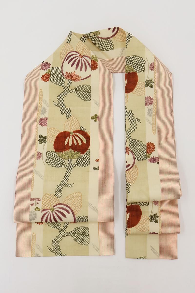 象牙色が近いでしょうか、ナチュラルなベージュの麻地の両端に赤色で竪縞を配し、おおらかな橘の図を描いた名古屋帯です。こちらは摺型友禅の名門として良く知られる京都多ち花さんのお品、小袖などの影響色濃い、クラシカルな意匠ですが、京染めらしいはんなりと艶やかな彩りが力強い個性はそのままに、上品な華やぎを添えていますね。洗練された趣味性豊かな装いをいかがでしょうか。