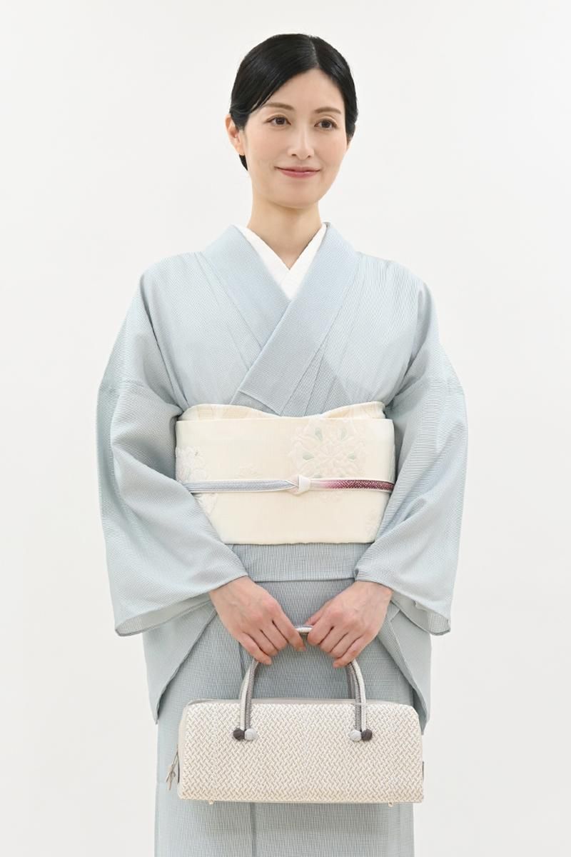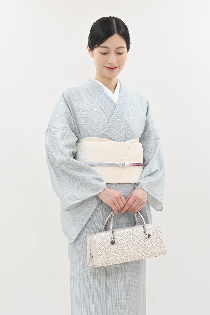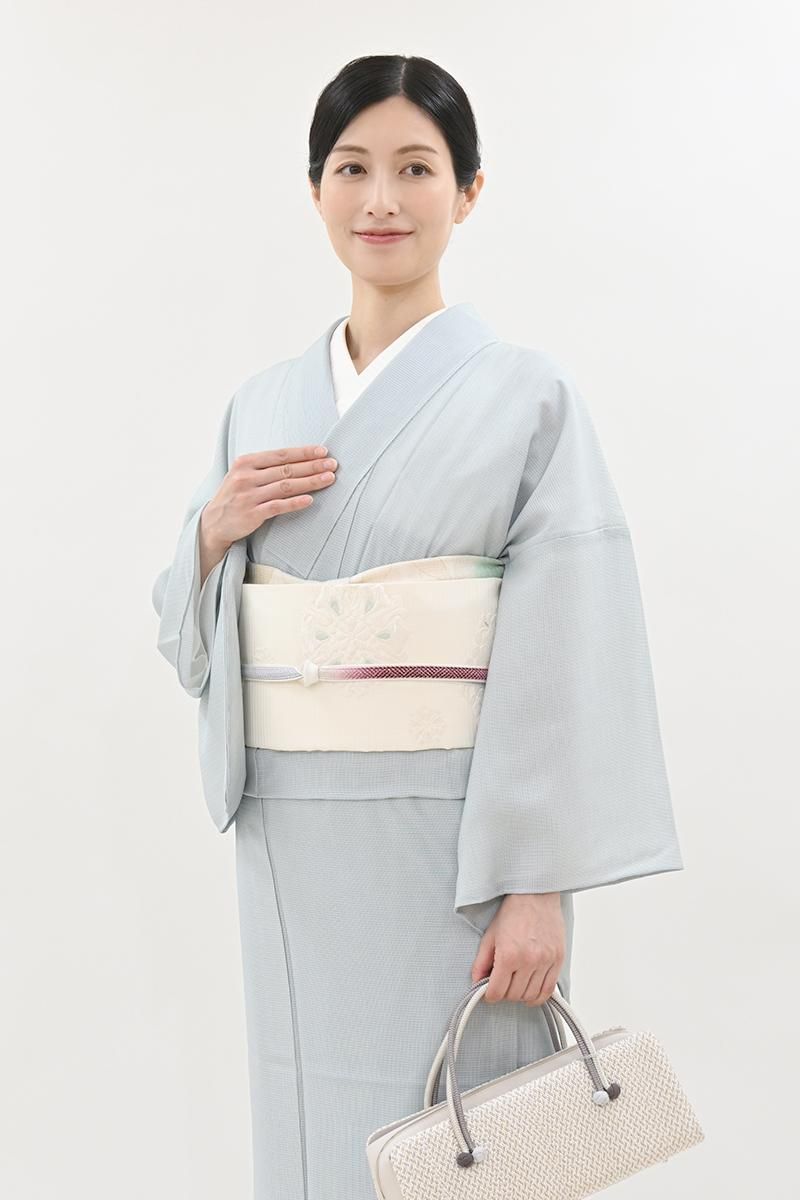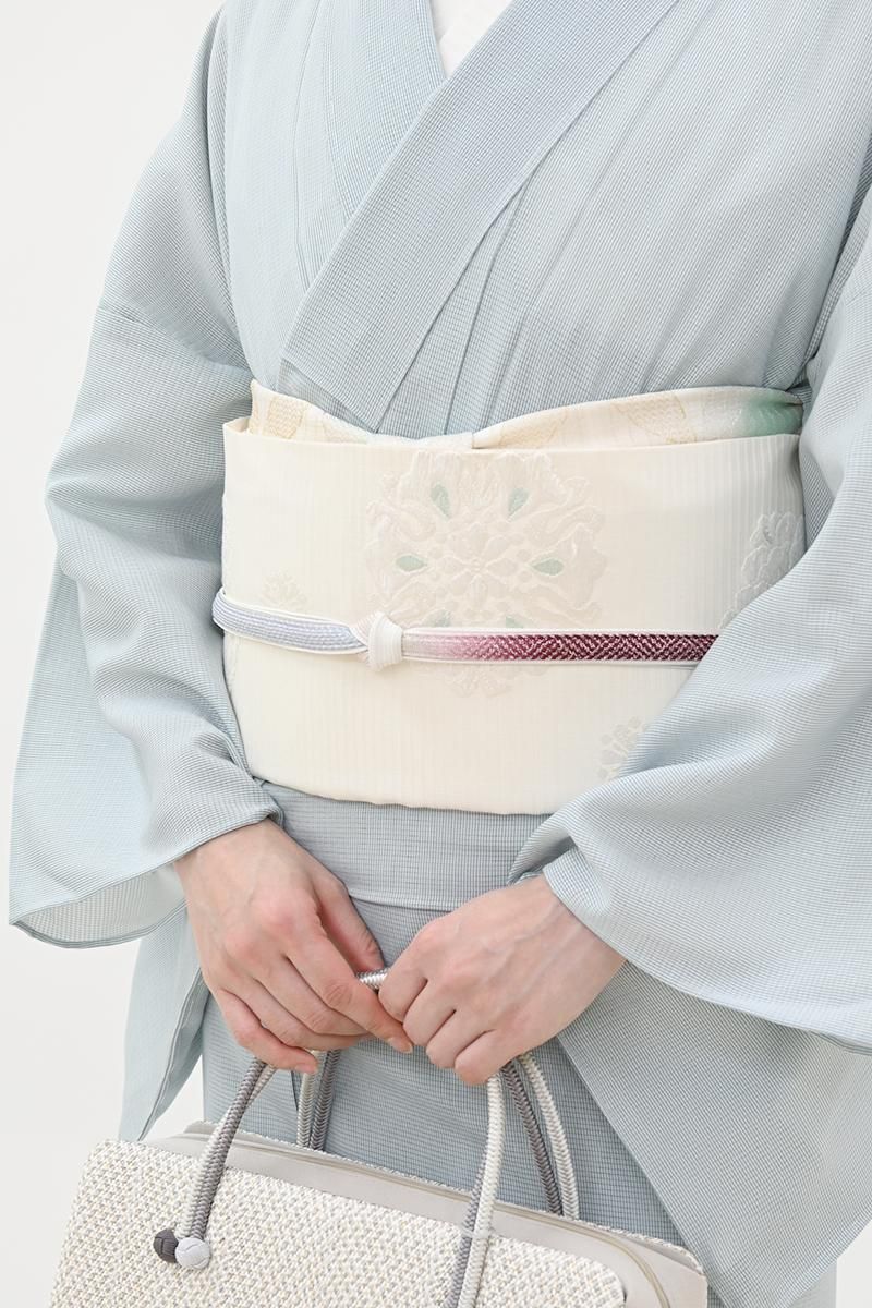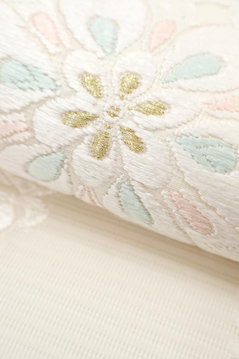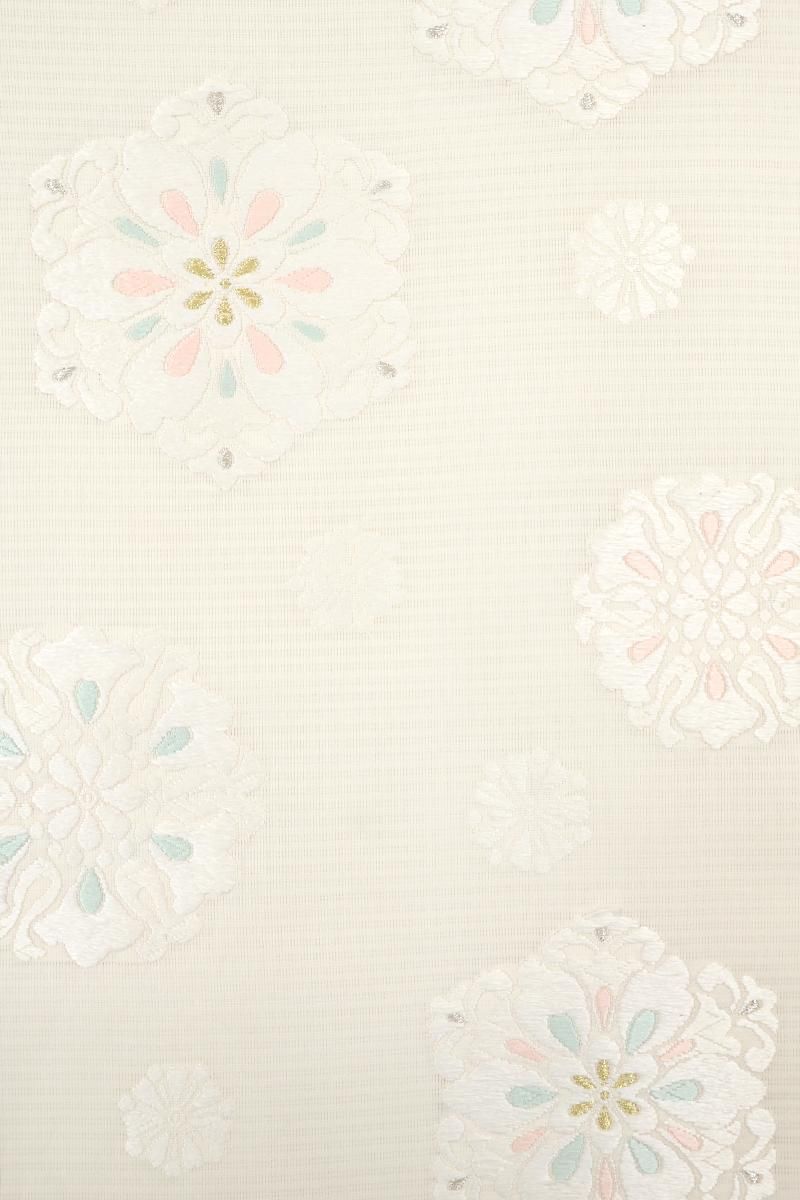 さっくりとした地風に、白色を基調としてふっくらとした織りで表現されたモチーフが楚々とした雰囲気のお品、パステルカラーや金銀糸が優しい華やぎを添え、大人の女性らしい上品な装いを演出してくれることと思います。色無地や付下げ、訪問着などに合わせて、お茶席などの改まったお席にいかがでしょうか。